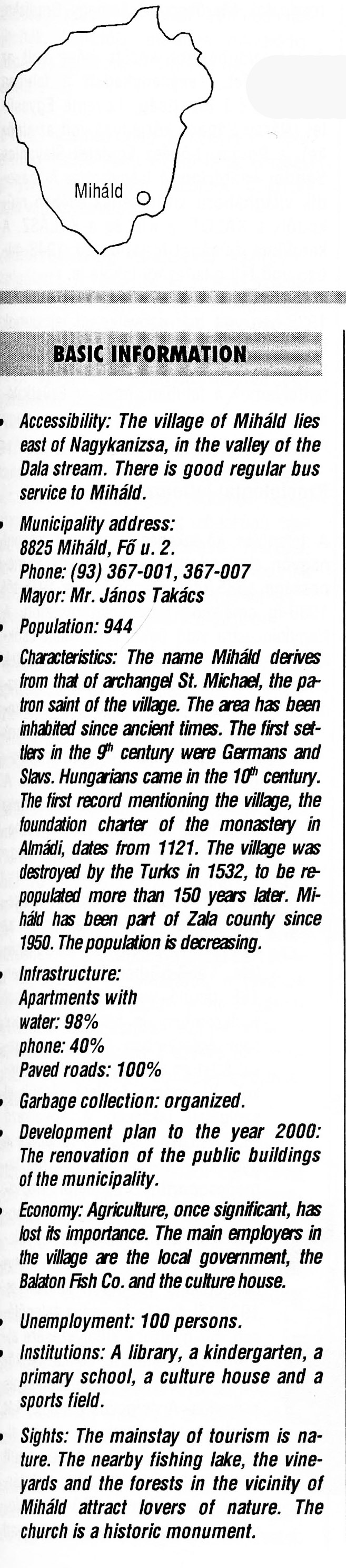Nyilvános 2171 | 5839 | Miháld | BASIC INFORMATION Accessibility: The village of Miháld lies east of Nagykanizsa, in the valley of the Dola stream. There is good regular bus service to Miháld. Municipality address: 8825 Miháld, Fő u. 2. Phone: (93) 367-001, 367-007 Mayor: Mr. János Takács Population: 944 Characteristics: The name Miháld derives from that of archangel St. Michael, the patron saint of the village. The area has been inhabited since ancient times. The first settlers in the 9th century were Germans and Slavs. Hungarians came in the 10th century. The first record mentioning the village, the foundation charter of the monastery in Almádi, dates from 1121. The village was destroyed by the Turks in 1532, to be repopulated more than 150 years later. Miháld has been part of Zala county since 1950. The population is decreasing. Infrastructure: Apartments with water: 98% phone: 40% Paved roads: 100% Garbage collection: organized. Development plan to the year 2000: The renovation of the public buildings of the municipality. Economy: Agriculture, once significant, has lost its importance. The main employers in the village are the local government, the Balaton Fish Co. and the culture house. Unemployment: 100 persons. Institutions: A library, a kindergarten, a primary school, a culture house and a sports field. Sights: The mainstay of tourism is nature. The nearby fishing lake, the vineyards and the forests in the vicinity of Miháld attract lovers of nature. The church is a historic monument. This text came from the following book: Title: Handbook of Zala county (Zala megye kézikönyve) Series: County handbooks of Hungary (Magyarország megyei kézikönyvei) Chief editor: Hóbor József Publisher: (Hatvan), CEBA-Hungary Ltd, 1998 ETO: 908.439.121(035) ; 050.8(439.121) ISBN: 963-9089-18-2 Pages: 488-1040 p. Remark: Closed on: 1998. márc. 31. |