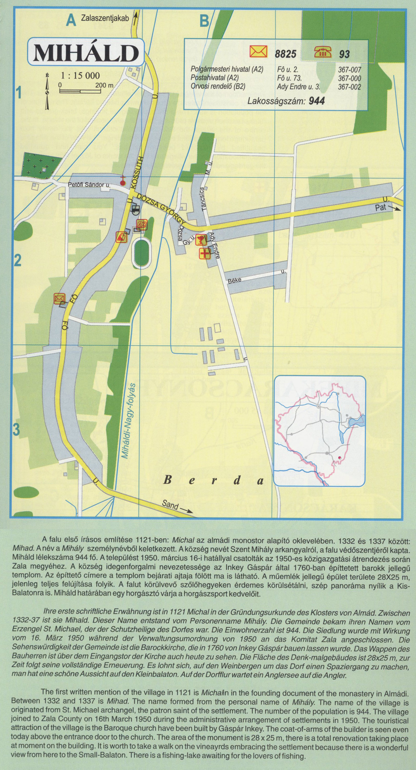 Nyilvános 2235 | 8216 | MIHÁLD | A falu első írásos említése 1121-ben: Michal az almádi monostor alapító oklevelében. 1332 és 1337 között: Mihad. A név a Mihály személynévből keletkezett. A község nevét Szent Mihály arkangyalról, a falu védőszentjéről kapta. Miháld lélekszáma 944 fő. A települést 1950. március 16-i hatállyal csatolták az 1950-es közigazgatási átrendezés során Zala megyéhez. A község idegenforgalmi nevezetessége az Inkey Gáspár által 1760-ban építtetett barokk jellegű templom. Az építtető címere a templom bejárati ajtaja fölött ma is látható. A műemlék jellegű épület területe 28X25 m, jelenleg teljes felújítása folyik. A falut körülvevő szőlőhegyeken érdemes körülsétálni, szép panoráma nyílik a Kis-Balatonra is. Miháld határában egy horgásztó várja a horgászsport kedvelőit. Ihre erste schriftliche Erwähnung ist in 1121 Michal in der Gründungsurkunde des Klosters von Almád. Zwischen 1332-37 ist sie Mihald. Dieser Name entstand vom Personenname Mihály. Die Gemeinde bekam ihren Namen vom Erzengel St. Michael, der der Schutzheilige des Dorfes war. Die Einwohnerzahl ist 944. Die Siedlung wurde mit Wirkung vom 16. März 1950 während der Verwaltungsumordnung von 1950 an das Komitat Zala angeschlossen. Die Sehenswürdigkeit der Gemeinde ist die Barockkirche, die in 1760 von Inkey Gáspár bauen lassen wurde. Das Wappen des Bauherren ist über dem Eingangstor der Kirche auch heute zu sehen. Die Fläche des Denk-malgebäudes ist 28x25 m, zur Zeit folgt seine vollständige Erneuerung. Es lohnt sich, auf den Weinbergen um das Dorf einen Spaziergang zu machen, man hat eine schöne Aussicht auf den Kleinbalaton. Auf der Dorfflur wartet ein Anglersee auf die Angler. The first written mention of the village in 1121 is Michalin in the founding document of the monastery in Almádi. Between 1332 and 1337 is Mihad. The name formed from the personal name of Mihály. The name of the village is originated from St. Michael archangel, the patron saint of the settlement. The number of the population is 944. The village joined to Zala County on 16th March 1950 during the administrative arrangement of settlements in 1950. The touristical attraction of the village is the Baroque church have been built by Gáspár Inkey. The coat-of-arms of the builder is seen even today above the entrance door to the church. The area of the monument is 28 x 25 m, there is a total renovation taking place at moment on the building. It is worth to take a walk on the vineayrds embracing the settlement because there is a wonderful view from here to the Small-Balaton. There is a fishing-lake awaiting for the lovers of fishing. A részlet a következő kiadványból származik/Die Teile stammen vom volgenden Buch/This text came from the following book: Cím/Titel/Title: Zala megye településeinek atlasza - 257 település részletes térképe/Atlas der Komitat Zala - 257 Detailte Siedlungskarten/Zala county\'s Atlas - 257 settlement maps. Közreműködő/contributor: Lackner László (1943) (fotó) Kiadás/Ausgabe/Publisher: Gyula : HISZI-MAP, 1997 Sorozat/Serie/Series: Indulástól - megérkezésig... ETO: 912(439.121-2) ; 908.439.121 Cutter: Z 19 ISBN: 963-610-025-4 Oldalszám/Seiten/Pages: 323, 81 p. Megjegyzés/Note: Lezárva/Abgeschlossen am/Closed am: 1997. máj. 30. |
