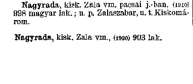 Nyilvános 1886 | 5111 | Nagyrada | kisk. Zala vm. pacsai j. -ban, (1910) 998 magyar lak.; u. p. Zalaszabar, u. t. Kiskomárom. Nagyrada kisk. Zala vm., (1920) 903 lak. Cím: Révai nagy lexikona Alcím: az ismeretek enciklopédiája Kiadás: Budapest : Révai testvérek, [1911]- Kötetei: 1. köt., A - Arany 2. köt., Arány - Beke 3. köt., Béke - Brutto 4. köt., Bratus - Csát 5. köt., Csata - Duc 6. köt., Duc - Etele 7. köt., Stelka - Földöv 8. köt., Földpálya - Gres 9. köt., Gréc - Herold 10. köt., Hérold - Jób 11. köt., Jób - Nontur 12. köt., Kontúr - Lovas 13. köt., Lovas - Mons 14. köt., Mens - Ottó 15. köt., Ottó - Racine 16. köt., Racine - Sodoma 17. köt., Sodoma - Tarján 18. köt., 19. köt., Vár - Zsüri | Kiegészítés Aachen - Beöthy 20. köt., Kiegészítés: Bér - Zsolt ETO jelzet: 03=945.11 Szakjelzet: 030 Cutter: R 62 Nyelv: magyar |