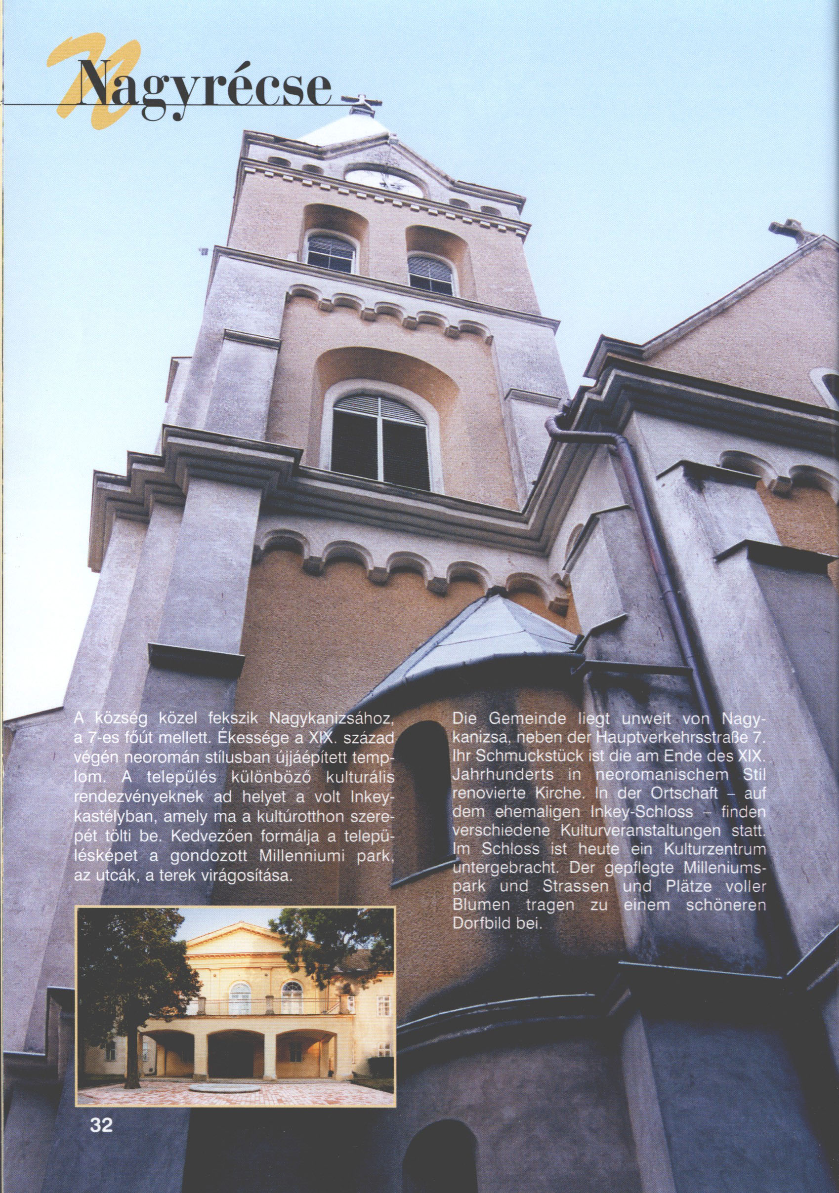 Nyilvános 2231 | 5876 | Nagyrécse | Die Gemeinde liegt unweit von Nagykanízsa, neben der Hauptverkehrsstraße 7. Ihr Schmuckstück ist die am Ende des XIX. Jahrhunderts in neoromanischem Stil renovierte Kirche. In der Ortschaft - auf dem ehemaligen Inkey-Schloss - finden verschiedene Kulturveranstaltungen statt. Im Schloss ist heute ein Kulturzentrum untergebracht. Der gepflegte Milleniums-park und Strassen und Plätze voller Blumen tragen zu einem schöneren Dorfbild bei. Dieses Text stammt von: Titel: Hívogató a Régiók Kapujában - Útikönyv Látnivalók Nagykanizsán és Térségében (Einladend in dem Tor des Gebiets - Reisebuch - Sehenswürdigkeiten in Nagykanizsa und Umgebung) Herausgegeben von: Nagykanizsa és a Környező Települések Területfejlesztési Társulása (Verein für Gebietsentwicklung in Nagykanizsa und in ihrer Umgebung) 8800 Nagykanizsa, Petőfi Sándor út 5. Tel.: 06 93/536-453 • 06 93/536-454 Tel ./Fax: 06 93/326-323 E-mail: terstars@axelero.hu www.kanizsaterseg.celodin.hu |