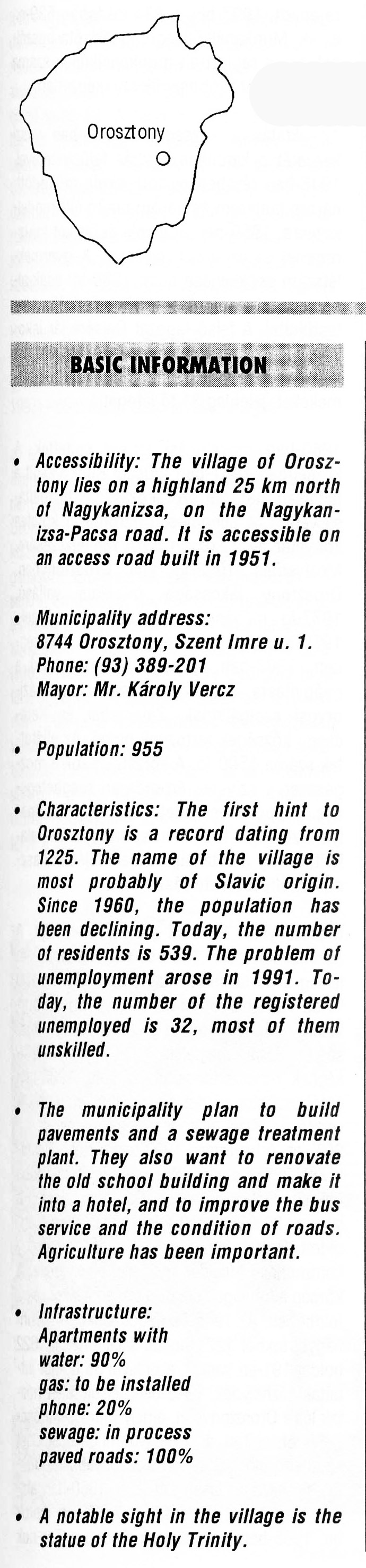 Nyilvános 2486 | 15103 | Orosztony | BASIC INFORMATION Accessibility: The village of Orosztony lies on a highland 25 km north of Nagykanizsa, on the Nagykanizsa-Pacsa road. It is accessible on an access road built in 1951. Municipality address: 8744 Orosztony, Szent Imre u. 1. Phone: (93) 389-201 Mayor: Mr. Károly Vercz Population: 955 Characteristics: The first hint to Orosztony is a record dating from 1225. The name of the village is most probably of Slavic origin. Since 1960, the population has been declining. Today, the number ot residents is 539. The problem of unemployment arose in 1991. Today, the number of the registered unemployed is 32, most of them unskilled. The municipality plan to build pavements and a sewage treatment plant. They also want to renovate the old school building and make it into a hotel, and to improve the bus service and the condition of roads. Agriculture has been important. Infrastructure: Apartments with water: 90% gas: to be installed phone: 20% sewage: in process paved roads: 100% A notable sight in the village is the statue of the Holy Trinity. This text came from the following book: Title: Handbook of Zala county (Zala megye kézikönyve) Series: County handbooks of Hungary (Magyarország megyei kézikönyvei) Chief editor: Hóbor József Publisher: (Hatvan), CEBA-Hungary Ltd, 1998 ETO: 908.439.121(035) ; 050.8(439.121) ISBN: 963-9089-18-2 Pages: 488-1040 p. Remark: Closed on: 1998. márc. 31. |