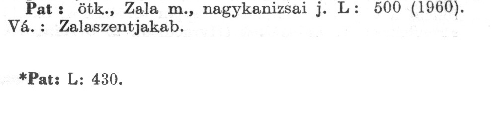Nyilvános 2271 | 5355 | A szócikkek felismertetett szövege: | (A csillag után az 1972-es kiadású kiegészítő kötetből származó szöveg következik) Pat: ötk., Zala m., nagykanizsai j. L : 500 (1960). Vá.: Zalaszentjakab. *Pat: L: 430. A szócikkek a következő lexikonból származnak: Cím: Új magyar lexikon Közreműködő: Berei Andor (1900-1979) (szerk.) Szerz. közl.: [szerk. Berei Andor et al.] Kiadás jelzés: 2. lny. Kiadás: Budapest : Akad. K., 1961-1962 Kötetei: 1., A - C 2., D - F 3., G - J 4., K - Me 5., Mf - R 6., S - Z 7. köt., A-Z Kiegészítő kötet (1972) Kiegészítő kötet, 1962÷1980 (1981) ETO jelzet: 03=945.11 Szakjelzet: 030 Cutter: U 28 Nyelv: magyar Megjegyzés: Bibliogr. a címszavak egy részének végén |