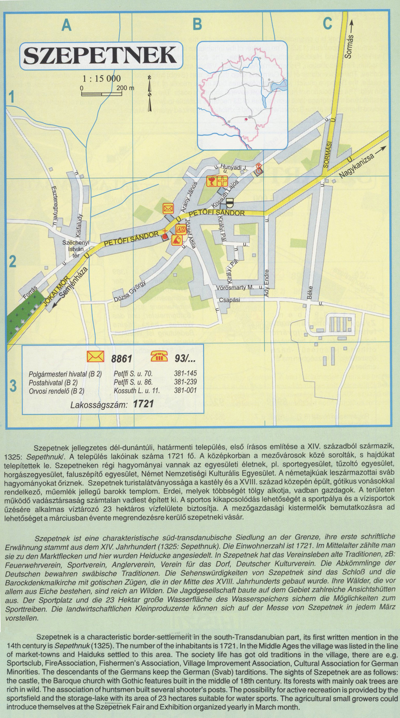 Nyilvános 1993 | 14536 | Szepetnek | Szepetnek jellegzetes dél-dunántúli, határmenti település, első írásos említése a XIV. századból származik, 1325: Sepethnukl. A település lakóinak száma 1721 fő. A középkorban a mezővárosok közé sorolták, s hajdúkat telepítettek le. Szepetneken régi hagyományai vannak az egyesületi életnek, pl. sportegyesület, tűzoltó egyesület, horgászegyesület, faluszépítő egyesület, Német Nemzetiségi Kulturális Egyesület. A németajkúak leszármazottai sváb hagyományokat őriznek. Szepetnek turistalátványossága a kastély és a XVIII. század közepén épült, gótikus vonásokkal rendelkező, műemlék jellegű barokk templom. Erdei, melyek többségét tölgy alkotja, vadban gazdagok. A területen működő vadásztársaság számtalan vadlest épített ki. A sportos kikapcsolódás lehetőségét a sportpálya és a vízisportok űzésére alkalmas víztározó 23 hektáros vízfelülete biztosítja. A mezőgazdasági kistermelők bemutatkozására ad lehetőséget a márciusban évente megrendezésre kerülő szepetneki vásár. Szepetnek ist eine charakteristische süd-transdanubische Siedlung an der Grenze, ihre erste schriftliche Erwähnung stammt aus dem XIV. Jahrhundert (1325: Sepethnuk), Die Einwohnerzahl ist 1721. Im Mittelalter zählte man sie zu den Marktflecken und hier wurden Heiducke angesiedelt. In Szepetnek hat das Vereinsleben alte Traditionen, zB: Feuerwehrverein, Sportverein, Anglerverein, Verein für das Dorf, Deutscher Kulturverein. Die Abkömmlinge der Deutschen bewahren swäbische Traditionen. Die Sehenswürdigkeiten von Szepetnek sind das Schloß und die Barockdenkmalkirche mit gotischen Zügen, die in der Mitte des XVIII. Jahrhunderts gebaut wurde. Ihre Wälder, die vor allem aus Eiche bestehen, sind reich an Wilden. Die Jagdgesellschaft baute auf dem Gebiet zahlreiche Ansichtshütten aus. Der Sportplatz und die 23 Hektar große Wasserfläche des Wasserspeichers sichern die Möglichkeiten zum Sporttreiben. Die landwirtschaftlichen Kleinproduzente können sich auf der Messe von Szepetnek in jedem März vorstellen. Szepetnek is a characteristic border-settlement in the south-Transdanubian part, its first written mention in the 14th century is Sepethnuk(1325). The number of the inhabitants is 1721. In the Middle Ages the village was listed in the line of market-towns and Haiduks settled to this area. The society life has got old traditions in the village, there are e.g. Sportsclub, FireAssociation, Fishermen\'s Association, Village Improvement Association, Cultural Association for German Minorities. The descendants of the Germans keep the German (Svab) tarditions. The sights of Szepetnek are as follows: the castle, the Baroque church with Gothic features built in the middle of 18th century. Its forests with mainly oak trees are rich in wild. The association of huntsmen built several shooter\'s posts. The possibility for active recreation is provided by the sportsfield and the storage-lake with its area of 23 hectares suitable for water sports. The agricultural small growers could introduce themselves at the Szepetnek Fair and Exhibition organized yearly in March month. A részlet a következő kiadványból származik/Die Teile stammen vom volgenden Buch/This text came from the following book: Cím/Titel/Title: Zala megye településeinek atlasza - 257 település részletes térképe/Atlas der Komitat Zala - 257 Detailte Siedlungskarten/Zala county\'s Atlas - 257 settlement maps. Közreműködő/contributor: Lackner László (1943) (fotó) Kiadás/Ausgabe/Publisher: Gyula : HISZI-MAP, 1997 Sorozat/Serie/Series: Indulástól - megérkezésig... ETO: 912(439.121-2) ; 908.439.121 Cutter: Z 19 ISBN: 963-610-025-4 Oldalszám/Seiten/Pages: 323, 81 p. Megjegyzés/Note: Lezárva/Abgeschlossen am/Closed am: 1997. máj. 30. |