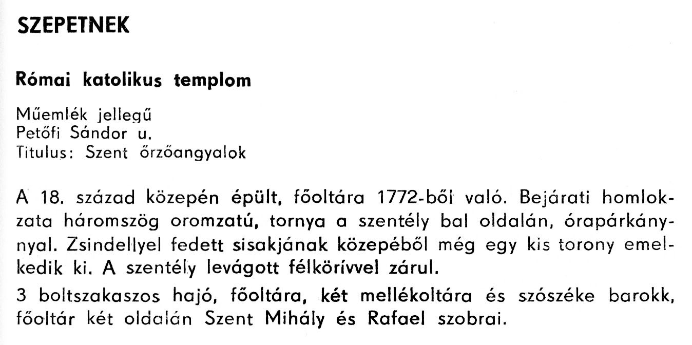 Nyilvános 1613 | 3218 | Szepetnek - Zala megye műemlékei 1979 103old | A részlet szövege: SZEPETNEK Római katolikus templom Műemlék jellegű Petőfi Sándor u. Titulus: Szent őrzőangyalok A 18. század közepén épült, főoltára 1772-ből való. Bejárati homlokzata háromszög oromzatú, tornya a szentély bal oldalán, órapárkánnyal. Zsindellyel fedett sisakjának közepéből még egy kis torony emelkedik ki. A szentély levágott félkörívvel zárul. 3 boltszakaszos hajó, főoltára, két mellékoltára és szószéke barokk, főoltár két oldalán Szent Mihály és Rafael szobrai. A részlet a következő könyvből származik: Cím: Zala megye műemlékei Szerző: Németh József (1928) Közreműködő: Vándor László (szerk.) ; Szabóky Zsolt (1941) (fotó) Szerz. közl.: Németh József ; [szerk. Vándor László] ; [fotók... Szabóky Zsolt] Kiadás jelzés: 2. bőv. kiad. Kiadás: Zalaegerszeg : Zalai Ny., 1979 ETO jelzet: 72(439.121) ; 7.025.3/.4(439.121) ; 908.439.121 Tárgyszó: Zala Szakjelzet: 908 Cutter: N 53 Nyelv: magyar Oldalszám: 134 p. |