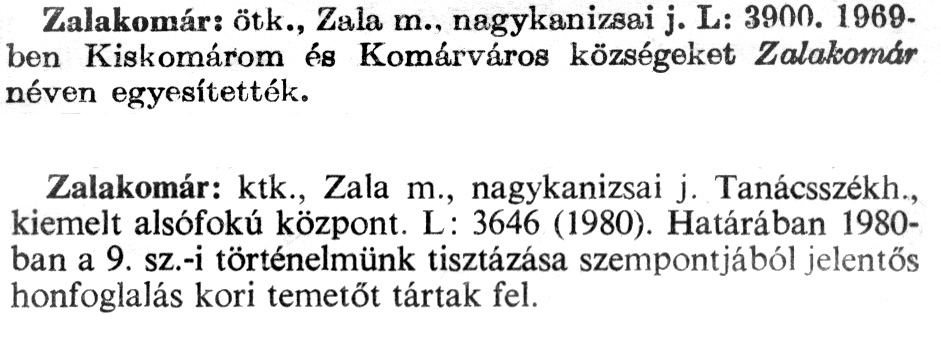 Nyilvános 1805 | 5184 | A szócikkek felismertetett szövege: | (A második szócikk az 1981-es kiadású kiegészítő kötetből származik) Zalakomár: ötk., Zala m., nagykanizsai j. L: 3900. 1969-ben Kiskomárom és Komárváros községeket Zalakomár néven egyesítették. Zalakomár: ktk., Zala m., nagykanizsai j. Tanácsszékh., kiemelt alsófokú központ. L: 3646 (1980). Határában 1980-ban a 9. sz.-i történelmünk tisztázása szempontjából jelentős honfoglalás kori temetőt tártak fel. A szócikkek a következő lexikonból származnak: Cím: Új magyar lexikon Közreműködő: Berei Andor (1900-1979) (szerk.) Szerz. közl.: [szerk. Berei Andor et al.] Kiadás jelzés: 2. lny. Kiadás: Budapest : Akad. K., 1961-1962 Kötetei: 1., A - C 2., D - F 3., G - J 4., K - Me 5., Mf - R 6., S - Z 7. köt., A-Z Kiegészítő kötet (1972) Kiegészítő kötet, 1962÷1980 (1981) ETO jelzet: 03=945.11 Szakjelzet: 030 Cutter: U 28 Nyelv: magyar Megjegyzés: Bibliogr. a címszavak egy részének végén |