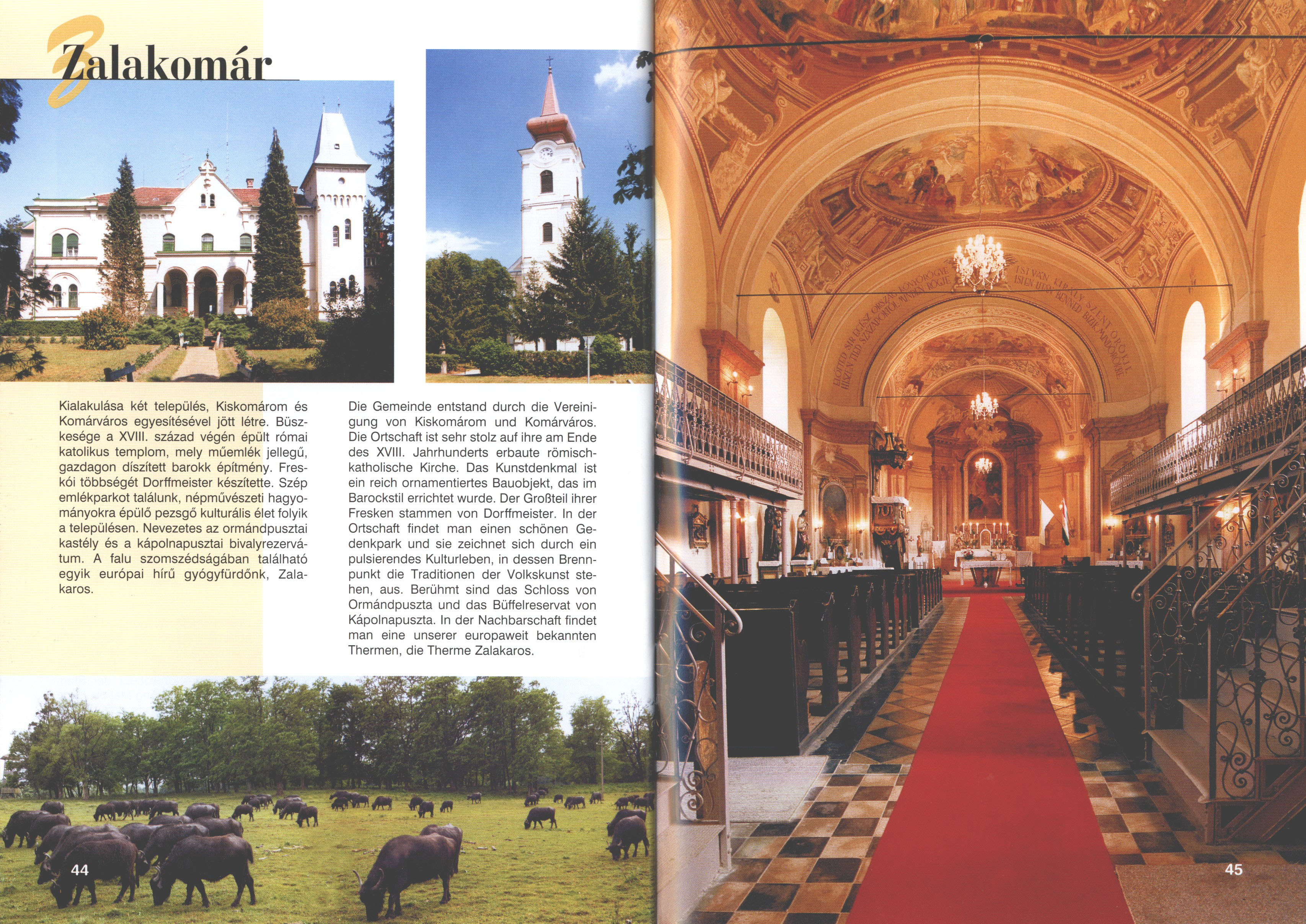 Nyilvános 1879 | 6174 | Zalakomár | Die Gemeinde entstand durch die Vereinigung von Kiskomárom und Komárváros. Die Ortschaft ist sehr stolz auf ihre am Ende des XVIII. Jahrhunderts erbaute römischkatholische Kirche. Das Kunstdenkmal ist ein reich ornamentiertes Bauobjekt, das im Barockstil errichtet wurde. Der Großteil ihrer Fresken stammen von Dorffmeister. In der Ortschaft findet man einen schönen Gedenkpark und sie zeichnet sich durch ein pulsierendes Kulturleben, in dessen Brennpunkt die Traditionen der Volkskunst stehen, aus. Berühmt sind das Schloss von Ormándpuszta und das Büffelreservat von Kápolnapuszta. In der Nachbarschaft findet man eine unserer europaweit bekannten Thermen, die Therme Zalakaros. Dieses Text stammt von: Titel: Hívogató a Régiók Kapujában - Útikönyv Látnivalók Nagykanizsán és Térségében (Einladend in dem Tor des Gebiets - Reisebuch - Sehenswürdigkeiten in Nagykanizsa und Umgebung) Herausgegeben von: Nagykanizsa és a Környező Települések Területfejlesztési Társulása (Verein für Gebietsentwicklung in Nagykanizsa und in ihrer Umgebung) 8800 Nagykanizsa, Petőfi Sándor út 5. Tel.: 06 93/536-453 • 06 93/536-454 Tel ./Fax: 06 93/326-323 E-mail: terstars@axelero.hu www.kanizsaterseg.celodin.hu |