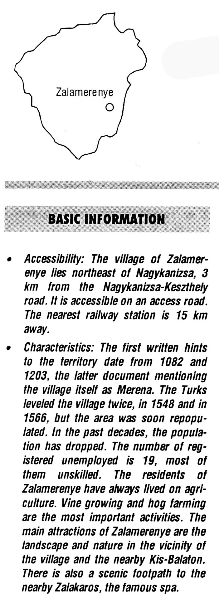 Nyilvános 2056 | 5748 | Zalamerenye | BASIC INFORMATION Accessibility: The village of Zalamerenye lies northeast of Nagykanizsa, 3 km from the Nagykanizsa-Keszthely road. It is accessible on an access road. The nearest railway station is 15 km away. Characteristics: The first written hints to the territory date from 1082 and 1203, the latter document mentioning the village itself as Merena. The Turks leveled the village twice, in 1548 and in 1566, but the area was soon repopu-lated. In the past decades, the population has dropped. The number of registered unemployed is 19, most of them unskilled. The residents of Zalamerenye have always lived on agriculture. Vine growing and hog farming are the most important activities. The main attractions of Zalamerenye are the landscape and nature in the vicinity of the village and the nearby Kis-Balaton. There is also a scenic footpath to the nearby Zalakaros, the famous spa. This text came from the following book: Title: Handbook of Zala county (Zala megye kézikönyve) Series: County handbooks of Hungary (Magyarország megyei kézikönyvei) Chief editor: Hóbor József Publisher: (Hatvan), CEBA-Hungary Ltd, 1998 ETO: 908.439.121(035) ; 050.8(439.121) ISBN: 963-9089-18-2 Pages: 488-1040 p. Remark: Closed on: 1998. márc. 31. |