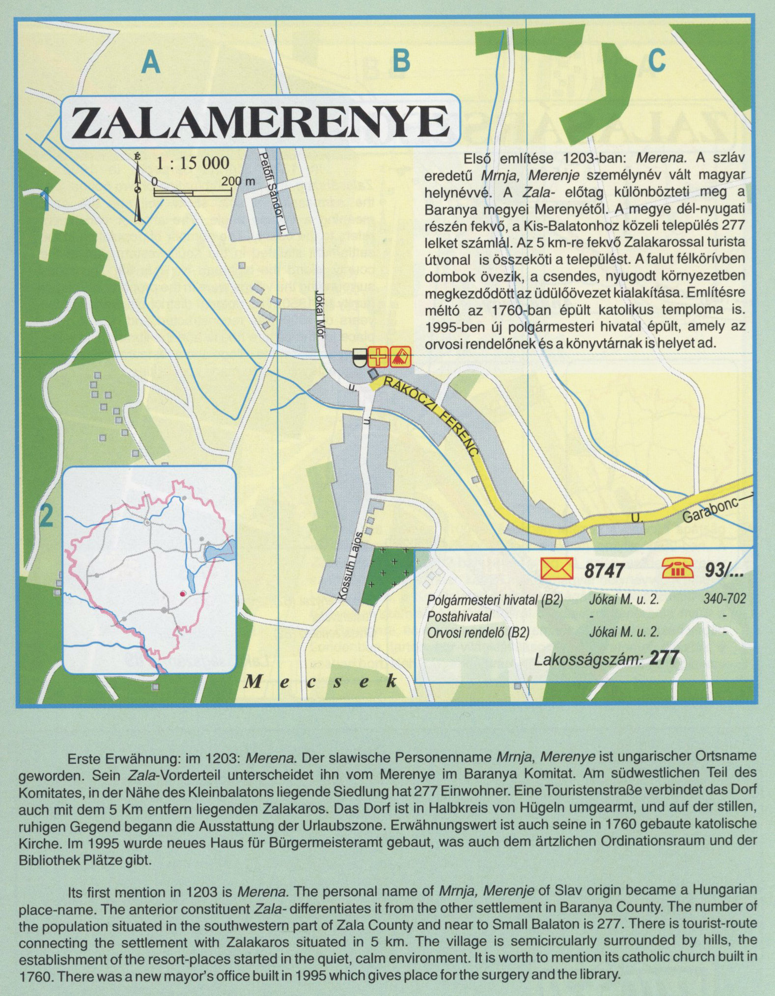 Nyilvános 2145 | 8456 | Zalamerenye | Első említése 1203-ban: Merena. A szláv eredetű Mrnja, Merenje személynév vált magyar helynévvé. A Zala- előtag különbözteti meg a Baranya megyei Merenyétől. A megye dél-nyugati részén fekvő, a Kis-Balatonhoz közeli település 277 lelket számlál. Az 5 km-re fekvő Zalakarossal turista útvonal is összeköti a települést. A falut félkörívben dombok övezik, a csendes, nyugodt környezetben megkezdődött az üdülőövezet kialakítása. Említésre méltó az 1760-ban épült katolikus temploma is. 1995-ben új polgármesteri hivatal épült, amely az orvosi rendelőnek és a könyvtárnak is helyet ad. Erste Erwähnung: im 1203: Merena. Der slawische Personenname Mrnja, Merenye ist ungarischer Ortsname geworden. Sein Zala-Vorderteil unterscheidet ihn vom Merenye im Baranya Komitat. Am südwestlichen Teil des Komitates, in der Nähe des Kleinbalatons liegende Siedlung hat 277 Einwohner. Eine Touristenstraße verbindet das Dorf auch mit dem 5 Km entfern liegenden Zalakaros. Das Dorf ist in Halbkreis von Hügeln umgearmt, und auf der stillen, ruhigen Gegend begann die Ausstattung der Urlaubszone. Erwähnungswert ist auch seine in 1760 gebaute katolische Kirche. Im 1995 wurde neues Haus für Bürgermeisteramt gebaut, was auch dem ärtzlichen Ordinationsraum und der Bibliothek Plätze gibt. Its first mention in 1203 is Merena. The personal name of Mrnja, Merenje of Slav origin became a Hungarian place-name. The anterior constituent Zala- differentiates it from the other settlement in Baranya County. The number of the population situated in the southwestern part of Zala County and near to Small Balaton is 277. There is tourist-route connecting the settlement with Zalakaros situated in 5 km. The village is semicircularly surrounded by hills, the establishment of the resort-places started in the quiet, calm environment. It is worth to mention its catholic church built in 1760. There was a new mayor\'s office built in 1995 which gives place forthe surgery and the library. A részlet a következő kiadványból származik/Die Teile stammen vom volgenden Buch/This text came from the following book: Cím/Titel/Title: Zala megye településeinek atlasza - 257 település részletes térképe/Atlas der Komitat Zala - 257 Detailte Siedlungskarten/Zala county\'s Atlas - 257 settlement maps. Közreműködő/contributor: Lackner László (1943) (fotó) Kiadás/Ausgabe/Publisher: Gyula : HISZI-MAP, 1997 Sorozat/Serie/Series: Indulástól - megérkezésig... ETO: 912(439.121-2) ; 908.439.121 Cutter: Z 19 ISBN: 963-610-025-4 Oldalszám/Seiten/Pages: 323, 81 p. Megjegyzés/Note: Lezárva/Abgeschlossen am/Closed am: 1997. máj. 30. |