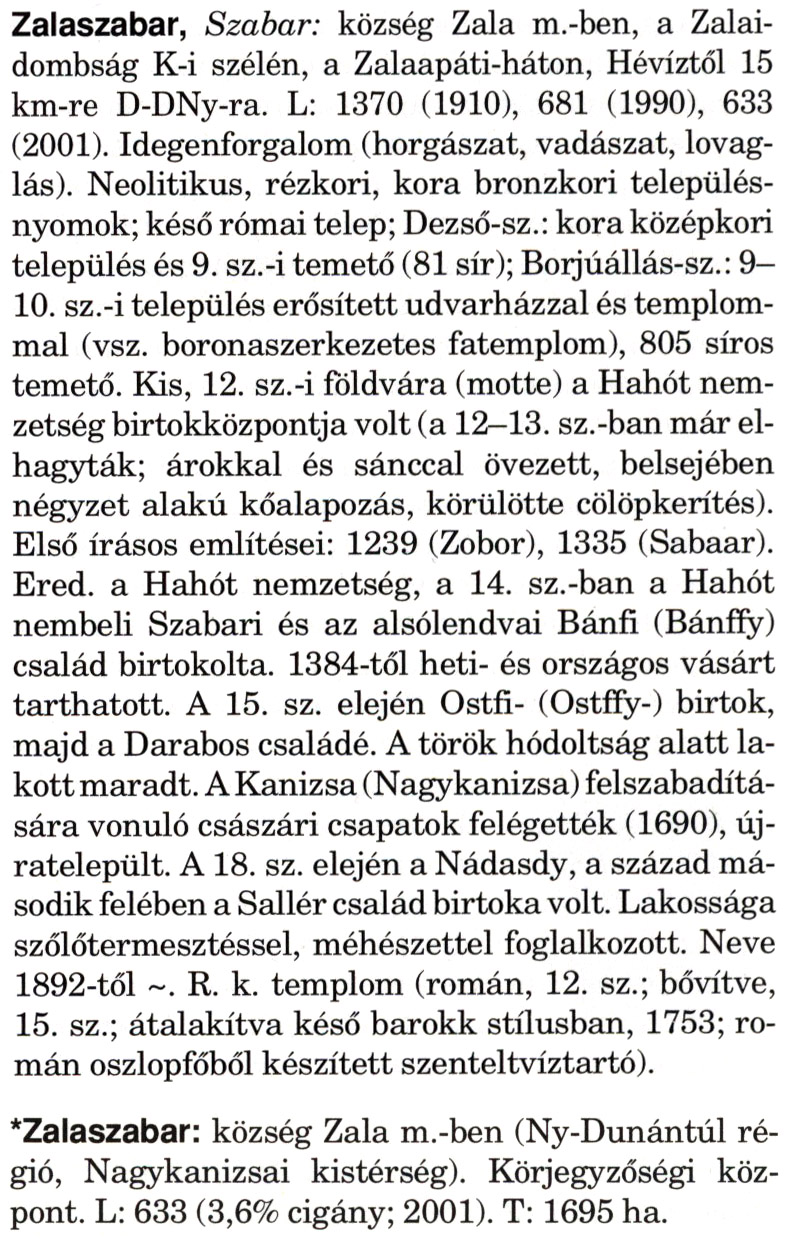 Nyilvános 2175 | 5703 | A szócikkek felismertetett szövege: | (A csillag után a kiegészítő kötetből származó szöveg következik) Zalaszabar, Szabar: község Zala m.-ben, a Zalai-dombság K-i szélén, a Zalaapáti-háton, Hévíztől 15 km-re D-DNy-ra. L: 1370 (1910), 681 (1990), 633 (2001). Idegenforgalom (horgászat, vadászat, lovaglás). Neolitikus, rézkori, kora bronzkori településnyomok; késő római telep; Dezső-sz.: kora középkori település és 9. sz.-i temető (81 sír); Borjúállás-sz.: 9— 10. sz.-i település erősített udvarházzal és templommal (vsz. boronaszerkezetes fatemplom), 805 síros temető. Kis, 12. sz.-i földvára (motte) a Hahót nemzetség birtokközpontja volt (a 12—13. sz.-ban már elhagyták; árokkal és sánccal övezett, belsejében négyzet alakú kőalapozás, körülötte cölöpkerítés). Első írásos említései: 1239 (Zobor), 1335 (Sabaar). Ered. a Hahót nemzetség, a 14. sz.-ban a Hahót nembeli Szabari és az alsólendvai Bánfi (Bánffy) család birtokolta. 1384-től heti- és országos vásárt tarthatott. A 15. sz. elején Ostfi- (Ostffy-) birtok, majd a Darabos családé. A török hódoltság alatt lakott maradt. A Kanizsa (Nagykanizsa) felszabadítására vonuló császári csapatok felégették (1690), újratelepült. A 18. sz. elején a Nádasdy, a század második felében a Sallér család birtoka volt. Lakossága szőlőtermesztéssel, méhészettel foglalkozott. Neve 1892-től ~. R. k. templom (román, 12. sz.; bővítve, 15. sz.; átalakítva késő barokk stílusban, 1753; román oszlopfőből készített szenteltvíztartó). *Zalaszabar: község Zala m.-ben (Ny-Dunántúl régió, Nagykanizsai kistérség). Körjegyzőségi központ. L: 633 (3,6% cigány; 2001). T: 1695 ha. A szócikkek a következő lexikonból származnak: Cím: Magyar nagylexikon Közreműködő: Élesztős László (1949) (szerk.) ; Barabás Éva (1943) (szerk.) ; Berényi Gábor (1946) (szerk.) ; Bárány Lászlóné (szerk.) ; Adelmann-né Kertész Judit (1945) (közrem.) ; Froemel Károlyné Jáky Éva (1936) (közrem.) ; Akadémiai Kiadó és Nyomda Vállala Szerz. közl.: [... Élesztős László főszerk.] ; [szerk. Barabás Éva et al.] ; [bibliogr. Adelmanné Kertész Judit] ; [kész. az Akadémiai Kiadó Magyar Nagylexikon Szerkesztőségében] Kiadás: Budapest : Akad. K., 1993- Kötetei: 1. köt., A - Anc 2. köt., And - Bag 3. köt., Bah - Bij 4. köt., Bik - Bz 5. köt., C - Csem 6. köt., Csen - Ec 7. köt., Ed - Fe 8. köt., Ff - Gyep 9. köt., Gyer - Iq 10. köt., Ir - Kip 11. köt., Kir - Lem 12. köt., Len - Mep 13. köt., Mer - Nyk 14. köt., Nyl - Pom 15. köt., Pon - Sek 16. köt., Sel - Szö 17. köt., Szp - Ung 18. köt., Unh - Z 19. köt., Kiegészítő kötet, A - Z ETO jelzet: 030=945.11 Szakjelzet: 030 Cutter: M 14 ISBN: 963-05-6611-7 [!ISBN 963-05-6615-X] Nyelv: magyar Megjegyzés: Az 5. kötettől kiad. a Magyar Nagylexikon Kiadó ; A 6. kötettől főszerk. Berényi Gábor ; A 6. kötettől szakszerk. Bárány Lászlóné et al. ; A 6. kötettől bibliogr. Froemel Károlyné ; Bibliogr. a szócikkek végén |