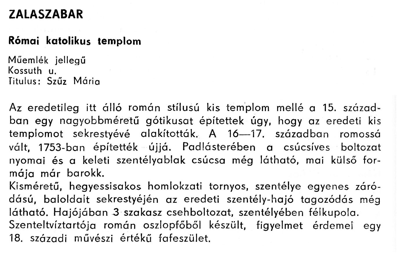 Nyilvános 2031 | 5430 | Zalaszabar - Zala megye műemlékei 1979 119-120old | A részlet szövege: ZALASZABAR Római katolikus templom Műemlék jellegű Kossuth u. Titulus: Szűz Mária Az eredetileg itt álló román stílusú kis templom mellé a 15. században egy nagyobbméretű gótikusat építettek úgy, hogy az eredeti kis templomot sekrestyévé alakították. A 16–17. században romossá vált, 1753-ban építették újjá. Padlásterében a csúcsíves boltozat nyomai és a keleti szentélyablak csúcsa még látható, mai külső formája már barokk. Kisméretű, hegyessisakos homlokzati tornyos, szentélye egyenes záródású, baloldalt sekrestyéjén az eredeti szentély-hajó tagozódás még látható. Hajójában 3 szakasz csehboltozat, szentélyében félkupola. Szenteltvíztartója román oszlopfőből készült, figyelmet érdemel egy 18. századi művészi értékű fafeszület. A részlet a következő könyvből származik: Cím: Zala megye műemlékei Szerző: Németh József (1928) Közreműködő: Vándor László (szerk.) ; Szabóky Zsolt (1941) (fotó) Szerz. közl.: Németh József ; [szerk. Vándor László] ; [fotók... Szabóky Zsolt] Kiadás jelzés: 2. bőv. kiad. Kiadás: Zalaegerszeg : Zalai Ny., 1979 ETO jelzet: 72(439.121) ; 7.025.3/.4(439.121) ; 908.439.121 Tárgyszó: Zala Szakjelzet: 908 Cutter: N 53 Nyelv: magyar Oldalszám: 134 p. |