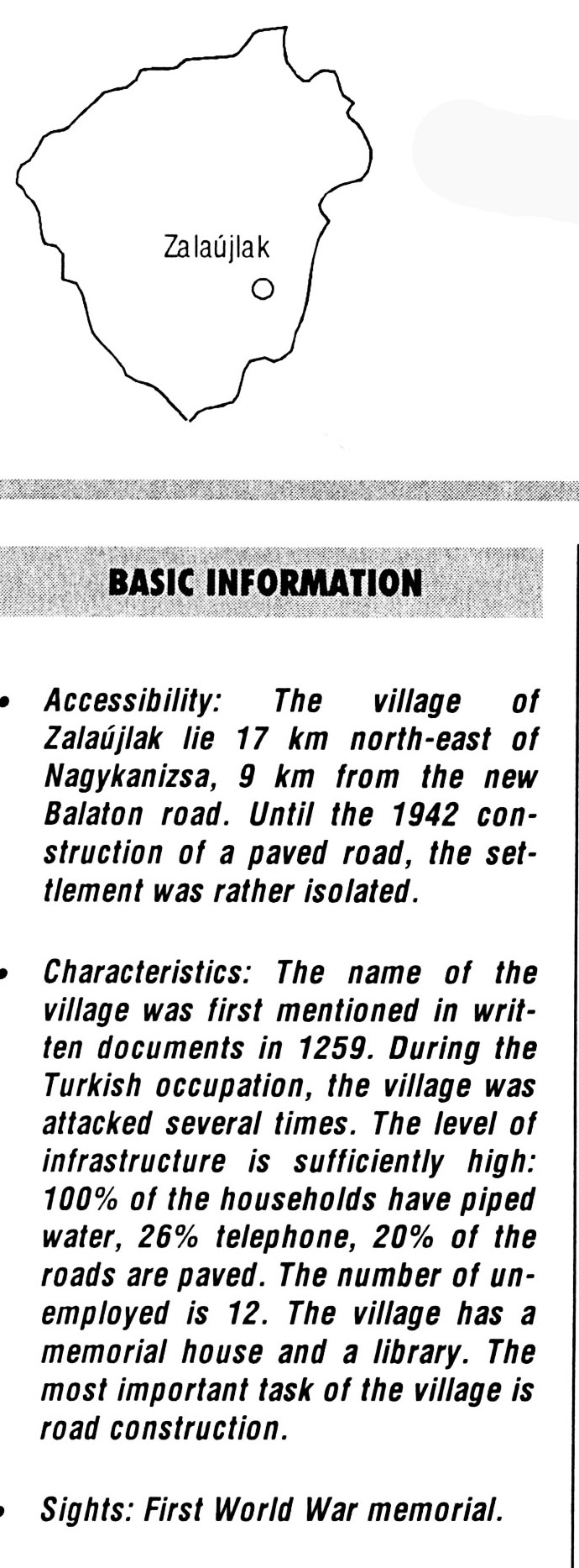 Nyilvános 2094 | 5925 | Zalaújlak | BASIC INFORMATION Accessibility: The village of Zalaújlak lie 17 km north-east of Nagykanizsa, 9 km from the new Balaton road. Until the 1942 construction of a paved road, the settlement was rather isolated. Characteristics: The name of the village was first mentioned in written documents in 1259. During the Turkish occupation, the village was attacked several times. The level of infrastructure is sufficiently high: 100% of the households have piped water, 26% telephone, 20% of the roads are paved. The number of unemployed is 12. The village has a memorial house and a library. The most important task of the village is road construction. Sights: First World War memorial. This text came from the following book: Title: Handbook of Zala county (Zala megye kézikönyve) Series: County handbooks of Hungary (Magyarország megyei kézikönyvei) Chief editor: Hóbor József Publisher: (Hatvan), CEBA-Hungary Ltd, 1998 ETO: 908.439.121(035) ; 050.8(439.121) ISBN: 963-9089-18-2 Pages: 488-1040 p. Remark: Closed on: 1998. márc. 31. |