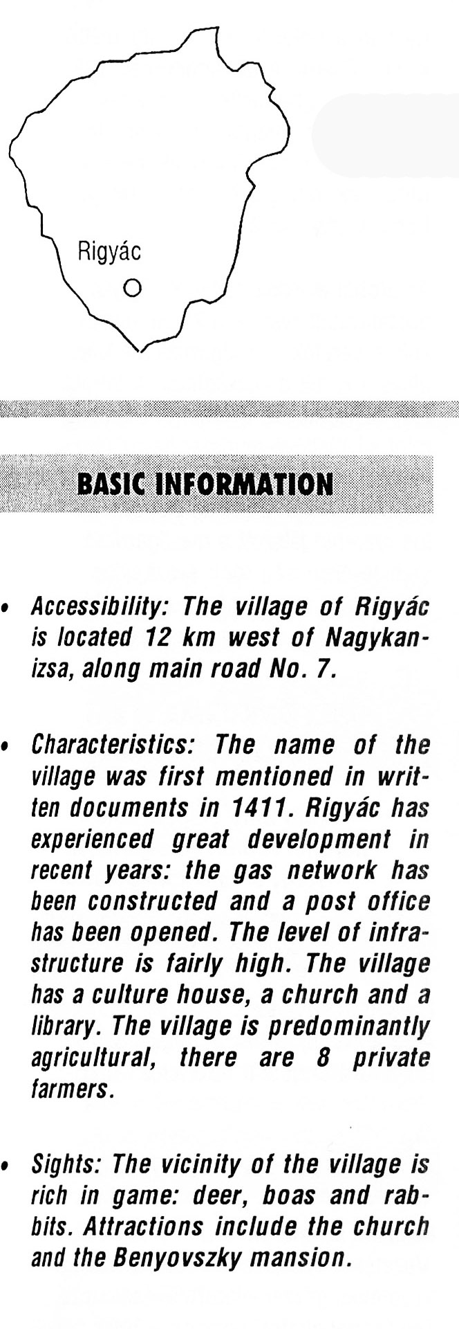 Nyilvános 2180 | 5767 | Rövid leírás | Teljes leírás (1.11 KB) | Rigyác BASIC INFORMATION Accessibility. The village of Rigyác is located 12 km west of Nagykanizsa, along main road No. 7. Characteristics: The name of the village was first mentioned in written documents in 1411. Rigyác has experienced great development in recent years: the gas network has been constructed and a post office has been opened. The level of infrastructure is fairly high. The village has a culture house, a church and a library. The village is predominantly agricultural, there are 8 private farmers. Sights: The vicinity of the village is rich in game: deer, boas and rabbits. Attractions include the church and the Benyovszky mansion. This text came from the following book: Title: Handbook of Zala county (Zala megye kézikönyve) Series: County handbooks of Hungary (Magyarország megyei kézikönyvei) Chief editor: Hóbor József Publisher: (Hatvan), CEBA-Hungary Ltd, 1998 ETO: 908.439.121(035) ; 050.8(439.121) ISBN: 963-9089-18-2 Pages: 488-1040 p. Remark: Closed on: 1998. márc. 31. |