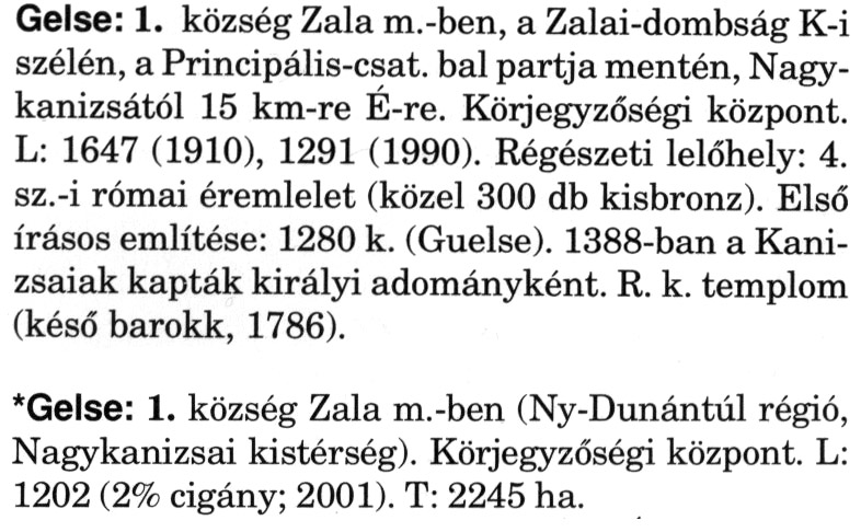 Nyilvános 2190 | 6208 | Rövid leírás | Teljes leírás (2.24 KB) | A szócikkek felismertetett szövege: (A csillag után a kiegészítő kötetből származó szöveg következik) Gelse: 1. község Zala m.-ben, a Zalai-dombság K-i szélén, a Principális-csat, bal partja mentén, Nagykanizsától 15 km-re É-re. Körjegyzőségi központ. L: 1647 (1910), 1291 (1990). Régészeti lelőhely: 4. sz.-i római éremlelet (közel 300 db kisbronz). Első írásos említése: 1280 k. (Guelse). 1388-ban a Kanizsaiak kapták királyi adományként. R. k. templom (késő barokk, 1786). *Gelse: 1. község Zala m.-ben (Ny-Dunántúl régió, Nagykanizsai kistérség). Körjegyzőségi központ. L: 1202 (2% cigány; 2001). T: 2245 ha. A szócikkek a következő lexikonból származnak: Cím: Magyar nagylexikon Közreműködő: Élesztős László (1949) (szerk.) ; Barabás Éva (1943) (szerk.) ; Berényi Gábor (1946) (szerk.) ; Bárány Lászlóné (szerk.) ; Adelmann-né Kertész Judit (1945) (közrem.) ; Froemel Károlyné Jáky Éva (1936) (közrem.) ; Akadémiai Kiadó és Nyomda Vállala Szerz. közl.: [... Élesztős László főszerk.] ; [szerk. Barabás Éva et al.] ; [bibliogr. Adelmanné Kertész Judit] ; [kész. az Akadémiai Kiadó Magyar Nagylexikon Szerkesztőségében] Kiadás: Budapest : Akad. K., 1993- Kötetei: 1. köt., A - Anc 2. köt., And - Bag 3. köt., Bah - Bij 4. köt., Bik - Bz 5. köt., C - Csem 6. köt., Csen - Ec 7. köt., Ed - Fe 8. köt., Ff - Gyep 9. köt., Gyer - Iq 10. köt., Ir - Kip 11. köt., Kir - Lem 12. köt., Len - Mep 13. köt., Mer - Nyk 14. köt., Nyl - Pom 15. köt., Pon - Sek 16. köt., Sel - Szö 17. köt., Szp - Ung 18. köt., Unh - Z 19. köt., Kiegészítő kötet, A - Z ETO jelzet: 030=945.11 Szakjelzet: 030 Cutter: M 14 ISBN: 963-05-6611-7 [!ISBN 963-05-6615-X] Nyelv: magyar Megjegyzés: Az 5. kötettől kiad. a Magyar Nagylexikon Kiadó ; A 6. kötettől főszerk. Berényi Gábor ; A 6. kötettől szakszerk. Bárány Lászlóné et al. ; A 6. kötettől bibliogr. Froemel Károlyné ; Bibliogr. a szócikkek végén |