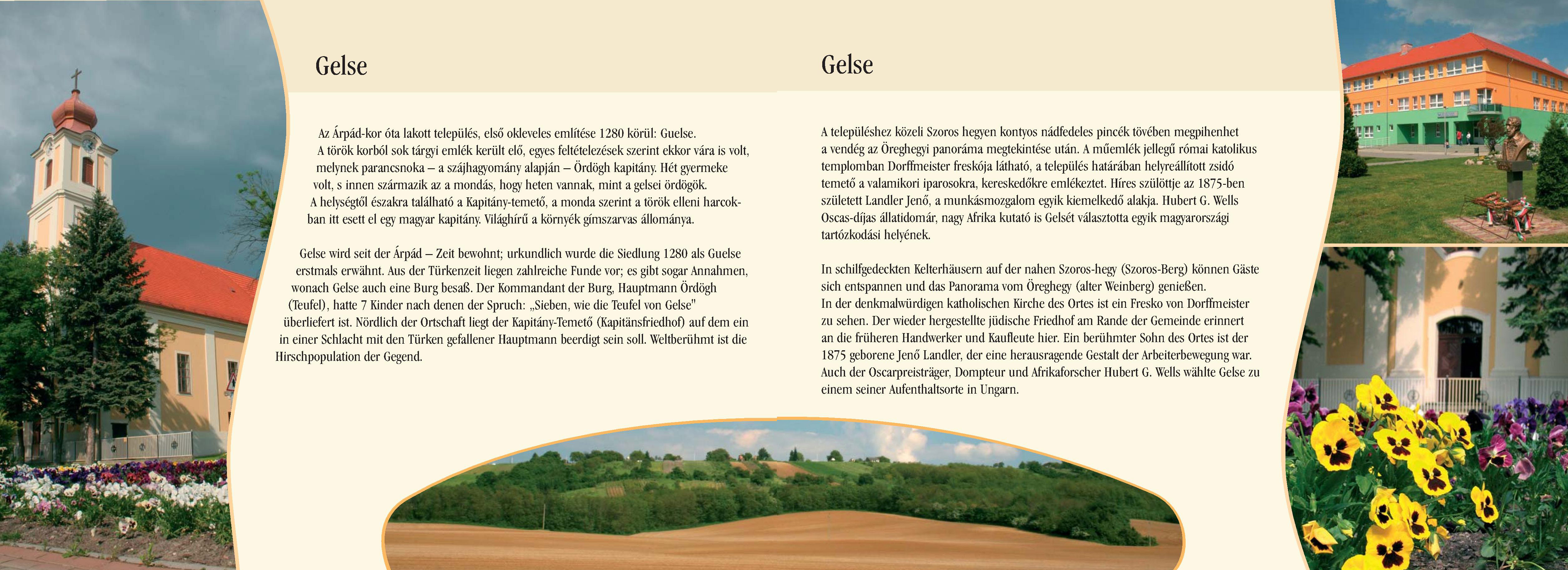 Nyilvános 2052 | 6321 | Gelse | Gelse wird seit der Árpád ¬ Zeit bewohnt; urkundlich wurde die Siedlung 1280 als Guelse erstmals erwähnt. Aus der Türkenzeit liegen zahlreiche Funde vor; es gibt sogar Annahmen, wonach Gelse auch eine Burg besaß. Der Kommandant der Burg, Hauptmann Ördögh (Teufel), hatte 7 Kinder nach denen der Spruch: ,,Sieben, wie die Teufel von Gelse" überliefert ist. Nördlich der Ortschaft liegt der Kapitány-Temető (Kapitänsfriedhof) auf dem ein in einer Schlacht mit den Türken gefallener Hauptmann beerdigt sein soll. Weltberühmt ist die Hirschpopulation der Gegend. In schilfgedeckten Kelterhäusern auf der nahen Szoros-hegy (Szoros-Berg) können Gäste sich entspannen und das Panorama vom Öreghegy (alter Weinberg) genießen. In der denkmalwürdigen katholischen Kirche des Ortes ist ein Fresko von Dorffmeister zu sehen. Der wieder hergestellte jüdische Friedhof am Rande der Gemeinde erinnert an die früheren Handwerker und Kaufleute hier. Ein berühmter Sohn des Ortes ist der 1875 geborene Jenő Landler, der eine herausragende Gestalt der Arbeiterbewegung war. Auch der Oscarpreisträger, Dompteur und Afrikaforscher Hubert G. Wells wählte Gelse zu einem seiner Aufenthaltsorte in Ungarn. Dieses Text stammt von: Pannonhát tájpark prospektus 2006. Web: http://www.pannonhat.hu/ (auch in Deutsch) |
