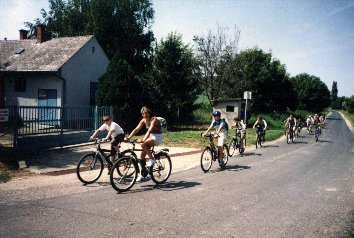 A nyári szünidőben gyermekkirándulás kerékpárral Nagyrécséről Nagybakónakra. Elöl: Bátorné Kocsis Ildikó és Salamon Bálint. 2005.