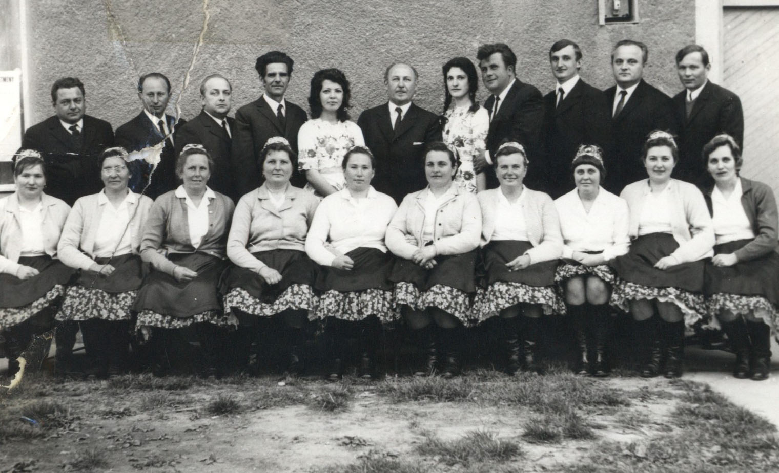 A balatonmagyaródi népdalkör a vegyesbolt előtt. Kovács Ferencné balatonmagyaródi lakos fotógyűjteményéből.