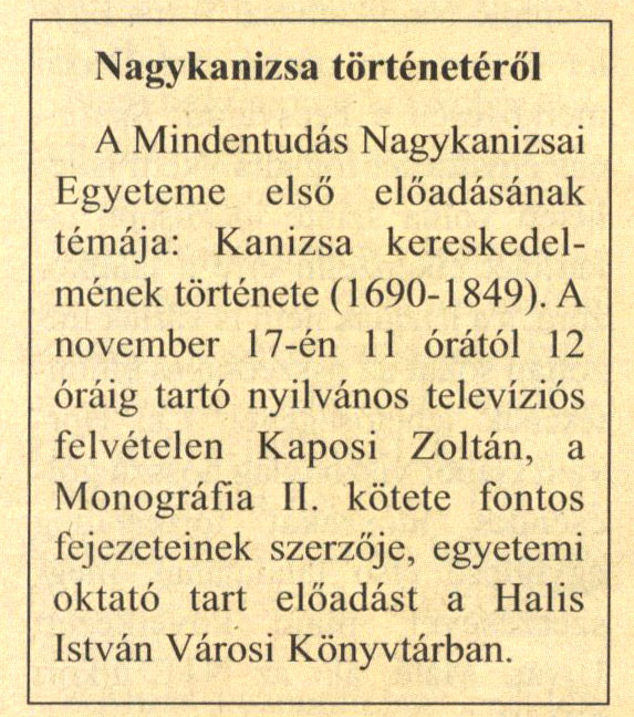 Nyilvános 2253 | 4332 | Kanizsa 2008. november 13. 38. szám 16. oldal - Nagykanizsa történetéről | Előzetes a november 17-i előadáshoz Cím: Kanizsa Alcím: Dél-Zalai Hetilap Megjelenés: Hetenként: 1989-től ISSN: 0865-3879 A cikk szövege: Nagykanizsa történetéről A Mindentudás Nagykanizsai Egyeteme első előadásának témája: Kanizsa kereskedelmének története (1690-1849). A november 17-én 11 órától 12 óráig tartó nyilvános televíziós felvételen Kaposi Zoltán, a Monográfia II. kötete fontos fejezeteinek szerzője, egyetemi oktató tart előadást a Halis István Városi Könyvtárban. |