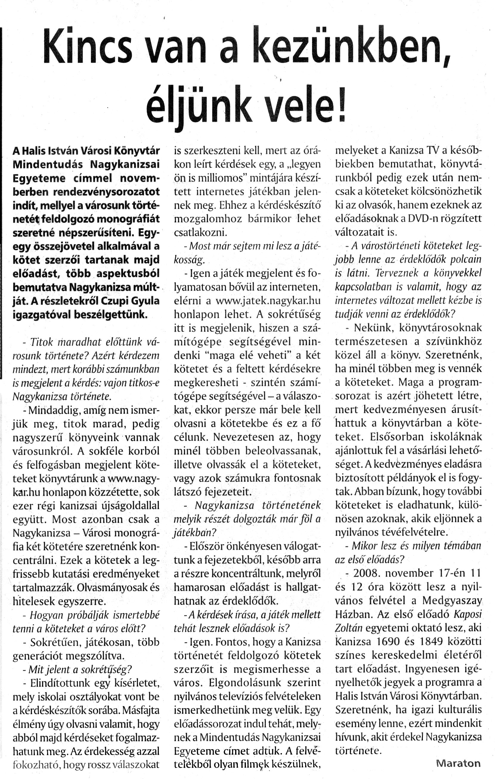 Nyilvános 2277 | 4536 | Nagykanizsai Maraton 2008. november 6. 044. szám 2. oldal - Kincs van a kezünkben, éljünk vele | A cikk szövege: Kincs van a kezünkben, éljünk vele! A Halis István Városi Könyvtár Mindentudás Nagykanizsai Egyeteme címmel novemberben rendezvénysorozatot indít, mellyel a városunk történetét feldolgozó monográfiát szeretné népszerűsíteni. Egy-egy összejövetel alkalmával a kötet szerzői tartanak majd előadást, több aspektusból bemutatva Nagykanizsa múltját. A részletekről Czupi Gyula igazgatóval beszélgettünk. - Titok maradhat előttünk városunk története? Azért kérdezem mindezt, mert korábbi számunkban is megjelent a kérdés: vajon titkos-e Nagykanizsa története. - Mindaddig, amíg nem ismerjük meg, titok marad, pedig nagyszerű könyveink vannak városunkról. A sokféle korból és felfogásban megjelent köteteket könyvtárunk a www.nagy-kar.hu honlapon közzétette, sok ezer régi kanizsai újságoldallal együtt. Most azonban csak a Nagykanizsa - Városi monográfia két kötetére szeretnénk koncentrálni. Ezek a kötetek a legfrissebb kutatási eredményeket tartalmazzák. Olvasmányosak és hitelesek egyszerre. - Hogyan próbálják ismertebbé tenni a köteteket a város előtt? - Sokrétűen, játékosan, több generációt megszólítva. - Mit jelent a sokrétűség? - Elindítottunk egy kísérletet, mely iskolai osztályokat vont be a kérdéskészítők sorába. Másfajta élmény úgy olvasni valamit, hogy abból majd kérdéseket fogalmazhatunk meg. Az érdekesség azzal fokozható, hogy rossz válaszokat is szerkeszteni kell, mert az órákon leírt kérdések egy, a „legyen ön is milliomos" mintájára készített internetes játékban jelennek meg. Ehhez a kérdéskészítő mozgalomhoz bármikor lehet csatlakozni. - Most már sejtem mi lesz a játékosság. - Igen a játék megjelent és folyamatosan bővül az interneten, elérni a www.jatek.nagykar.hu honlapon lehet. A sokrétűség itt is megjelenik, hiszen a számítógépe segítségével mindenki "maga elé veheti" a két kötetet és a feltett kérdésekre megkeresheti - szintén számítógépe segítségével - a válaszokat, ekkor persze már bele kell olvasni a kötetekbe és ez a fő célunk. Nevezetesen az, hogy minél többen beleolvassanak, illetve olvassák el a köteteket, vagy azok számukra fontosnak látszó fejezeteit. - Nagykanizsa történetének melyik részét dolgozták már föl a játékban? - Először önkényesen válogattunk a fejezetekből, később arra a részre koncentráltunk, melyről hamarosan előadást is hallgathatnak az érdeklődők. -A kérdések írása, a játék mellett tehát lesznek előadások is? - Igen. Fontos, hogy a Kanizsa történetét feldolgozó kötetek szerzőit is megismerhesse a város. Elgondolásunk szerint nyilvános televíziós felvételeken ismerkedhetünk meg velük. Egy előadássorozat indul tehát, melynek a Mindentudás Nagykanizsai Egyeteme címet adtuk. A felvételékből olyan filmek készülnek, melyeket a Kanizsa TV a későbbiekben bemutathat, könyvtárunkból pedig ezek után nemcsak a köteteket kölcsönözhetik ki az olvasók, hanem ezeknek az előadásoknak a DVD-n rögzített változatait is. - A várostörténeti köteteket legjobb lenne az érdeklődők polcain is látni. Terveznek a könyvekkel kapcsolatban is valamit, hogy az internetes változat mellett kézbe is tudják venni az érdeklődők? - Nekünk, könyvtárosoknak természetesen a szívünkhöz közel áll a könyv. Szeretnénk, ha minél többen meg is vennék a köteteket. Maga a programsorozat is azért jöhetett létre, mert kedvezményesen árusíthattuk a könyvtárban a köteteket. Elsősorban iskoláknak ajánlottuk fel a vásárlási lehetőséget. A kedvezményes eladásra biztosított példányok el is fogytak. Abban bízunk, hogy további köteteket is eladhatunk, különösen azoknak, akik eljönnek a nyilvános tévéfelvételre. - Mikor lesz és milyen témában az első előadás? - 2008. november 17-én 11 és 12 óra között lesz a nyilvános felvétel a Medgyaszay Házban. Az első előadó Kaposi Zoltán egyetemi oktató lesz, aki Kanizsa 1690 és 1849 közötti színes kereskedelmi életéről tart előadást. Ingyenesen igényelhetők jegyek a programra a Halis István Városi Könyvtárban. Szeretnénk, ha igazi kulturális esemény lenne, ezért mindenkit hívunk, akit érdekel Nagykanizsa története. Maraton |