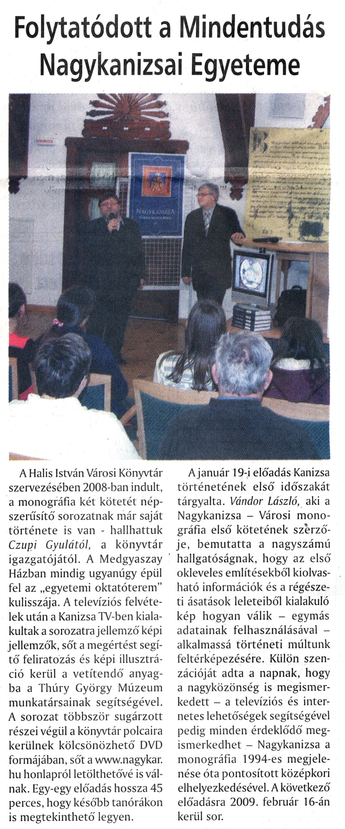 Nyilvános 2090 | 3813 | Nagykanizsai Maraton 2009. január 22. 3. szám 3. oldal | Folytatódott a Mindentudás Nagykanizsai Egyeteme A cikk szövege: Folytatódott a Mindentudás Nagykanizsai Egyeteme A Halis István Városi Könyvtár szervezésében 2008-ban indult, a monográfia két kötetét népszerűsítő sorozatnak már saját története is van - hallhattuk Czupi Gyulától, a könyvtár igazgatójától. A Medgyaszay Házban mindig ugyanúgy épül fel az „egyetemi oktatóterem" kulisszája. A televíziós felvételek után a Kanizsa TV-ben kialakultak a sorozatra jellemző képi jellemzők, sőt a megértést segítő feliratozás és képi illusztráció kerül a vetítendő anyagba a Thúry György Múzeum munkatársainak segítségével. A sorozat többször sugárzott részei végül a könyvtár polcaira kerülnek kölcsönözhető DVD formájában, sőt a www.nagykar. hu honlapról letölthetővé is válnak. Egy-egy előadás hossza 45 perces, hogy később tanórákon is megtekinthető legyen. A január 19-i előadás Kanizsa történetének első időszakát tárgyalta. Vándor László, aki a Nagykanizsa - Városi monográfia első kötetének szerzője, bemutatta a nagyszámú hallgatóságnak, hogy az első okleveles említésekből kiolvasható információk és a régészeti ásatások leleteiből kialakuló kép hogyan válik - egymás adatainak felhasználásával -alkalmassá történeti múltunk feltérképezésére. Külön szenzációját adta a napnak, hogy a nagyközönség is megismerkedett - a televíziós és internetes lehetőségek segítségével pedig minden érdeklődő megismerkedhet - Nagykanizsa a monográfia 1994-es megjelenése óta pontosított középkori elhelyezkedésével. A következő előadásra 2009. február 16-án kerül sor. |