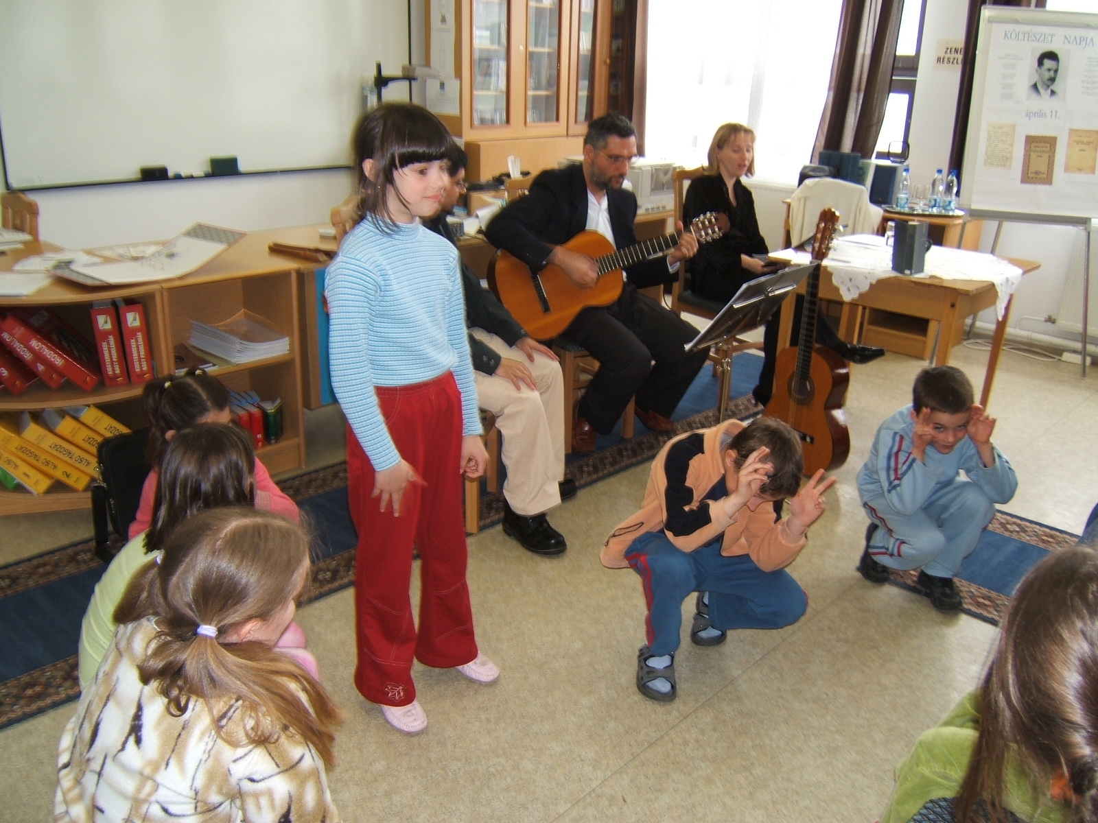 Nyilvános 1387 | 3446 | Költészet napja műsor a zalakarosi könyvtárban 2006. április 11-én. Vendégünk volt a Kardos Banda együttes, aki a kisiskolásoknak és a nagyoknak külön összeálított \"Költészet - minden formában régiektől, maiaktól\" című műsorát adta elő. | |