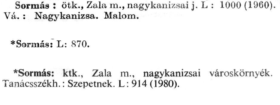Nyilvános 2005 | 5657 | A szócikkek felismertetett szövege: | (Az első csillag után az 1972-es, a második csillag után az 1981-es kiadású kiegészítő kötetből származó szöveg következik) Sormás: ötk., Zala m., nagykanizsai j. L: 1000 (1960). Vá.: Nagykanizsa. Malom. *Sormás: L: 870. *Sormás: ktk., Zala m., nagykanizsai városkörnyék. Tanácsszékh.: Szepetnek. L: 914 (1980). A szócikkek a következő lexikonból származnak: Cím: Új magyar lexikon Közreműködő: Berei Andor (1900-1979) (szerk.) Szerz. közl.: [szerk. Berei Andor et al.] Kiadás jelzés: 2. lny. Kiadás: Budapest : Akad. K., 1961-1962 Kötetei: 1., A - C 2., D - F 3., G - J 4., K - Me 5., Mf - R 6., S - Z 7. köt., A-Z Kiegészítő kötet (1972) Kiegészítő kötet, 1962÷1980 (1981) ETO jelzet: 03=945.11 Szakjelzet: 030 Cutter: U 28 Nyelv: magyar Megjegyzés: Bibliogr. a címszavak egy részének végén |