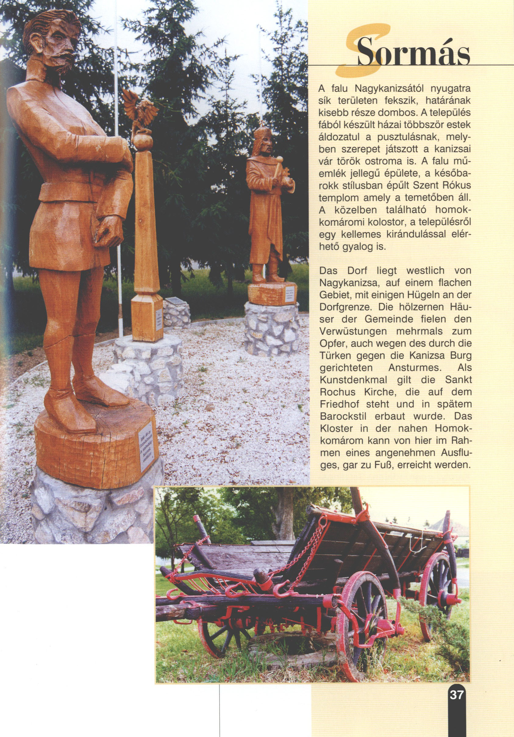 Nyilvános 2236 | 7813 | Sormás | Das Dorf liegt westlich von Nagykanizsa, auf einem flachen Gebiet, mit einigen Hügeln an der Dorfgrenze. Die hölzernen Häuser der Gemeinde fielen den Verwüstungen mehrmals zum Opfer, auch wegen des durch die Türken gegen die Kanizsa Burg gerichteten Ansturmes. Als Kunstdenkmal gilt die Sankt Rochus Kirche, die auf dem Friedhof steht und in spätem Barockstil erbaut wurde. Das Kloster in der nahen Homokkomárom kann von hier im Rahmen eines angenehmen Ausfluges, gar zu Fuß, erreicht werden. Dieses Text stammt von: Titel: Hívogató a Régiók Kapujában - Útikönyv Látnivalók Nagykanizsán és Térségében (Einladend in dem Tor des Gebiets - Reisebuch - Sehenswürdigkeiten in Nagykanizsa und Umgebung) Herausgegeben von: Nagykanizsa és a Környező Települések Területfejlesztési Társulása (Verein für Gebietsentwicklung in Nagykanizsa und in ihrer Umgebung) 8800 Nagykanizsa, Petőfi Sándor út 5. Tel.: 06 93/536-453 • 06 93/536-454 Tel ./Fax: 06 93/326-323 E-mail: terstars@axelero.hu www.kanizsaterseg.celodin.hu |