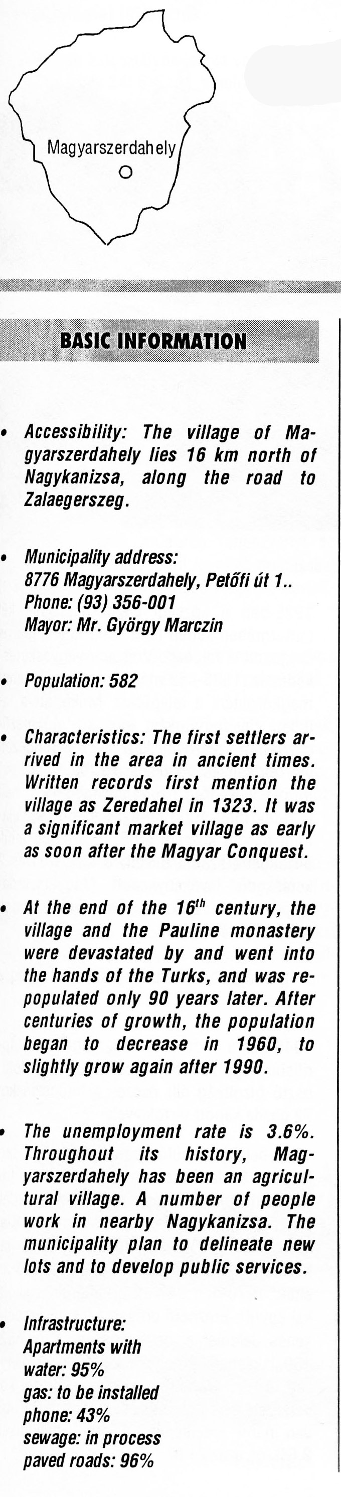 Nyilvános 2252 | 6364 | Magyarszerdahely | BASIC INFORMATION Accessibility: The village of Magyarszerdahely lies 16 km north of Nagykanizsa, along the road to Zalaegerszeg. Municipality address: 8776 Magyarszerdahely, Petőfi út 1. Phone: (93) 356-001 Mayor: Mr. György Marczin Population: 582 Characteristics: The first settlers arrived in the area in ancient times. Written records first mention the village as Zeredahel in 1323. It was a significant market village as early as soon after the Magyar Conquest. At the end of the 16th century, the village and the Pauline monastery were devastated by and went into the hands of the Turks, and was repopulated only 90 years later. After centuries of growth, the population began to decrease in 1960, to slightly grow again after 1990. The unemployment rate is 3.6%. Throughout its history, Magyarszerdahely has been an agricultural village. A number of people work in nearby Nagykanizsa. The municipality plan to delineate new lots and to develop public services. Infrastructure: Apartments with water: 95% gas: to be installed phone: 43% sewage: in process paved roads: 96% This text came from the following book: Title: Handbook of Zala county (Zala megye kézikönyve) Series: County handbooks of Hungary (Magyarország megyei kézikönyvei) Chief editor: Hóbor József Publisher: (Hatvan), CEBA-Hungary Ltd, 1998 ETO: 908.439.121(035) ; 050.8(439.121) ISBN: 963-9089-18-2 Pages: 488-1040 p. Remark: Closed on: 1998. márc. 31. |
