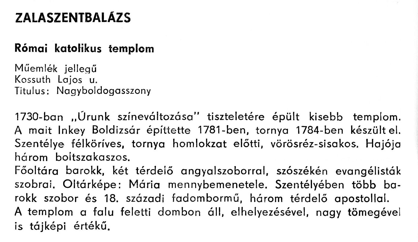 Nyilvános 1679 | 3276 | Zalaszentbalázs - Zala megye műemlékei 1979 122old | A részlet szövege: ZALASZENTBALÁZS Római katolikus templom Műemlék jellegű Kossuth Lajos u. Titulus: Nagyboldogasszony 1730-ban „Urunk színeváltozása" tiszteletére épült kisebb templom. A mait Inkey Boldizsár építtette 1781-ben, tornya 1784-ben készült el. Szentélye félköríves, tornya homlokzat előtti, vörösréz-sisakos. Hajója három boltszakaszos. Főoltára barokk, két térdelő angyalszoborral, szószékén evangélisták szobrai. Oltárképe: Mária mennybemenetele. Szentélyében több barokk szobor és 18. századi fadombormű, három térdelő apostollal. A templom a falu feletti dombon áll, elhelyezésével, nagy tömegével is tájképi értékű. A részlet a következő könyvből származik: Cím: Zala megye műemlékei Szerző: Németh József (1928) Közreműködő: Vándor László (szerk.) ; Szabóky Zsolt (1941) (fotó) Szerz. közl.: Németh József ; [szerk. Vándor László] ; [fotók... Szabóky Zsolt] Kiadás jelzés: 2. bőv. kiad. Kiadás: Zalaegerszeg : Zalai Ny., 1979 ETO jelzet: 72(439.121) ; 7.025.3/.4(439.121) ; 908.439.121 Tárgyszó: Zala Szakjelzet: 908 Cutter: N 53 Nyelv: magyar Oldalszám: 134 p. |