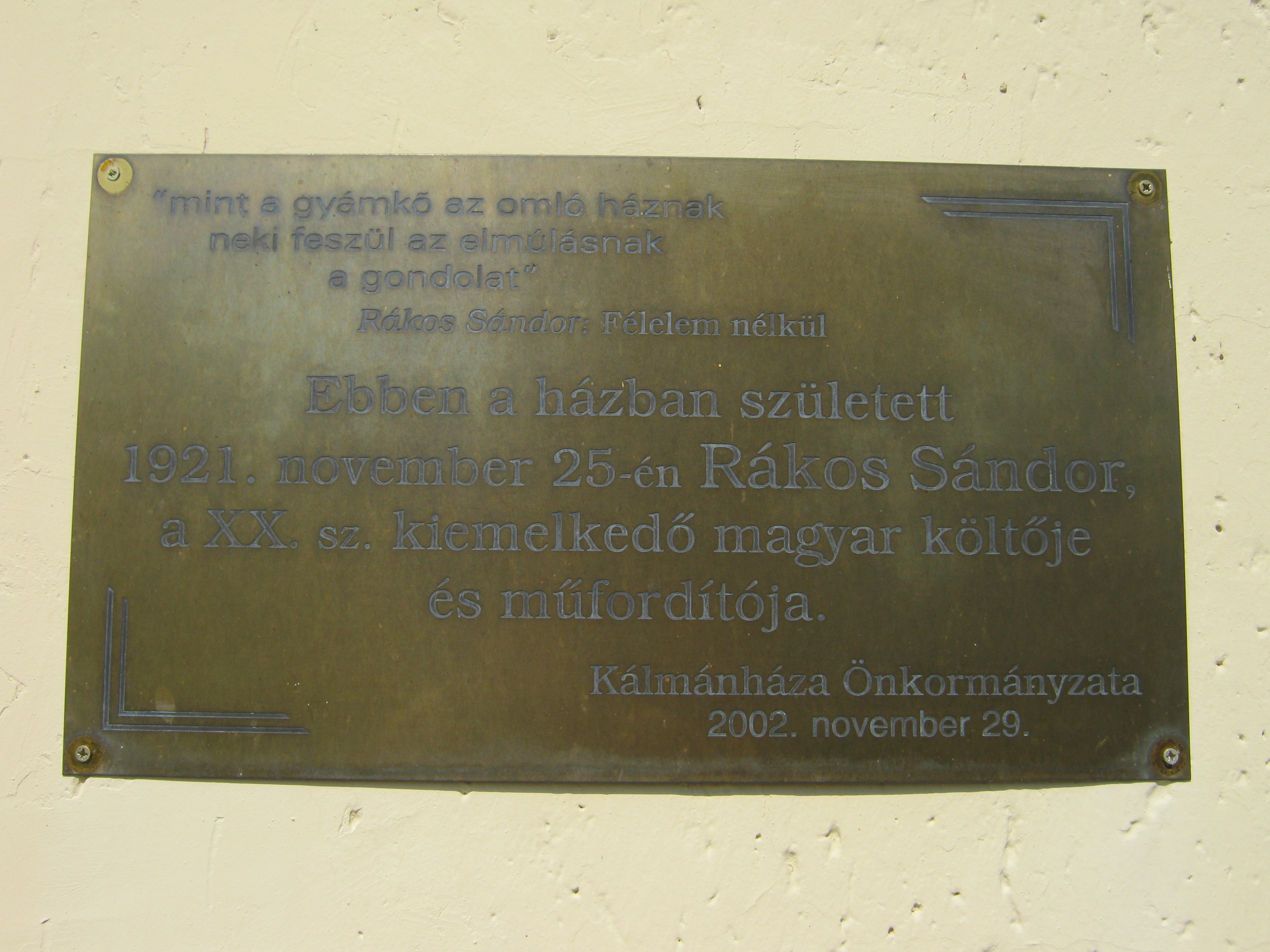 Nyilvános 1265 | 2793 | Kálmánháza, Kossuth utca 53. | 1921. november 25-én itt, az egykori tanyasi iskola udvari lakóépületében, a kántortanító egyetlen, későn érkezett gyermekeként született Rákos Sándor költő. "Kálmánházán huszonegyben havat hozott Katalin; akkor, mikor én születtem körmére fújt s rágta kinn nyírfák kérgét a kert alján éhező nyúl s megfagyott - bizony engem csikorgó tél, fagyos világ fogadott." (Rákos Sándor: Születésnapomra) Az azóta erősen átalakított épületben ma az ő nevét viselő szociális otthon működik. A költő emléktábláját 2002-ben állította Kálmánháza önkormányzata. Felh. irod.: Valachi Anna: Csigavonalban a Parnasszusra - Rákos Sándor földi poklai és táguló költői világa. Bp. Argumentum, 2009 A fénykép 2010 augusztus elején készült. |