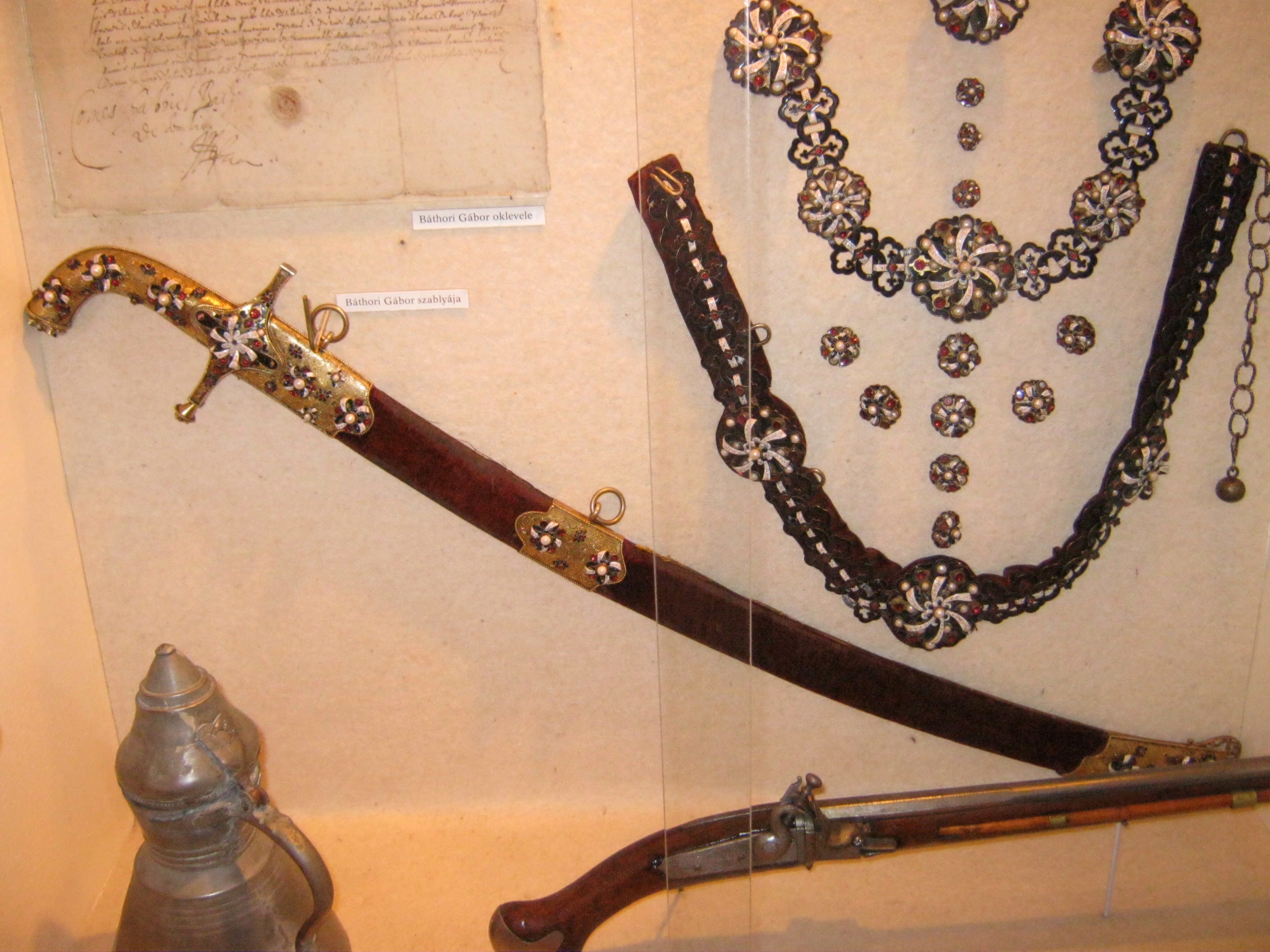 Nyilvános 942 | 1592 | Nyírbátor, Károlyi utca 21. Báthori István Múzeum | A minorita kolostor épültét 1959-ben kapta meg a múzeum. Első igazgatója, Szalontai Barnabás áldozatos munkája nyomán két év múlva már meg is nyílhatott benne az első kiállítás. A képen a múzeum legnagyobb kincsei közé tartozó relikvia, Báthori Gábor erdélyi fejedelem szablyája látható a korból származó sisakforgó, mentekötő, menteöv és a hozzá tartozó gombok társaságában. Balra Báthori Gábor oklevele. Felh. irod.: Látnivalók Szabolcs-Szatmár-Bereg megyében. Miskolc, Well-PRess, 1999 www.nyirbim.hu A fénykép 2010 augusztus elején készült. |