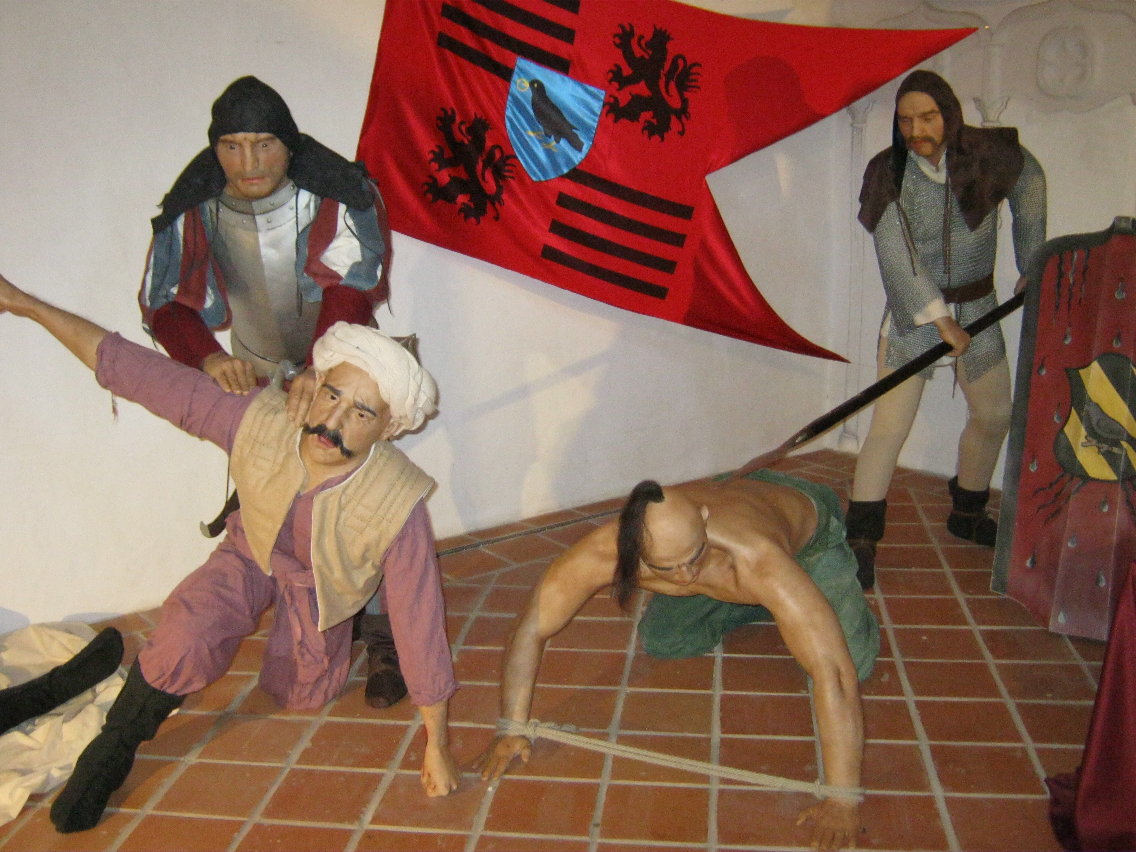 Nyilvános 937 | 1319 | Nyírbátor, Vár utca 1. Báthori várkastély | A Báthoriak várkastélyának többször átalakított egyetlen megmaradt épületét a közelmúltban állították helyre. Pincéjében reneszánsz étterem látogatható, földszintjén és emeletén a Báthori Panoptikum 45 élethű és korhű viaszfigurában mutatja be érzékletesen a jeles nemesi család és Nyírbátor történetét. A figurák tervezője és készítője Megyeri János szobrászművész. A megtekintést olvasható és hallgatható kalauzolás kíséri. A kiállítást a kenyérmezei csata 530. évfordulóján, 2009.október 13-án adták át. Az 1479-ben a törökkel vívott csata egyik hőse Báthori István volt. A képen a kenyérmezei csata egy jelenete látható. Felh. irod.: Látnivalók Szabolcs-Szatmár-Bereg megyében. Miskolc, Well-PRess, 1999 www.bathorivarkastely.hu A fénykép 2010 augusztus elején készült. |