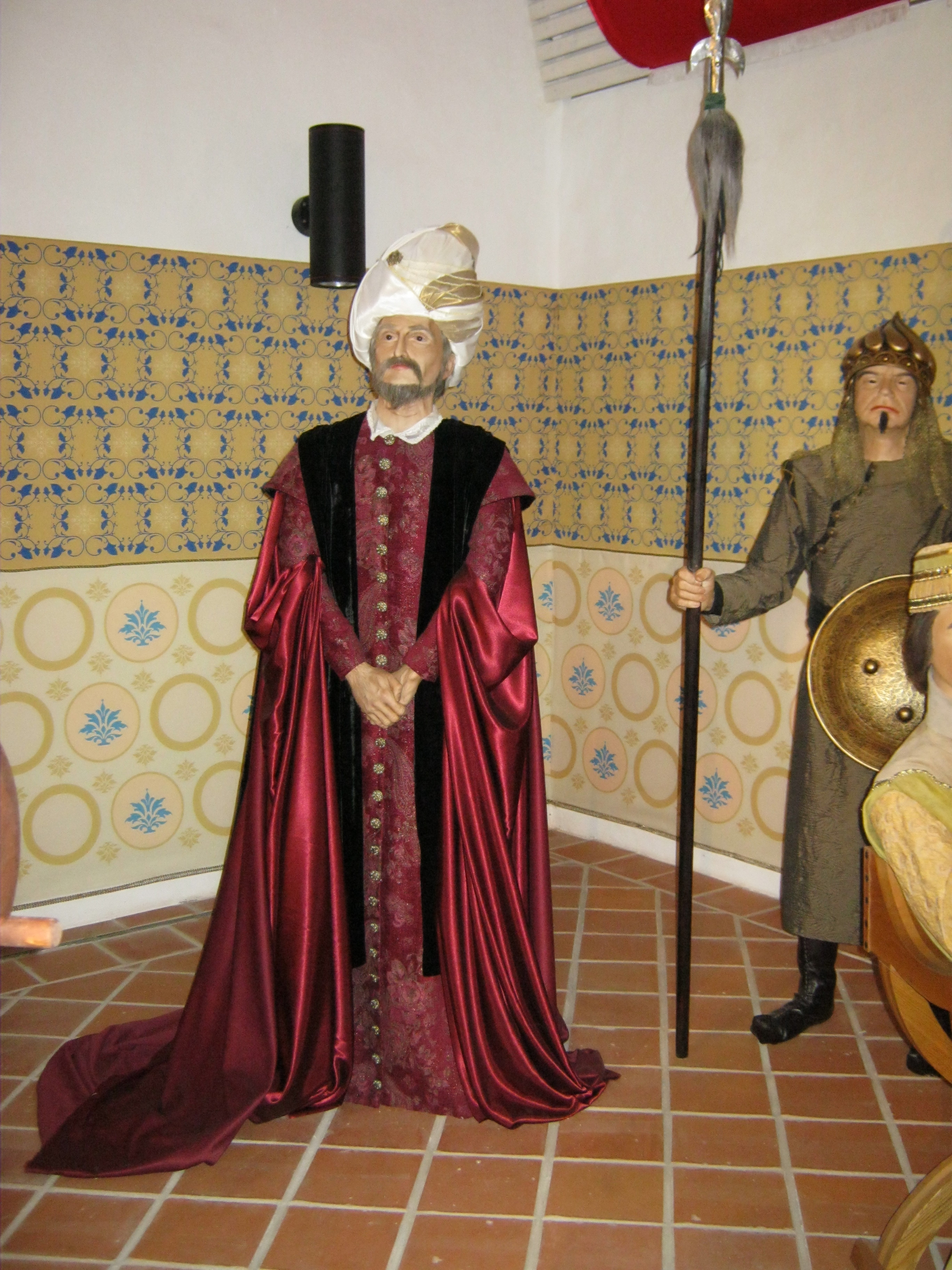 Nyilvános 928 | 1270 | Nyírbátor, Vár utca 1. Báthori várkastély | A Báthoriak várkastélyának többször átalakított egyetlen megmaradt épületét a közelmúltban állították helyre. Pincéjében reneszánsz étterem látogatható, földszintjén és emeletén a Báthori Panoptikum 45 élethű és korhű viaszfigurában mutatja be érzékletesen a jeles nemesi család és Nyírbátor történetét. A figurák tervezője és készítője Megyeri János szobrászművész. A megtekintést olvasható és hallgatható kalauzolás kíséri. A kiállítást a kenyérmezei csata 530. évfordulóján, 2009.október 13-án adták át. Az 1479-ben a törökkel vívott csata egyik hőse Báthori István volt. A képen Szulejmán szultán viaszfigurája. Felh. irod.: Látnivalók Szabolcs-Szatmár-Bereg megyében. Miskolc, Well-PRess, 1999 www.bathorivarkastely.hu A fénykép 2010 augusztus elején készült. |