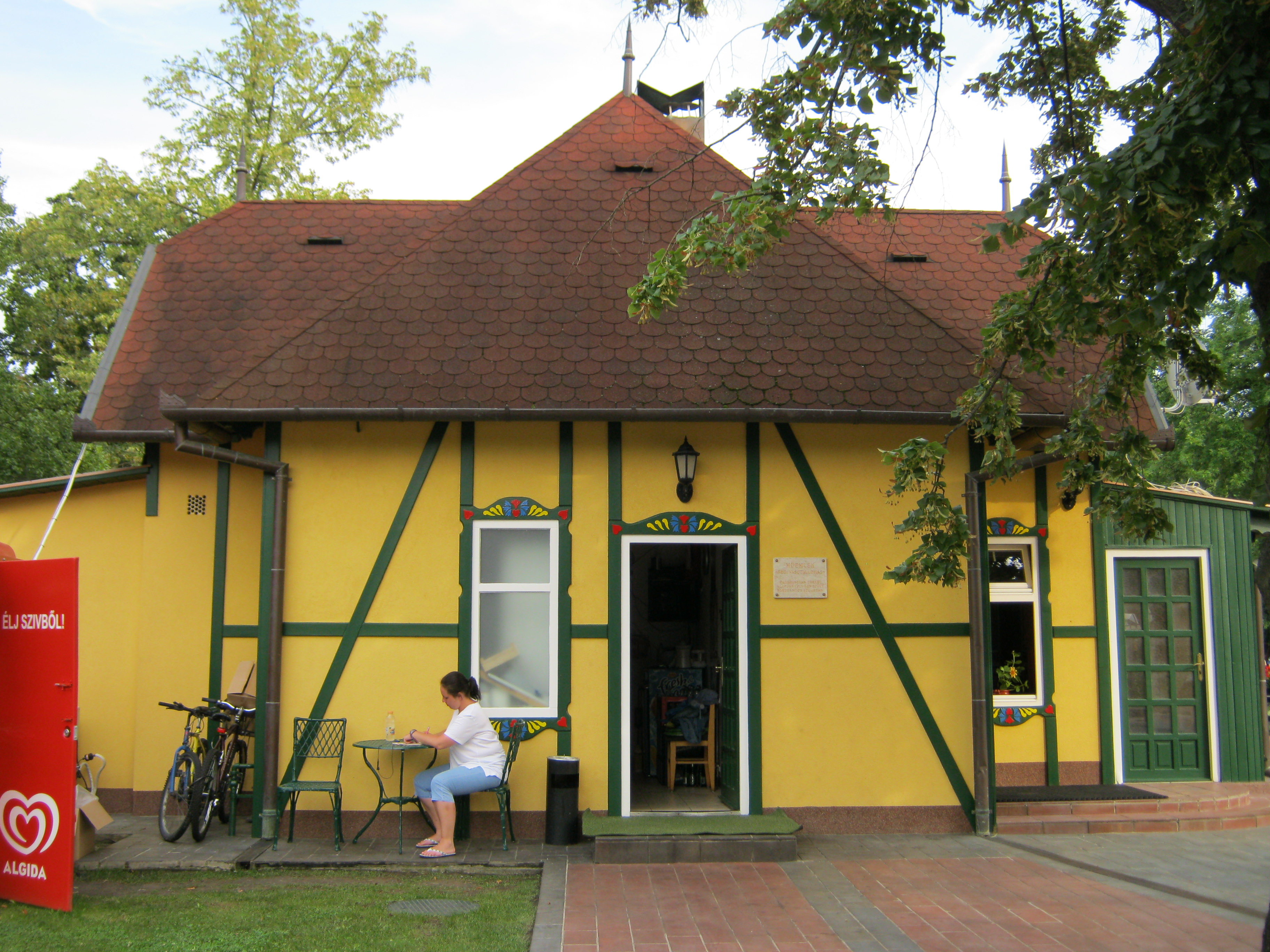Nyilvános 964 | 1735 | Nyíregyháza-Sóstó, Vasútállomás | Sóstófürdő központjában ma étteremként üzemel a régi vasútállomás műemlékké nyilvánított épülete. 1911-ben ezt is Pazár István tervezte, eklektikus stílusban. Közelében egy régi mozdony is látható. A fénykép 2010 augusztus elején készült |