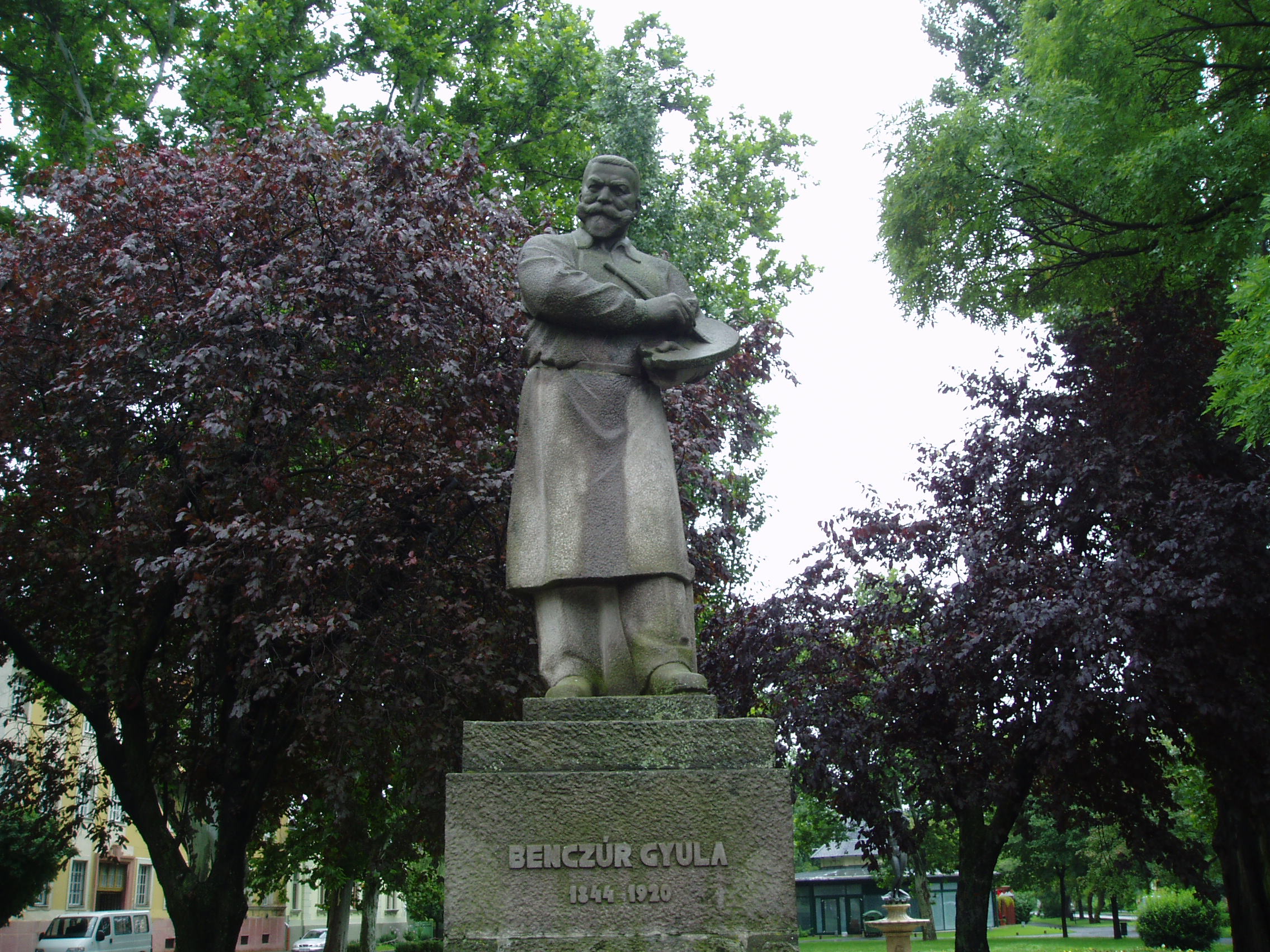 Nyilvános 993 | 2255 | Nyíregyháza, Benczúr tér: Benczúr Gyula szobra | A nyíregyházi születésű (lásd: Nyíregyháza, Kossuth tér 8.) nagy magyar festőművész egyetlen mészkőtömbből kifaragott szobrát Galántai Fekete Géza készítette 1941-ben. Benczúr Gyula emlékszobája a téren álló Jósa András Múzeumban (lásd: Nyíregyháza, Benczúr tér 21.) tekinthető meg. Felh. irod.: Látnivalók Szabolcs-Szatmár-Bereg megyében. Miskolc, Well-PRess, 1999 A fénykép 2010 augusztus elején készült. |
