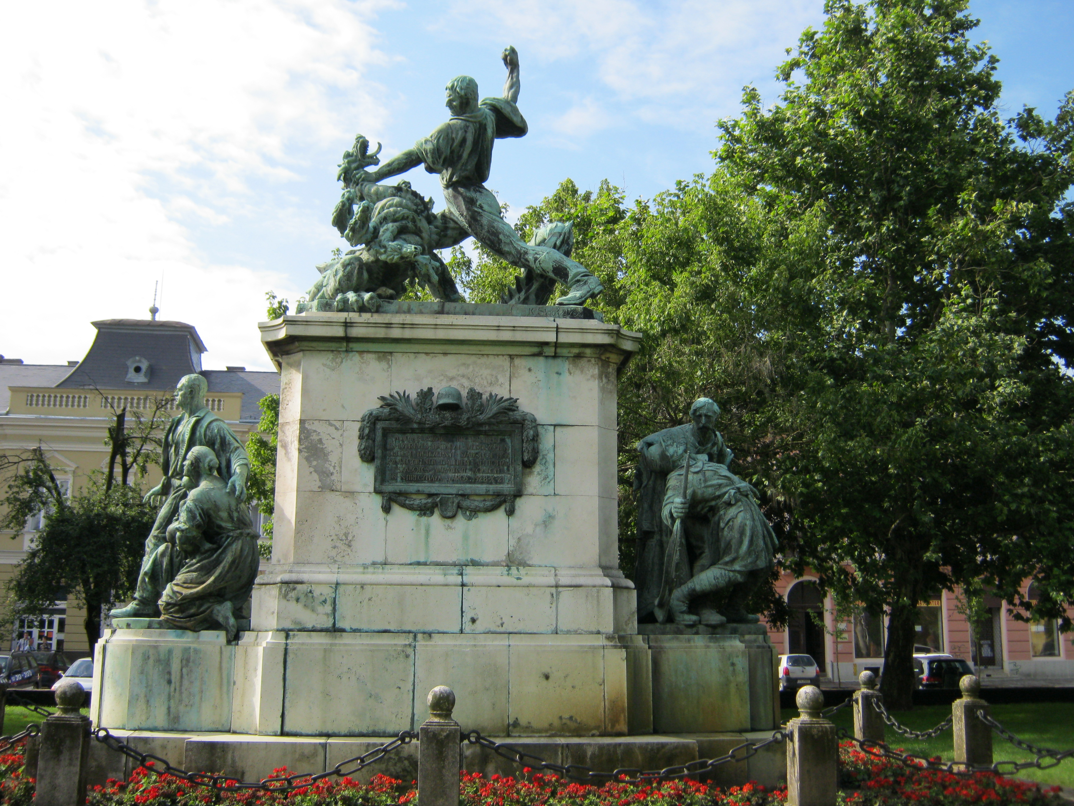 Nyilvános 963 | 1803 | Nyíregyháza, Hősök tere: Hősök emlékműve | A nagyméretű, angolpark jellegű Hősök tere a déli részén álló szoborkompozícióról kapta nevét. A Hősök című szoborcsoport Kisfaludi Stróbl Zsigmond műve. 1928-ban állították fel az első világháború hőseire és áldozataira emlékezve. Korábban helyén a Bessenyei Györgyöt ábrázoló szobor állt, amelyet ekkor költöztettek mai helyére (lásd: Nyíregyháza, Bessenyei tér). A szoborcsoport fő alakja a sárkánnyal küzdő hős, két mellékalakja (indulás a harcba és a vég) tartalmilag szorosan kapcsolódik a központi figurához. Felh. irod.: Látnivalók Szabolcs-Szatmár megyében. Miskolc, Well-PRess, 1999 A fénykép 2010 augusztus elején készült. |