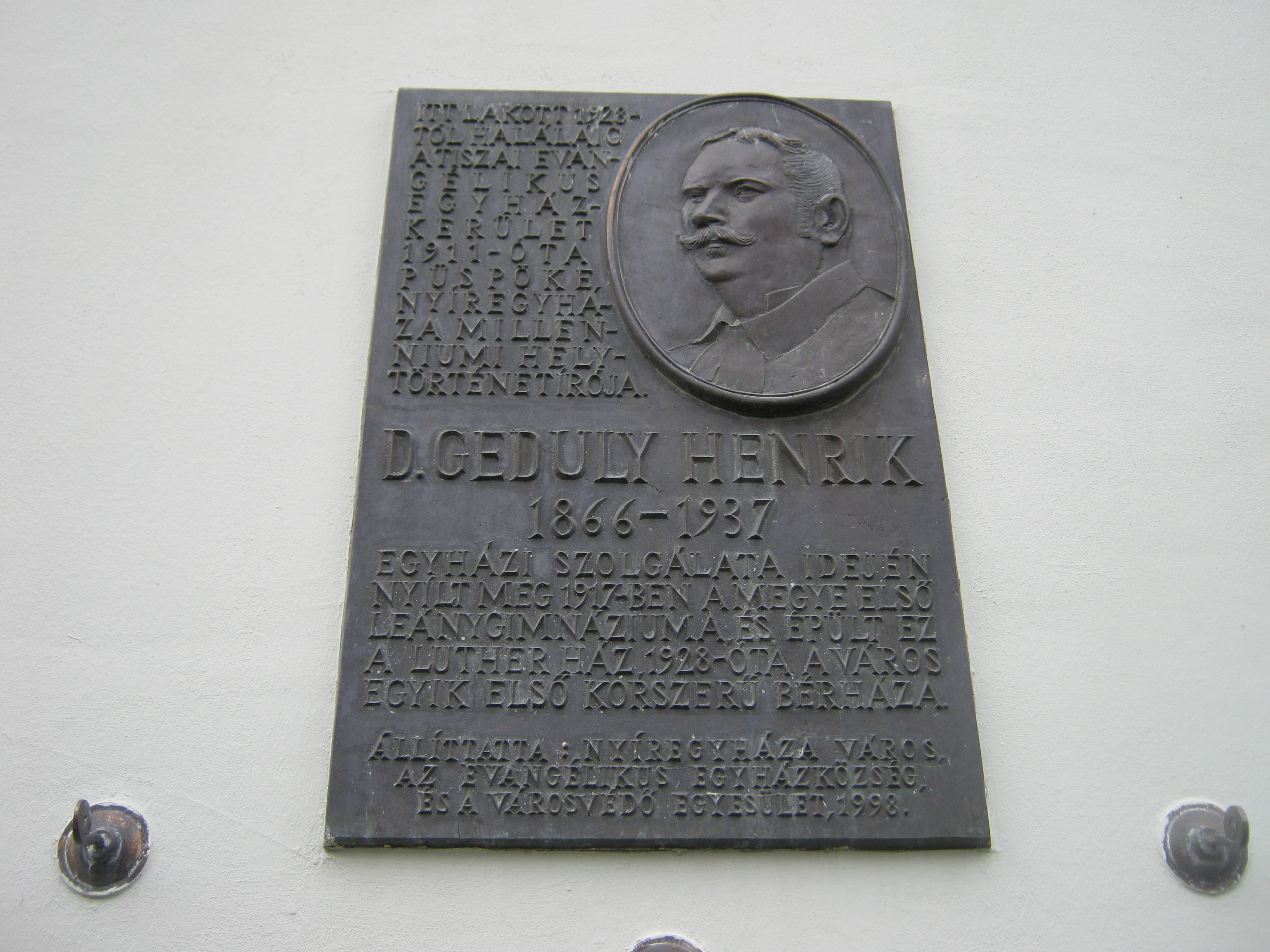 Nyilvános 957 | 1458 | Nyíregyháza, Luther utca 5. | Az épület egy másik táblája Geduly Henrik emlékét örökíti meg. A Tiszai Evangélikus Egyházkerület püspöke itt lakott, az általa 1928-ban építtetett házban. Ez volt Nyíregyháza első korszerű bérháza. Geduly egyházi működése mellett 1896-ban megírta a "Nyíregyháza az ezredik évben" című városmonográfiát. Ő alapította a leánygimnáziumot és tevékenyen részt vett a város kulturális és társadalmi életében. Sírja az Északi temetőben (lásd: Pazonyi tér 5.) található. Felh. irod.: http://www.lutheran.hu/z/ujsagok/evelet/archivum/2007/07/103 A fénykép 2010 augusztus elején készült. |