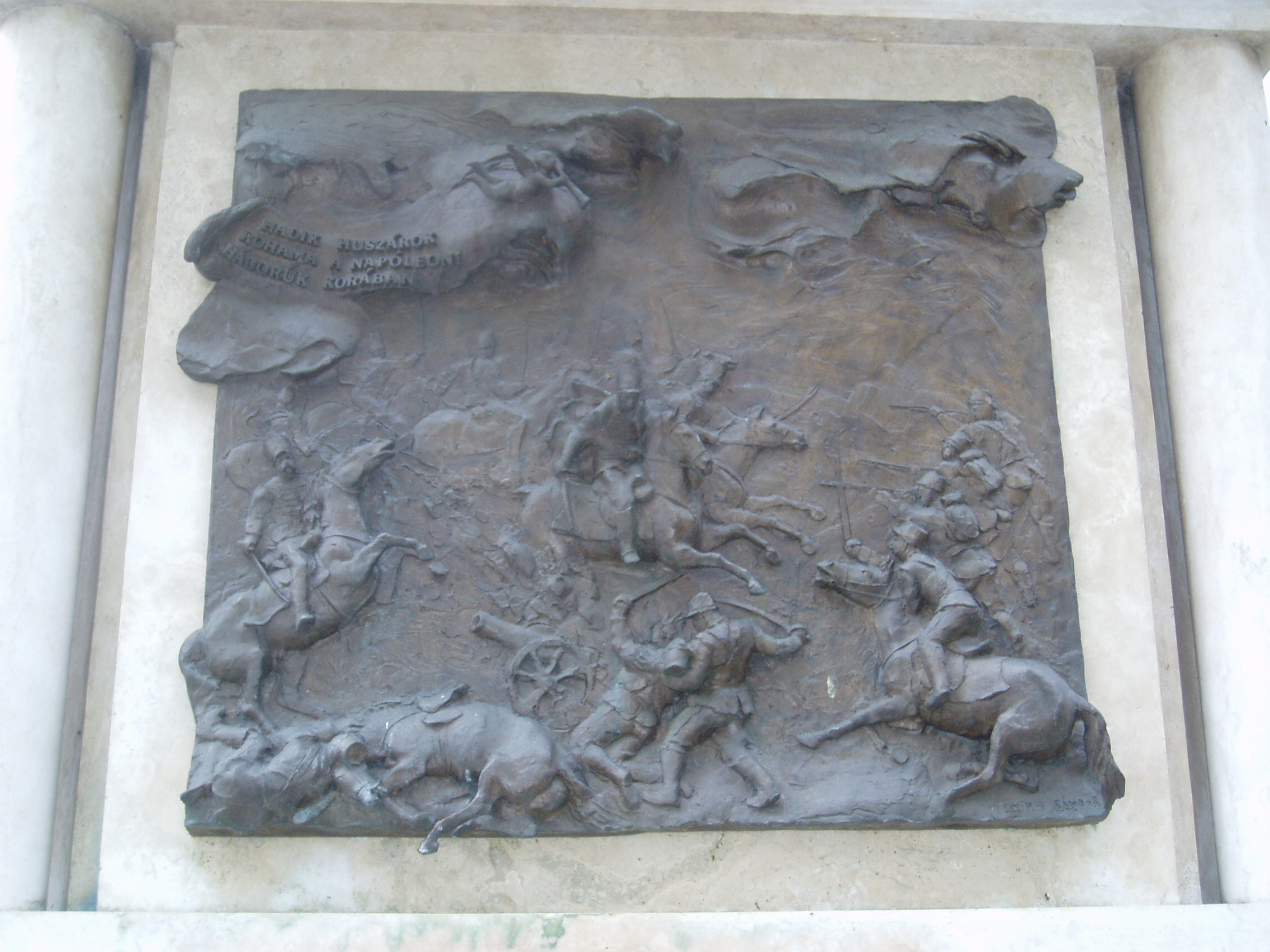 Nyilvános 933 | 1373 | Nyíregyháza, Országzászló tér: Magyar huszár emlékmű | Győrfi Sándor alkotása az Országzászló téren elhelyezett "A magyar huszár" című emlékmű. A talapzat két oldalán látható domborművek közül az egyik a Hadik-huszárok rohamát idézi fel a napóleoni háborúk korából. Felh. irod.: www.szoborlap.hu A fénykép 2010 augusztus elején készült. |