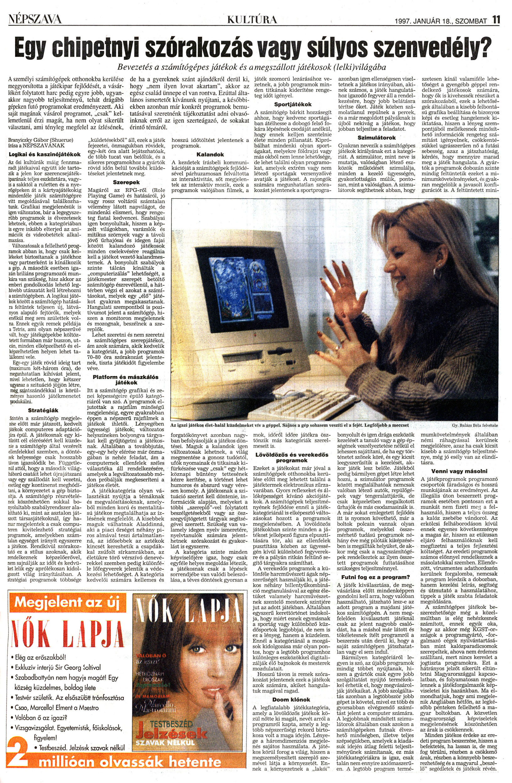 Nyilvános 1540 | 2814 | Népszava 1997.01.18. 11old - Egy chipetnyi szórakozás vagy súlyos szenvedély | A következő szöveg a cikk szövegéből keletkezett automata szövegfelismertető segítségével NÉPSZAVA KULTÚR V . 1997. JANUÁR 18., SZOMBAT 11 Egy chipetnyi szórakozás vagy súlyos szenvedély? Bevezetés a számítógépes játékok és a megszállott játékosok (lelkivilágába A személyi számítógépek otthonokba kerülése meggyorsította a játékipar fejlődéséi, a vásárlókért folytatóit harc pedig egyre jobb, ugyanakkor nagyobb teljesítményű, tehát drágább gépeken futó programokat eredményezett. Aki saját magának vásárol programot, „csak" kellemetlenül érzi magát, ha nem olyat sikerült választani, ami tényleg megfelel az ízlésének. átékoi élet-halál küzdelmeket vív a géppel. Sajnos a gép sohasem veszíti el a fejét. Legföljebb a meccset Gy. Balázs Béla felvétele Branyiezky Gábor (Shuerue) Írása a NÉPSZAVÁNAK Logikai és kaszinó játékok Az ősi kultúrák máig fennmaradt játékaival együtt ide tartozik a jelen kor szerencsejátékiparának teljes eszköztára, vagyis a sakktól a ruletten és a nyerőgépeken át a kártyajátékokig mindenféle játék számítógépre vitt megoldásával találkozhatunk. Grafikai megjelenésük is igen változatos, bár a legegyszerűbb programok is élvezetesek lehetnek, ebben a kategóriában is egyre inkább elterjed az animációk és vídeobetétek alkal- Változatosak a fellelhető programok abban is, hogy csak kellékeket biztosítanak a játékhoz vagy partnerként is kínálkozik a gép. A második esetben igazan briliáns programozói munkára van szükség, hisz akkor az emberi gondolkodás lehető leghívebb utánzatát kell létrehozni a számitógépben. A logikai játékok között a számítógép hatására feltűntek teljesen új, látványon alapuló fejtörők, melyek enélkül meg sem születtek volna. Ennek egyik remek példája a Tetris, ami olyan népszerűvé vált, hogy játékgépekbe költöztetett formában már buszon, utcán, minden elképzelhető és elképzelhetetlen helyen lehet találkozni vele. Egy-egy játék rövid ideig tart (maximum két-három óra), de megunhatatlan kihívást jelent, mivel lehetetlen, hogy kétszer ugyanaz a szituáció jöjjön létre, meg szántszándékkal is körülményes hasonló játékmenetet (redukálni. Stratégiák Sanlén a számítógép megjelenése előtt már játszott, kedvelt játékok computeres adaptációjára épül. A játékosnak egy kitűzött cél eléréséért kell küzdenie a számítógép által vezérelt ellenfelekkel szemben, a döntések helyessége csak hosszabb tavon igazolódik be. Függetlenül attól, hogy a második világháború csatáit lehet újrajátszani \'??agy egy szállodát kell vezetni, esetleg egy kontinenst meghódítani, a környezetet a gép biztosítja. A számítógép részvételének köszönhetően sokkal bonyolultabb szabályrendszer alakítható ki, mint az asztalon játszott társasjátékoknál, így hamar megjelentek a csak computeren kivitelezhető stratégiai programok, amelyekben számtalan egységet irányít egyszerre a játékos. Rendkívül szórakoztató ez a stílus azoknak, akik rendelkeznek képzelöerövel, nem sajnálják az időt és kedvüket lelik egy aprólékosan kidolgozott világ irányításában. A stratégiai programok többsége de ha a gyereknek szánt ajándékról derül ki, hogy „nem ilyen lovat akartam", akkor az egész család ünnepe el van rontva. Ezúttal általános ismertetőt kívánunk nyújtani, a későbbiekben azonban már konkrét programok bemutatásával szeretnénk tájékoztatást adni olvasóinknak erről az igen szerteágazó, de sokakat érintő témáról. hosszú időtöltést jelentenek a programok. Kalandok A kezdetek írásbeli kommuni-kációját a számítógépek fejlődésével párhuzamosan felváltotta az interaktivitás, sőt megjelentek az interaktív mozik, ezek a programok valójában filmek, a „küldetésekből" áll, ezek a játék fejezetei, önmagukban rövidek, egy-két óra alatt lejátszhatóak, de több tucat van belőlük, és a sikeres programokhoz a gyártók rövid időn belül további küldetéseket jelentetnek meg. Szerepek Magáról az RPG-röl (Role Playing Game) és hatásáról, jó vagy rossz voltáról számtalan vélemény látott napvilágot, de mindenki elismeri, hogy rengeteg fiatal kedvencei. Szabályai igen bonyolultak, hiszen a képzelt világokban, varázslók és mitikus szörnyek vagy a távoli jövő űrhajósai és idegen fajai között kalandozó játékosok minden cselekvésére reagálnia kell a játékot vezető kalandmesternek. A bonyolult szabályok szinte tálcán kínálták a „computerizálás" lehetőségét, a játékmester szerepét betöltő számítógép észrevétlenül, a háttérben végzi el azokat a számításokat, melyek egy „élő" játékot gyakran megakasztanak. Hangulati szempontból is pozitívumot jelent a számítógép, hiszen a monitoron megjelennek és mozognak, beszélnek a szereplők. Lehet szeretni és nem szeretni a számítógépes szerepjátékot, ám azok számára, akik kedvelik a kategóriát, a jobb programok 70-80 óra szórakozást jelentenek, tiszta játékidőt figyelembe véve. Platform és maszkáié* játékok forgatókönyvet azonban nagyfa b f lyásolják a játékos döntései. Maguk a kalandok igen változatosak lehetnek, a világ m gm tése a gonosz tudóstól, ifók nyomainak és titkainak ki-fürkészése vagy „csak" egy hét-k p bűntény tettesének kézr kerítése, a történet lehet humoros és abszurd vagy vérese komoly. A játékosnak a szituáció szerint kell döntenie, in-f rmá ók alapján, melyeket a több szereplő"-vel folytatott beszélg tésekböl vagy az ösz-gyujtógetett tárgyak segítségé 1 érzett. Szükség van va-1 m 1 degen nyelv ismeretére, ílvtanulók szá