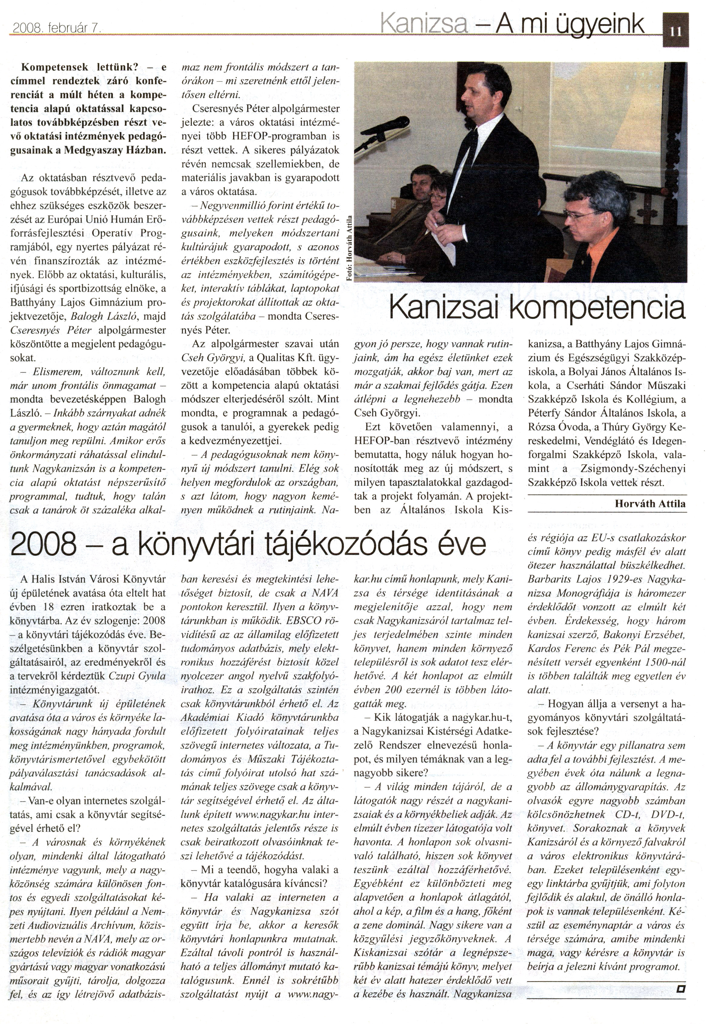 Nyilvános 1918 | 4184 | Kanizsa 2008. február 7. 11. oldal | 2008 - A könyvtári tájékozódás éve 2008 - a könyvtári tájékozódás éve A Halis István Városi Könyvtár új épületének avatása óta eltelt hat évben 18 ezren iratkoztak be a könyvtárba. Az év szlogenje: 2008 - a könyvtári tájékozódás éve. Beszélgetésünkben a könyvtár szolgáltatásairól, az eredményekről és a tervekről kérdeztük Czupi Gyula intézményigazgatót. - Könyvtárunk új épületének avatása óta a város és környéke lakosságának nagy hányada fordult meg intézményünkben, programok, könyvtárismertetővel egybekötött pályaválasztási tanácsadások alkalmával. - Van-e olyan internetes szolgáltatás, ami csak a könyvtár segítségével érhető el? - A városnak és környékének olyan, mindenki által látogatható intézménye vagyunk, mely a nagyközönség számára különösen fontos és egyedi szolgáltatásokat képes nyújtani. Ilyen például a Nemzeti Audiovizuális Archívum, közismertebb nevén a NAVA, mely az országos televíziók és rádiók magyar gyártású vagy magyar vonatkozású műsorait gyűjti, tárolja, dolgozza fel, és az így létrejövő adatbázis- ban keresési és megtekintési lehetőséget biztosit, de csak a NAVA pontokon keresztül. Ilyen a könyvtárunkban is működik. EBSCO rövidítésű az az államilag előfizetett tudományos adatbázis, mely elektronikus hozzáférést biztosit közel nyolcezer angol nyelvű szakfolyóirathoz. Ez a szolgáltatás szintén csak könyvtárunkból érhető el. Az Akadémiai Kiadó könyvtárunkba előfizetett folyóiratainak teljes szövegű internetes változata, a Tudományos és Műszaki Tájékoztatás című folyóirat utolsó hat számának teljes szövege csak a könyvtár segítségével érhető el. Az általunk épített www.nagykar.hu internetes szolgáltatás jelentős része is csak beiratkozott olvasóinknak teszi lehetővé a tájékozódást. - Mi a teendő, hogyha valaki a könyvtár katalógusára kíváncsi? - Ha valaki az interneten a könyvtár és Nagykanizsa szót együtt írja be, akkor a keresők könyvtári honlapunkra mutatnak. Ezáltal távoli pontról is használható a teljes állományt mutató katalógusunk. Ennél is sokrétűbb szolgáltatást nyújt a www. nagy- kar, hu című honlapunk, mely Kanizsa és térsége identitásának a megjelenítője azzal, hogy nem csak Nagykanizsáról tartalmaz teljes terjedelmében szinte minden könyvet, hanem minden környező településről is sok adatot tesz elérhetővé. A két honlapot az elmúlt évben 200 ezernél is többen látogatták meg. - Kik látogatják a nagykar.hu-t, a Nagykanizsai Kistérségi Adatkezelő Rendszer elnevezésű honlapot, és milyen témáknak van a legnagyobb sikere? — A világ minden tájáról, de a látogatók nagy részét a nagykanizsaiak és a környékbeliek adják. Az elmúlt évben tízezer látogatója volt havonta. A honlapon sok olvasnivaló található, hiszen sok könyvet teszünk ezáltal hozzáférhetővé. Egyébként ez különbözteti meg alapvetően a honlapok átlagától, ahol a kép, a film és a hang, főként a zene dominál. Nagy sikere van a közgyűlési jegyzökönyveknek. A Kiskanizsai szótár a legnépszerűbb kanizsai témájú könyv, melyet két év alatt hatezer érdeklődő vett a kezébe és használt. Nagykanizsa és régiója az EU-s csatlakozáskor című könyv pedig másfél év alatt ötezer használattal büszkélkedhet. Barbarits Lajos 1929-es Nagykanizsa Monográfiája is háromezer érdeklődőt vonzott az elmúlt két évben. Érdekesség, hogy három kanizsai szerző, Bakonyi Erzsébet, Kardos Ferenc és Pék Pál megzenésített versét egyenként 1500-nál is többen találták meg egyetlen év alatt. - Hogyan állja a versenyt a hagyományos könyvtári szolgáltatások fejlesztése? - A könyvtár egy pillanatra sem adta fel a további fejlesztést. A megyében évek óta nálunk a legnagyobb az állománygyarapítás. Az olvasók egyre nagyobb számban kölcsönözhetnek CD-t, DVD-t, könyvet. Sorakoznak a könyvek Kanizsáról és a környező falvakról a város elektronikus könyvtárában. Ezeket településenként egy-egy linktárba gyűjtjük, ami folyton fejlődik és alakul, de önálló honlapok is vannak településenként. Készül az eseménynaptár a város és térsége számára, amibe mindenki maga, vagy kérésre a könyvtár is beírja a jelezni kívánt programot. |