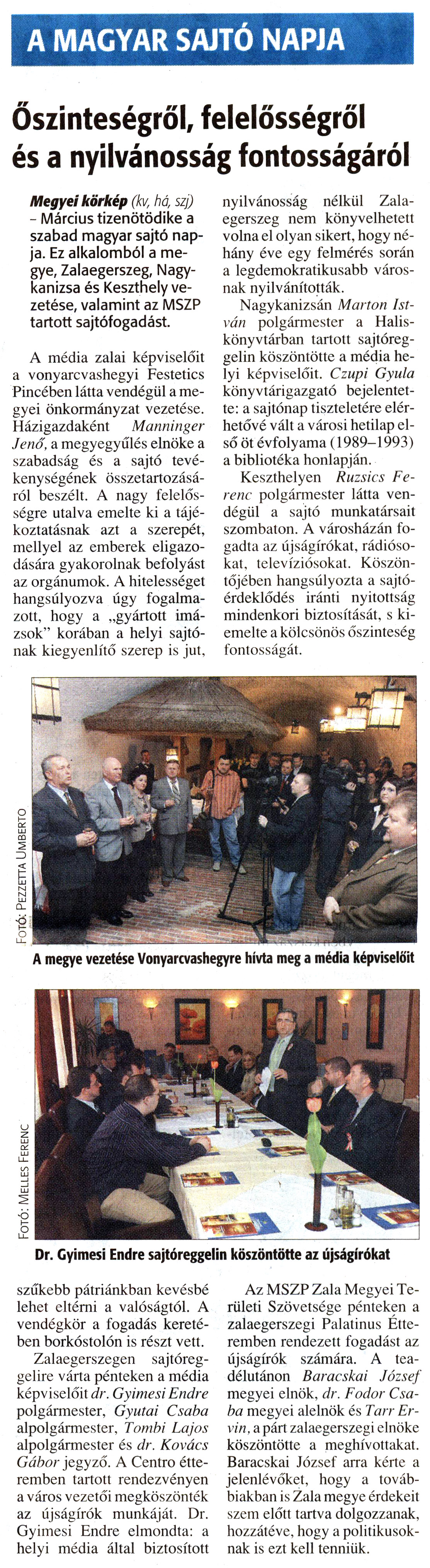 Nyilvános 1232 | 2645 | Zalai Hírlap 2008. március 17. 64. szám 4. oldal - A Magyar Sajtó Napja | A cikkben említett "városi hetilap első öt évfolyama (1989-1993)" a Kanizsa - Dél-Zalai Hetilap első öt évfolyamát jelenti. Elérhető a következő link mögött: http://www.nagykar.hu/ekonyvek/451.html Ugyanitt válik elérhetővé a lap minden további digitalizált példánya. Az eseményről, melyről a Zalai Hírlap tudósít, további képek találhatók a következő link mögött: http://www.nagykar.hu/keptar/2907.html A MAGYAR SAJTÓ NAPJA Őszinteségről, felelősségről és a nyilvánosság fontosságáról Megyei körkép (kvr há, szj) - Március tizenötödike a szabad magyar sajtó napja. Ez alkalomból a megye, Zalaegerszeg, Nagykanizsa és Keszthely vezetése, valamint az MSZP tartott sajtófogadást. A média zalai képviselőit a vonyarcvashegyi Festetics Pincében látta vendégül a megyei önkormányzat vezetése. Házigazdaként Manninger Jenő, a megyegyűlés elnöke a szabadság és a sajtó tevékenységének összetartozásáról beszélt. A nagy felelősségre utalva emelte ki a tájékoztatásnak azt a szerepét, mellyel az emberek eligazodására gyakorolnak befolyást az orgánumok. A hitelességet hangsúlyozva úgy fogalmazott, hogy a „gyártott imázsok" korában a helyi sajtónak kiegyenlítő szerep is jut, szűkebb pátriánkban kevésbé lehet eltérni a valóságtól. A vendégkör a fogadás keretében borkóstolón is részt vett. Zalaegerszegen sajtóreggelire várta pénteken a média képviselőit dr. Gyimesi Endre polgármester, Gyutai Csaba alpolgármester, Tombi Lajos alpolgármester és dr. Kovács Gábor jegyző. A Centro étteremben tartott rendezvényen a város vezetői megköszönték az újságírók munkáját. Dr. Gyimesi Endre elmondta: a helyi média által biztosított nyilvánosság nélkül Zalaegerszeg nem könyvelhetett volna el olyan sikert, hogy néhány éve egy felmérés során a legdemokratikusabb városnak nyilvánították. Nagykanizsán Marton István polgármester a Halis-könyvtárban tartott sajtóreggelin köszöntötte a média helyi képviselőit. Czupi Gyula könyvtárigazgató bejelentette: a sajtónap tiszteletére elérhetővé vált a városi hetilap első öt évfolyama (1989-1993) a bibliotéka honlapján. Keszthelyen Ruzsics Ferenc polgármester látta vendégül a sajtó munkatársait szombaton. A városházán fogadta az újságírókat, rádiósokat, televíziósokat. Köszöntőjében hangsúlyozta a sajtóérdeklődés iránti nyitottság mindenkori biztosítását, s kiemelte a kölcsönös őszinteség fontosságát. Az MSZP Zala Megyei Területi Szövetsége pénteken a zalaegerszegi Palatínus Étteremben rendezett fogadást az újságírók számára. A teadélutánon Baracskai József megyei elnök, dr. Fodor Csaba megyei alelnök és Tarr Er-vin, a párt zalaegerszegi elnöke köszöntötte a meghívottakat. Baracskai József arra kérte a jelenlévőket, hogy a továbbiakban is Zala megye érdekeit szem előtt tartva dolgozzanak, hozzátéve, hogy a politikusoknak is ezt kell tenniük. |