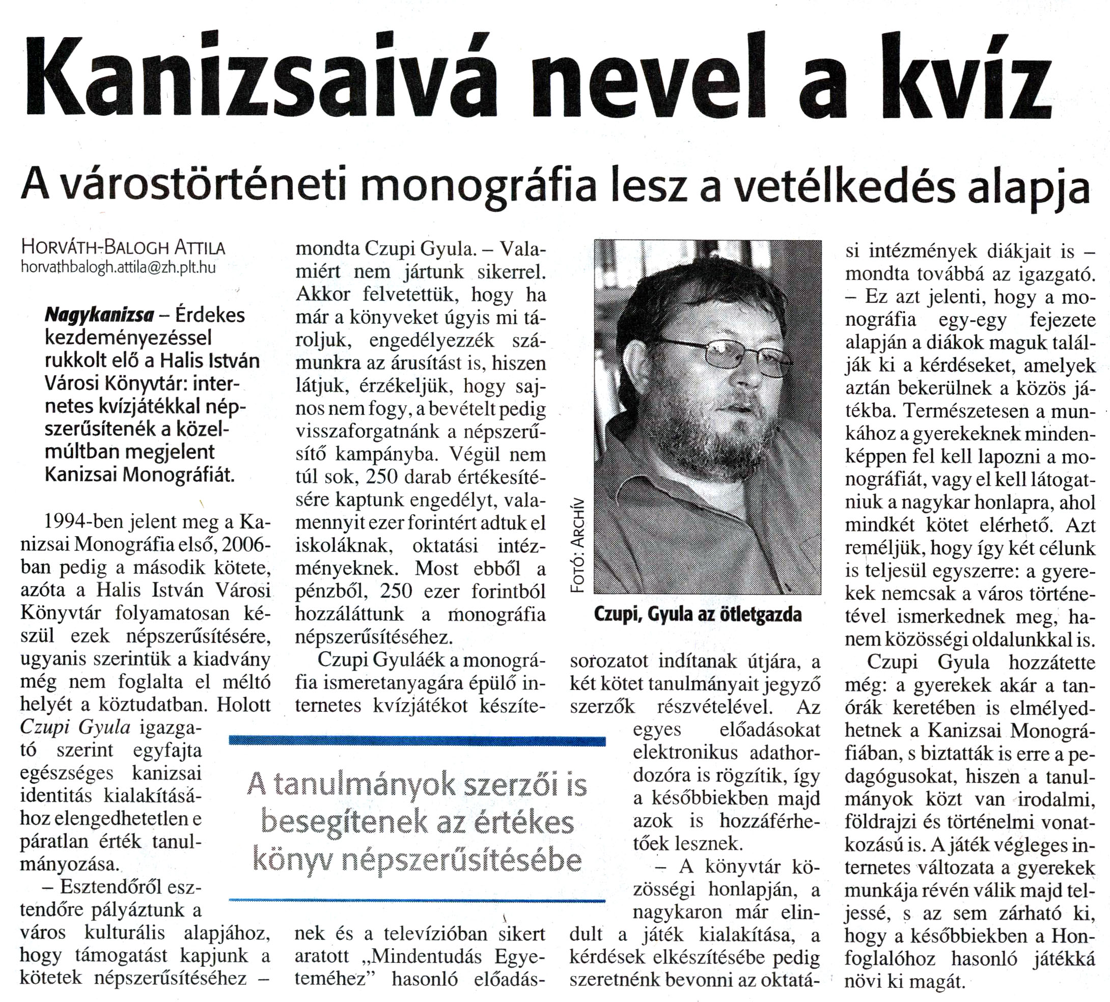 Nyilvános 1282 | 2034 | Zalai Hírlap 2008.09.29. 228. szám 7. oldal - Kanizsaivá nevel a kvíz | A cikk szövege: Kanizsaivá nevel a kvíz A várostörténeti monográfia lesz a vetélkedés alapja A tanulmányok szerzői is besegítenek az értékes könyv népszerűsítésébe Horváth-Balogh Attila horvathbalogh.attila@zh.plt.hu Nagykanizsa - Érdekes kezdeményezéssel rukkolt elő a Halis István Városi Könyvtár: internetes kvízjátékkal népszerűsítenék a közelmúltban megjelent Kanizsai Monográfiát. 1994-ben jelent meg a Kanizsai Monográfia első, 2006-ban pedig a második kötete, azóta a Halis István Városi Könyvtár folyamatosan készül ezek népszerűsítésére, ugyanis szerintük a kiadvány még nem foglalta el méltó helyét a köztudatban. Holott Czupi Gyula igazgató szerint egyfajta egészséges kanizsai identitás kialakításához elengedhetetlen e páratlan érték tanulmányozása. - Esztendőről esztendőre pályáztunk a város kulturális alapjához, hogy támogatást kapjunk a kötetek népszerűsítéséhez - mondta Czupi Gyula. - Valamiért nem jártunk sikerrel. Akkor felvetettük, hogy ha már a könyveket úgyis mi tároljuk, engedélyezzék számunkra az árusítást is, hiszen látjuk, érzékeljük, hogy sajnos nem fogy, a bevételt pedig visszaforgatnánk a népszerűsítő kampányba. Végül nem túl sok, 250 darab értékesítésére kaptunk engedélyt, valamennyit ezer forintért adtuk el iskoláknak, oktatási intézményeknek. Most ebből a pénzből, 250 ezer forintból hozzáláttunk a monográfia népszerűsítéséhez. Czupi Gyuláék a monográfia ismeretanyagára épülő internetes kvízjátékot készíte- nek és a televízióban sikert aratott „Mindentudás Egyeteméhez" hasonló előadás- Czupi, Gyula az ötletgazda sorozatot indítanak útjára, a két kötet tanulmányait jegyző szerzők részvételével. Az egyes előadásokat elektronikus adathordozóra is rögzítik, így a későbbiekben majd azok is hozzáférhetőek lesznek. - A könyvtár közösségi honlapján, a nagykaron már elindult a játék kialakítása, a kérdések elkészítésébe pedig szeretnénk bevonni az oktatá- si intézmények diákjait is -mondta továbbá az igazgató. - Ez azt jelenti, hogy a monográfia egy-egy fejezete alapján a diákok maguk találják ki a kérdéseket, amelyek aztán bekerülnek a közös játékba. Természetesen a munkához a gyerekeknek mindenképpen fel kell lapozni a monográfiát, vagy el kell látogatniuk a nagykar honlapra, ahol mindkét kötet elérhető. Azt reméljük, hogy így két célunk is teljesül egyszerre: a gyerekek nemcsak a város történetével ismerkednek meg, hanem közösségi oldalunkkal is. Czupi Gyula hozzátette még: a gyerekek akár a tanórák keretében is elmélyedhetnek a Kanizsai Monográfiában, s biztatták is erre a pedagógusokat, hiszen a tanulmányok közt van irodalmi, földrajzi és történelmi vonatkozású is. A játék végleges internetes változata a gyerekek munkája révén válik majd teljessé, s az sem zárható ki, hogy a későbbiekben a Honfoglalóhoz hasonló játékká növi ki magát. |