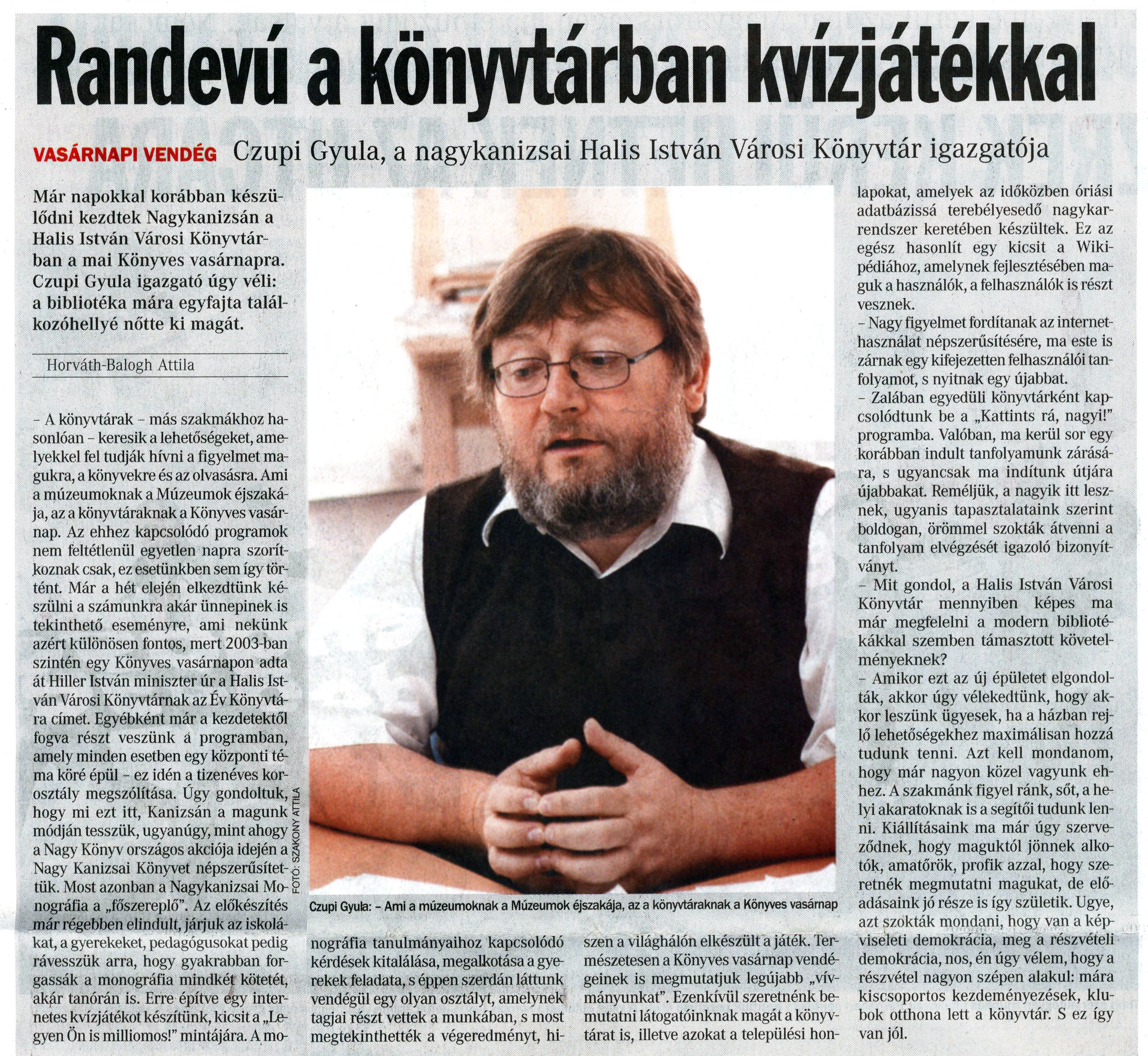 Nyilvános 1087 | 1727 | Vasárnapi Zalai Hírlap 2008. október 12. 041. szám 3. oldal - Randevú a könyvtárban kvízjátékkal | A cikk szövege: Randevú a könyvtárban kvízjátékkal vasárnapi vendég Czupi Gyula, a nagykanizsai Halis István Városi Könyvtár igazgatója Már napokkal korábban készülődni kezdtek Nagykanizsán a Halis István Városi Könyvtárban a mai Könyves vasárnapra. Czupi Gyula igazgató úgy véli: a bibliotéka mára egyfajta találkozóhellyé nőtte ki magát. Horváth-Balogh Attila - A könyvtárak - más szakmákhoz hasonlóan - keresik a lehetőségeket, amelyekkel fel tudják hívni a figyelmet magukra, a könyvekre és az olvasásra. Ami a múzeumoknak a Múzeumok éjszakája, az a könyvtáraknak a Könyves vasárnap. Az ehhez kapcsolódó programok nem feltétlenül egyetlen napra szorítkoznak csak, ez esetünkben sem így történt. Már a hét elején elkezdtünk készülni a számunkra akár ünnepinek is tekinthető eseményre, ami nekünk azért különösen fontos, mert 2003-ban szintén egy Könyves vasárnapon adta át Hiller István miniszter úr a Halis István Városi Könyvtárnak az Év Könyvtára címet. Egyébként már a kezdetektől fogva részt veszünk a programban, amely minden esetben egy központi téma köré épül - ez idén a tizenéves korosztály megszólítása. Úgy gondoltuk, hogy mi ezt itt, Kanizsán a magunk módján tesszük, ugyanúgy, mint ahogy a Nagy Könyv országos akciója idején a Nagy Kanizsai Könyvet népszerűsítettük. Most azonban a Nagykanizsai Monográfia a „főszereplő". Az előkészítés már régebben elindult, járjuk az iskolákat, a gyerekeket, pedagógusokat pedig rávesszük arra, hogy gyakrabban forgassák a monográfia mindkét kötetét, akár tanórán is. Erre építve égy internetes kvízjátékot készítünk, kicsit a „Legyen Ön is milliomos!" mintájára. A mo- Czupi Gyula: - Ami a múzeumoknak a Múzeumok éjszakája, az a könyvtáraknak a Könyves vasárnap nográfia tanulmányaihoz kapcsolódó kérdések kitalálása, megalkotása a gyerekek feladata, s éppen szerdán láttunk vendégül egy olyan osztályt, amelynek tagjai részt vettek a munkában, s most megtekinthették a végeredményt, hi- szen a világhálón elkészült a játék. Természetesen a Könyves vasárnap vendégeinek is megmutatjuk legújabb „vívmányunkat". Ezenkívül szeretnénk bemutatni látogatóinknak magát a könyvtárat is, illetve azokat a települési hon- lapokat, amelyek az időközben óriási adatbázissá terebélyesedő nagykarrendszer keretében készültek. Ez az egész hasonlít egy kicsit a Wikipédiához, amelynek fejlesztésében maguk a használók, a felhasználók is részt vesznek. - Nagy figyelmet fordítanak az internethasználat népszerűsítésére, ma este is zárnak egy kifejezetten felhasználói tanfolyamot, s nyitnak egy újabbat. - Zalában egyedüli könyvtárként kapcsolódtunk be a „Kattints rá, nagyi!" programba. Valóban, ma kerül sor egy korábban indult tanfolyamunk zárására, s ugyancsak ma indítunk útjára újabbakat Reméljük, a nagyik itt lesznek, ugyanis tapasztalataink szerint boldogan, örömmel szokták átvenni a tanfolyam elvégzését igazoló bizonyítványt. - Mit gondol, a Halis István Városi Könyvtár mennyiben képes ma már megfelelni a modern bibliotékákkal szemben támasztott követelményeknek? - Amikor ezt az új épületet elgondolták, akkor úgy vélekedtünk, hogy akkor leszünk ügyesek, ha a házban rejlő lehetőségekhez maximálisan hozzá tudunk tenni. Azt kell mondanom, hogy már nagyon közel vagyunk ehhez. A szakmánk figyel ránk, sőt, a helyi akaratoknak is a segítői tudunk lenni. Kiállításaink ma már úgy szerveződnek, hogy maguktól jönnek alkotók, amatőrök, profik azzal, hogy szeretnék megmutatni magukat, de előadásaink jó része is így születik. Ugye, azt szokták mondani, hogy van a képviseleti demokrácia, meg a részvételi demokrácia, nos, én úgy vélem, hogy a részvétel nagyon szépen alakul: mára kiscsoportos kezdeményezések, klubok otthona lett a könyvtár. S ez így van jól. |
