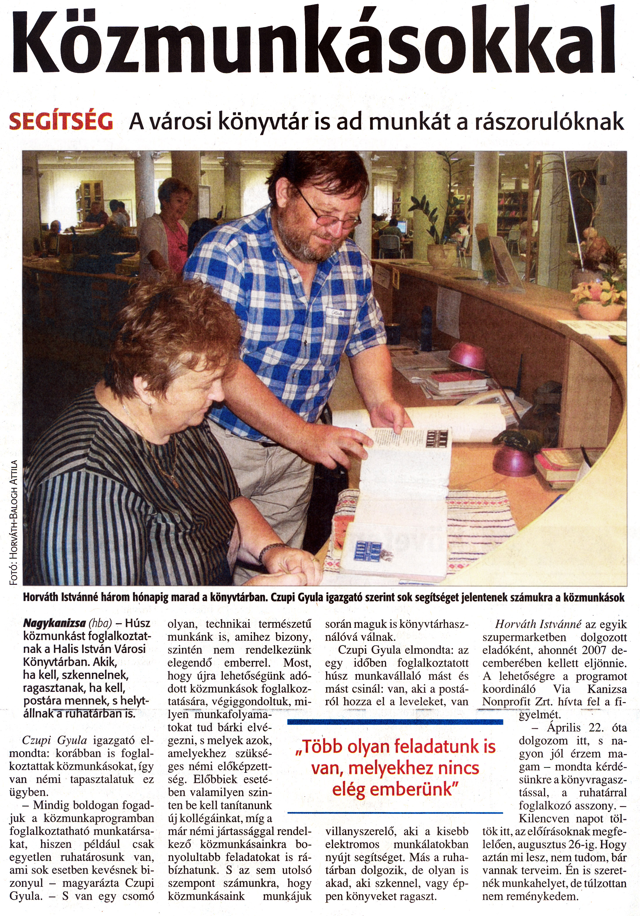 Nyilvános 1082 | 1435 | Zalai Hírlap 2009 05 26 122sz 14old - Közmunkásokkal | A cikk szövege: Közmunkásokkal SEGÍTSÉG A városi könyvtár is ad munkát a rászorulóknak „Több olyan feladatunk is van, melyekhez nincs elég emberünk" Horváth Istvánné három hónapig marad a könyvtárban. Czupi Gyula igazgató szerint sok segítséget jelentenek számukra a közmunkások Nagykanizsa (hba) - Húsz közmunkást foglalkoztatnak a Halis István Városi Könyvtárban. Akik, ha kell, szkennelnek, ragasztanak, ha kell, postára mennek, s helytállnak a ruhatárban is. Czupi Gyula igazgató elmondta: korábban is foglalkoztattak közmunkásokat, így van némi tapasztalatuk ez ügyben. - Mindig boldogan fogadjuk a közmunkaprogramban foglalkoztatható munkatársakat, hiszen például csak egyetlen ruhatárosunk van, ami sok esetben kevésnek bizonyul - magyarázta Czupi Gyula. - S van egy csomó olyan, technikai természetű munkánk is, amihez bizony, szintén nem rendelkezünk elegendő emberrel. Most, hogy újra lehetőségünk adódott közmunkások foglalkoztatására, végiggondoltuk, milyen munkafolyama-tokat tud bárki elvégezni, s melyek azok, amelyekhez szükséges némi előképzettség. Előbbiek esetében valamilyen szinten be kell tanítanunk új kollégáinkat, míg a már némi jártassággal rendelkező közmunkásainkra bonyolultabb feladatokat is rábízhatunk. S az sem utolsó szempont számunkra, hogy közmunkásaink munkájuk során maguk is könyvtárhasználóvá válnak. Czupi Gyula elmondta: az egy időben foglalkoztatott húsz munkavállaló mást és mást csinál: van, aki a postáról hozza el a leveleket, van villanyszerelő, aki a kisebb elektromos munkálatokban nyújt segítséget. Más a ruhatárban dolgozik, de olyan is akad, aki szkennel, vagy éppen könyveket ragaszt. Horváth Istvánné az egyik szupermarketben dolgozott eladóként, ahonnét 2007 decemberében kellett eljönnie. A lehetőségre a programot koordináló Via Kanizsa Nonprofit Zrt. hívta fel a figyelmét. - Április 22. óta dolgozom itt, s nagyon jól érzem magam - mondta kérdésünkre a könyvragasztással, a ruhatárral foglalkozó asszony. - Kilencven napot töltök itt, az előírásoknak megfelelően, augusztus 26-ig. Hogy aztán mi lesz, nem tudom, bár vannak terveim. Én is szeretnék munkahelyet, de túlzottan nem reménykedem. |