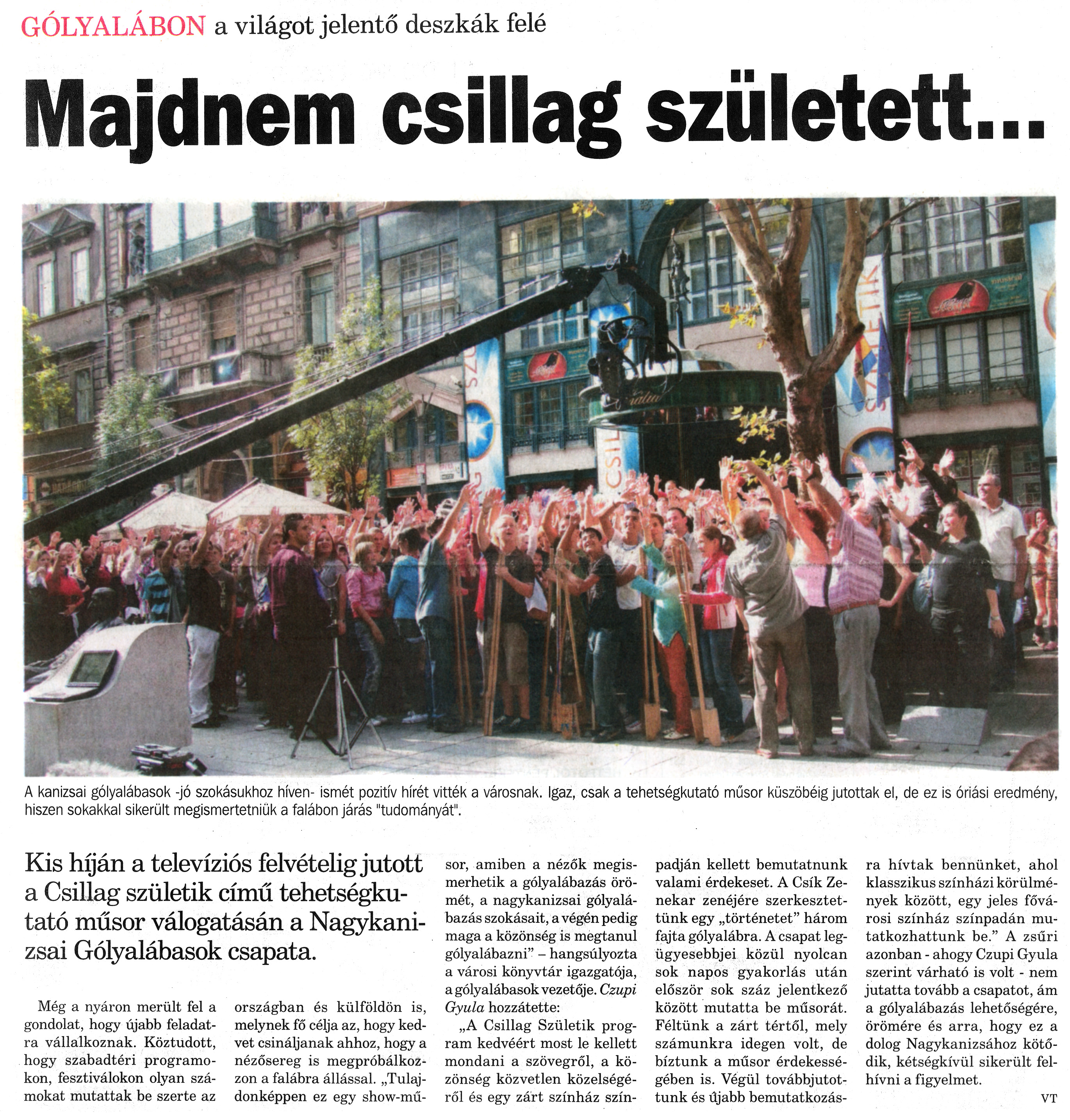 Nyilvános 1591 | 2489 | Nagykanizsai Maraton 2009.10.09. 040. szám 1. oldal - Majdnem csillag született | A cikk szövege: GÓLYALÁBON a világot jelentő deszkák felé Majdnem csillag született... Kis híján a televíziós felvételig jutott a Csillag születik című tehetségkutató műsor válogatásán a Nagykanizsai Gólyalábasok csapata. A kanizsai gólyalábasok - jó szokásukhoz híven - ismét pozitív hírét vitték a városnak. Igaz, csak a tehetségkutató műsor küszöbéig jutottak el, de ez is óriási eredmény, hiszen sokakkal sikerült megismertetniük a falábon járás "tudományát". Még a nyáron merült fel a gondolat, hogy újabb feladatra vállalkoznak. Köztudott, hogy szabadtéri programokon, fesztiválokon olyan számokat mutattak be szerte az országban és külföldön is, melynek fő célja az, hogy kedvet csináljanak ahhoz, hogy a nézősereg is megpróbálkozzon a falábra állással. „Tulajdonképpen ez egy show-műsor, amiben a nézők megismerhetik a gólyalábazás örömét, a nagykanizsai gólyalábazás szokásait, a végén pedig maga a közönség is megtanul gólyalábazni" - hangsúlyozta a városi könyvtár igazgatója, a gólyalábasok vezetője. Czupi Gyula hozzátette: „A Csillag Születik program kedvéért most le kellett mondani a szövegről, a közönség közvetlen közelségéről és egy zárt színház színpadján kellett bemutatnunk valami érdekeset. A Csík Zenekar zenéjére szerkesztettünk egy „történetet" három fajta gólyalábra. A csapat legügyesebbjei közül nyolcan sok napos gyakorlás után először sok száz jelentkező között mutatta be műsorát. Féltünk a zárt tértől, mely számunkra idegen volt, de bíztunk a műsor érdekességében is. Végül továbbjutottunk és újabb bemutatkozásra hívtak bennünket, ahol klasszikus színházi körülmények között, egy jeles fővárosi színház színpadán mutatkozhattunk be." A zsűri azonban - ahogy Czupi Gyula szerint várható is volt - nem jutatta tovább a csapatot, ám a gólyalábazás lehetőségére, örömére és arra, hogy ez a dolog Nagykanizsához kötődik, kétségkívül sikerült felhívni a figyelmet. VT |