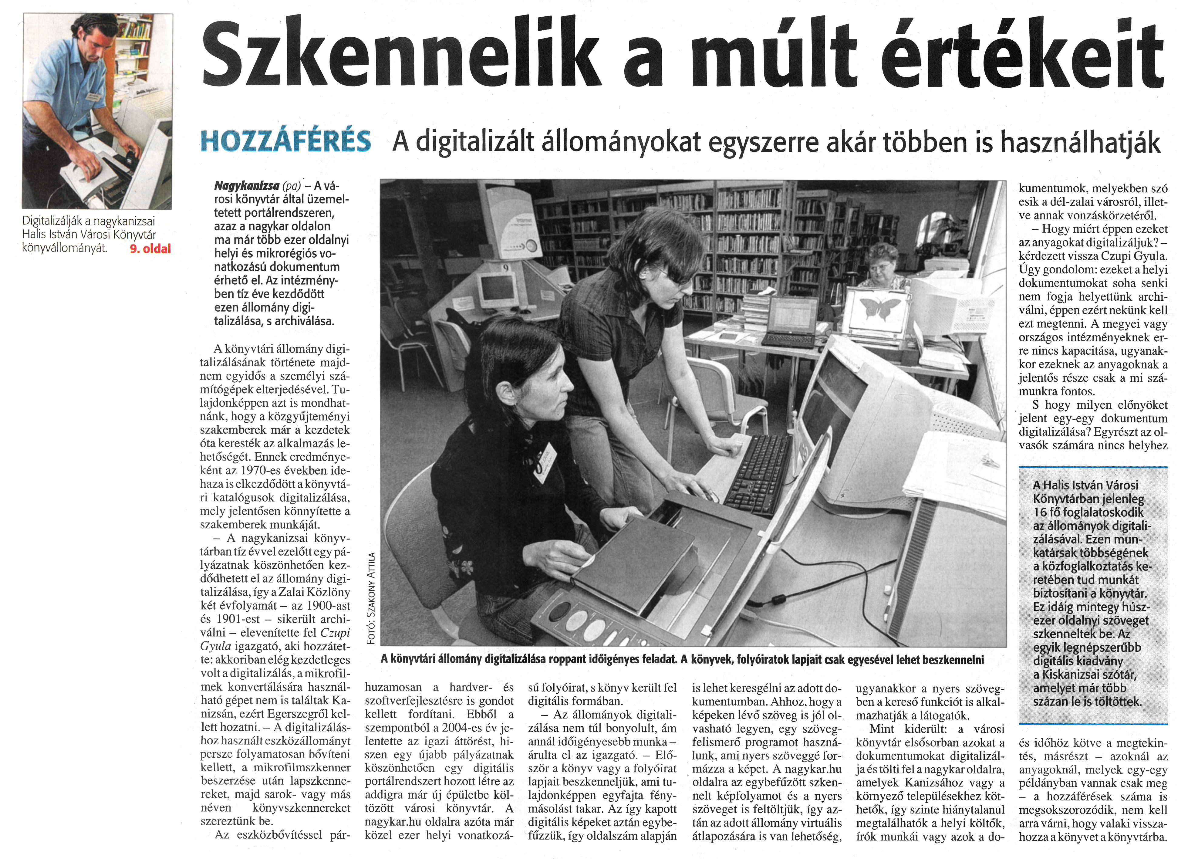 Nyilvános 1109 | 1510 | Zalai Hírlap 2009.10.08. 236. szám 9. oldal - Szkennelik a múlt értékeit | A cikk szövege: Digitalizálják a nagykanizsai Halis István Városi Könyvtár könyvállományát. 9. oldal Szkennelik a múlt értékeit A könyvtári állomány digitalizálása roppant időigényes feladat. A könyvek, folyóiratok lapjait csak egyesével lehet beszkennelni HOZZÁFÉRÉS A digitalizált állományokat egyszerre akar többen is használhatják Nagykanizsa (pa) - A városi könyvtár által üzemeltetett portálrendszeren, azaz a nagykar oldalon ma már több ezer oldalnyi helyi és mikrorégiós vonatkozású dokumentum érhető el. Az intézményben tíz éve kezdődött ezen állomány digitalizálása, s archiválása. A könyvtári állomány digitalizálásának története majdnem egyidős a személyi számítógépek elterjedésével. Tulajdonképpen azt is mondhatnánk, hogy a közgyűjteményi szakemberek már a kezdetek óta keresték az alkalmazás lehetőségét. Ennek eredményeként az 1970-es években idehaza is elkezdődött a könyvtári katalógusok digitalizálása, mely jelentősen könnyítette a szakemberek munkáját. - A nagykanizsai könyvtárban tíz évvel ezelőtt egy pályázatnak köszönhetően kezdődhetett el az állomány digitalizálása, így a Zalai Közlöny két évfolyamát - az 1900-ast és 190l-est - sikerült archiválni - elevenítette fel Czupi Gyula igazgató, aki hozzátette: akkoriban elég kezdetleges volt a digitalizálás, a mikrofilmek konvertálására használható gépet nem is találtak Kanizsán, ezért Egerszegről kellett hozatni. - A digitalizáláshoz használt eszközállományt persze folyamatosan bővíteni kellett, a mikrofilmszkenner beszerzése után lapszkennereket, majd sarok- vagy más néven könyvszkennereket szereztünk be. Az eszközbővítéssel párhuzamosan a hardver- és szoftverfejlesztésre is gondot kellett fordítani. Ebből a szempontból a 2004-es év jelentette az igazi áttörést, hiszen egy újabb pályázatnak köszönhetően egy digitális portálrendszert hozott létre az addigra már új épületbe költözött városi könyvtár. A nagykar.hu oldalra azóta már közel ezer helyi vonatkozású folyóirat, s könyv került fel digitális formában. - Az állományok digitalizálása nem túl bonyolult, ám annál időigényesebb munka -árulta el az igazgató. - Először a könyv vagy a folyóirat lapjait beszkenneljük, ami tulajdonképpen egyfajta fénymásolást takar. Az így kapott digitális képeket aztán egybefűzzük, így oldalszám alapján is lehet keresgélni az adott dokumentumban. Ahhoz, hogy a képeken lévő szöveg is jól olvasható legyen, egy szövegfelismerő programot használunk, ami nyers szöveggé formázza a képet. A nagykar.hu oldalra az egybefűzött szkennert képfolyamot és a nyers szöveget is feltöltjük, így aztán az adott állomány virtuális átlapozására is van lehetőség, ugyanakkor a nyers szövegben a kereső funkciót is alkalmazhatják a látogatók. Mint kiderült: a városi könyvtár elsősorban azokat a dokumentumokat digitalizálja és tölti fel a nagykar oldalra, amelyek Kanizsához vagy a környező településekhez köthetők, így szinte hiánytalanul megtalálhatók a helyi költők, írók munkái vagy azok a dokumentumok, melyekben szó esik a dél-zalai városról, illetve annak vonzáskörzetéről. - Hogy miért éppen ezeket az anyagokat digitalizáljuk? -kérdezett vissza Czupi Gyula. Úgy gondolom: ezeket a helyi dokumentumokat soha senki nem fogja helyettünk archiválni, éppen ezért nekünk kell ezt megtenni. A megyei vagy országos intézményeknek erre nincs kapacitása, ugyanakkor ezeknek az anyagoknak a jelentős része csak a mi számunkra fontos. S hogy milyen előnyöket jelent egy-egy dokumentum digitalizálása? Egyrészt az olvasók számára nincs helyhez A Halis István Városi Könyvtárban jelenleg 16 fő foglalatoskodik az állományok digitalizálásával. Ezen munkatársak többségének a közfoglalkoztatás keretében tud munkát biztosítani a könyvtár. Ez idáig mintegy húszezer oldalnyi szöveget szkenneltek be. Az egyik legnépszerűbb digitális kiadvány a Kiskanizsai szótár, amelyet már több százan le is töltöttek. és időhöz kötve a megtekintés, másrészt - azoknál az anyagoknál, melyek egy-egy példányban vannak csak meg - a hozzáférések száma is megsokszorozódik, nem kell arra várni, hogy valaki visszahozza a könyvet a könyvtárba. |