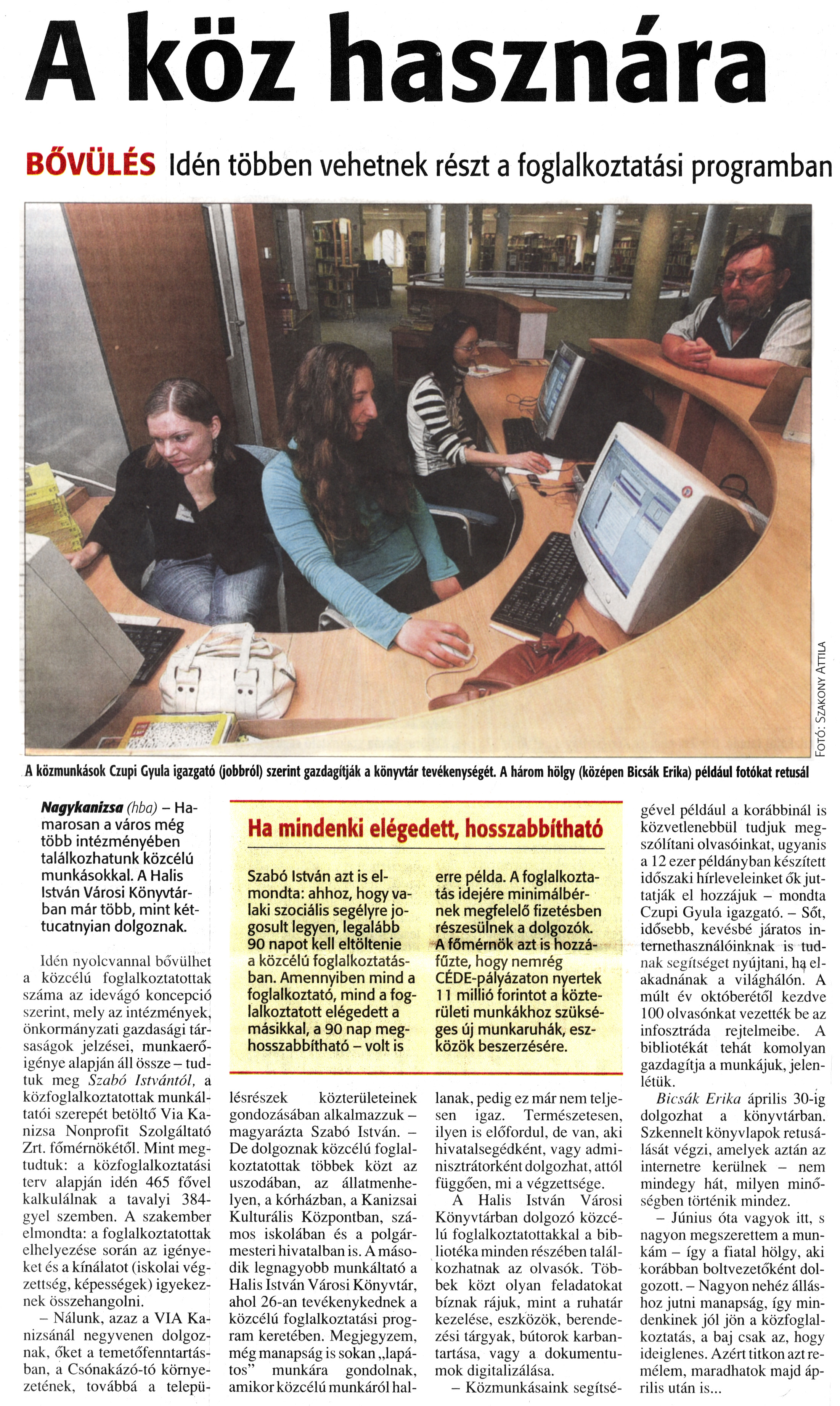 Nyilvános 1046 | 1576 | Zalai Hírlap 2010. március 23. 68. szám 5. oldal - A köz hasznára | A cikk szövege: A köz hasznára BŐVÜLÉS Idén többen vehetnek részt a foglalkoztatási programban A közmunkások Czupi Gyula igazgató (jobbról) szerint gazdagítják a könyvtár tevékenységét. A három hölgy (középen Bicsak Erika) például fotókat retusál Ha mindenki elégedett, hosszabbítható Szabó István azt is elmondta: ahhoz, hogy valaki szociális segélyre jogosult legyen, legalább 90 napot kell eltöltenie a közcélú foglalkoztatásban. Amennyiben mind a foglalkoztató, mind a foglalkoztatott elégedett a másikkal, a 90 nap meghosszabbítható - volt is erre példa. A foglalkoztatás idejére minimálbérnek megfelelő fizetésben részesülnek a dolgozók. A főmérnök azt is hozzáfűzte, hogy nemrég CÉDE-pályázaton nyertek 11 millió forintot a közterületi munkákhoz szükséges új munkaruhák, eszközök beszerzésére. Nagykanizsa (hba) - Hamarosan a város még több intézményében találkozhatunk közcélú munkásokkal. A Halis István Városi Könyvtárban már több, mint két-tucatnyian dolgoznak. Idén nyolcvannal bővülhet a közcélú foglalkoztatottak száma az idevágó koncepció szerint, mely az intézmények, önkormányzati gazdasági társaságok jelzései, munkaerőigénye alapján áll össze - tudtuk meg Szabó Istvántól, a közfoglalkoztatottak munkáltatói szerepét betöltő Via Kanizsa Nonprofit Szolgáltató Zrt. főmérnökétől. Mint megtudtuk: a közfoglalkoztatási terv alapján idén 465 fővel kalkulálnak a tavalyi 384-gyel szemben. A szakember elmondta: a foglalkoztatottak elhelyezése során az igényeket és a kínálatot (iskolai végzettség, képességek) igyekeznek összehangolni. - Nálunk, azaz a VIA Kanizsánál negyvenen dolgoznak, őket a temetőfenntartásban, a Csónakázó-tó környezetének, továbbá a településrészek közterületeinek gondozásában alkalmazzuk -magyarázta Szabó István. — De dolgoznak közcélú foglalkoztatottak többek közt az uszodában, az állatmenhelyen, a kórházban, a Kanizsai Kulturális Központban, számos iskolában és a polgármesteri hivatalban is. A második legnagyobb munkáltató a Halis István Városi Könyvtár, ahol 26-án tevékenykednek a közcélú foglalkoztatási program keretében. Megjegyzem, még manapság is sokan „lapátos" munkára gondolnak, amikor közcélú munkáról hallanak, pedig ez már nem teljesen igaz. Természetesen, ilyen is előfordul, de van, aki hivatalsegédként, vagy adminisztrátorként dolgozhat, attól függően, mi a végzettsége. A Halis István Városi Könyvtárban dolgozó közcélú foglalkoztatottakkal a bibliotéka minden részében találkozhatnak az olvasók. Többek közt olyan feladatokat bíznak rájuk, mint a ruhatár kezelése, eszközök, berendezési tárgyak, bútorok karbantartása, vagy a dokumentumok digitalizálása. - Közmunkásaink segítségével például a korábbinál is közvetlenebbül tudjuk megszólítani olvasóinkat, ugyanis a 12 ezer példányban készített időszaki hírleveleinket ők juttatják el hozzájuk - mondta Czupi Gyula igazgató. - Sőt, idősebb, kevésbé járatos internethasználóinknak is tudnak segítséget nyújtani, ha elakadnának a világhálón. A múlt év októberétől kezdve 100 olvasónkat vezették be az infosztráda rejtelmeibe. A bibliotékát tehát komolyan gazdagítja a munkájuk, jelenlétük. Bicsak Erika április 30-ig dolgozhat a könyvtárban. Szkennelt könyvlapok retusálását végzi, amelyek aztán az internetre kerülnek - nem mindegy hát, milyen minőségben történik mindez. - Június óta vagyok itt, s nagyon megszerettem a munkám - így a fiatal hölgy, aki korábban boltvezetőként dolgozott. - Nagyon nehéz álláshoz jutni manapság, így mindenkinek jól jön a közfoglalkoztatás, a baj csak az, hogy ideiglenes. Azért titkon azt remélem, maradhatok majd április után is... |