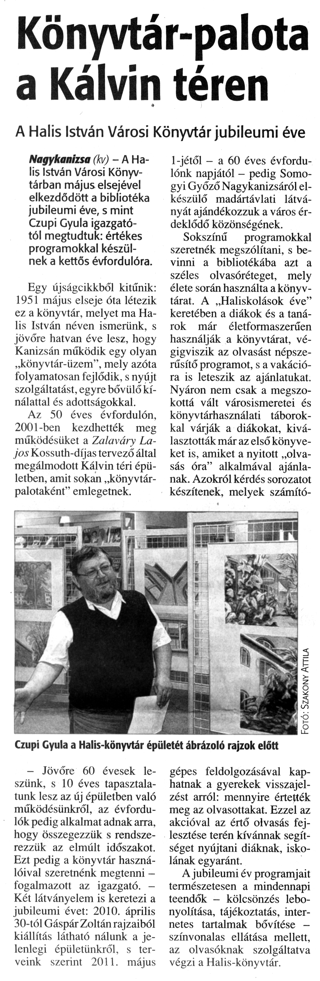 Nyilvános 1100 | 1711 | Zalai Hírlap 2010. május 10. 107. szám 7. oldal - Könyvtár-palota a Kálvin téren | A cikk szövege: Könyvtár-palota a Kálvin téren A Halis István Városi Könyvtár jubileumi éve Nagykanizsa (kv) - A Halis István Városi Könyvtárban május elsejével elkezdődött a bibliotéka jubileumi éve, s mint Czupi Gyula igazgatótól megtudtuk: értékes programokkal készülnek a kettős évfordulóra. Egy újságcikkből kitűnik: 1951 május elseje óta létezik ez a könyvtár, melyet ma Halis István néven ismerünk, s jövőre hatvan éve lesz, hogy Kanizsán működik egy olyan „könyvtár-üzem”, mely azóta folyamatosan fejlődik, s nyújt szolgáltatást, egyre bővülő kínálattal és adottságokkal. Az 50 éves évfordulón, 2001-ben kezdhették meg működésüket a Zalaváry Lajos Kossuth-díjas tervező által megálmodott Kálvin téri épületben, amit sokan „könyvtárpalotaként" emlegetnek. - Jövőre 60 évesek leszünk, s 10 éves tapasztalatunk lesz az új épületben való működésünkről, az évfordulók pedig alkalmat adnak arra, hogy összegezzük s rendszerezzük az elmúlt időszakot. Ezt pedig a könyvtár használóival szeretnénk megtenni -fogalmazott az igazgató. -Két látványelem is keretezi a jubileumi évet: 2010. április 30-tól Gáspár Zoltán rajzaiból kiállítás látható nálunk a jelenlegi épületünkről, s terveink szerint 2011. május 1-jétől - a 60 éves évfordulónk napjától - pedig Somogyi Győző Nagykanizsáról elkészülő madártávlati látványát ajándékozzuk a város érdeklődő közönségének. Sokszínű programokkal szeretnék megszólítani, s bevinni a bibliotékába azt a széles olvasóréteget, mely élete során használta a könyvtárat. A „Haliskolások éve” keretében a diákok és a tanárok már életformaszerűen használják a könyvtárat, végigviszik az olvasást népszerűsítő programot, s a vakációra is leteszik az ajánlatukat. Nyáron nem csak a megszokottá vált városismeretei és könyvtárhasználati táborokkal várják a diákokat, kiválasztották már az első könyveket is, amiket a nyitott „olvasás óra" alkalmával ajánlanak. Azokról kérdés sorozatot készítenek, melyek számítógépes feldolgozásával kaphatnak a gyerekek visszajelzést arról: mennyire értették meg az olvasottakat. Ezzel az akcióval az értő olvasás fejlesztése terén kívánnak segítséget nyújtani diáknak, iskolának egyaránt. A jubileumi év programjait természetesen a mindennapi teendők - kölcsönzés lebonyolítása, tájékoztatás, internetes tartalmak bővítése -színvonalas ellátása mellett, az olvasóknak szolgáltatva végzi a Halis-könyvtár. Czupi Gyula a Halis-könyvtár épületét ábrázoló rajzok előtt |