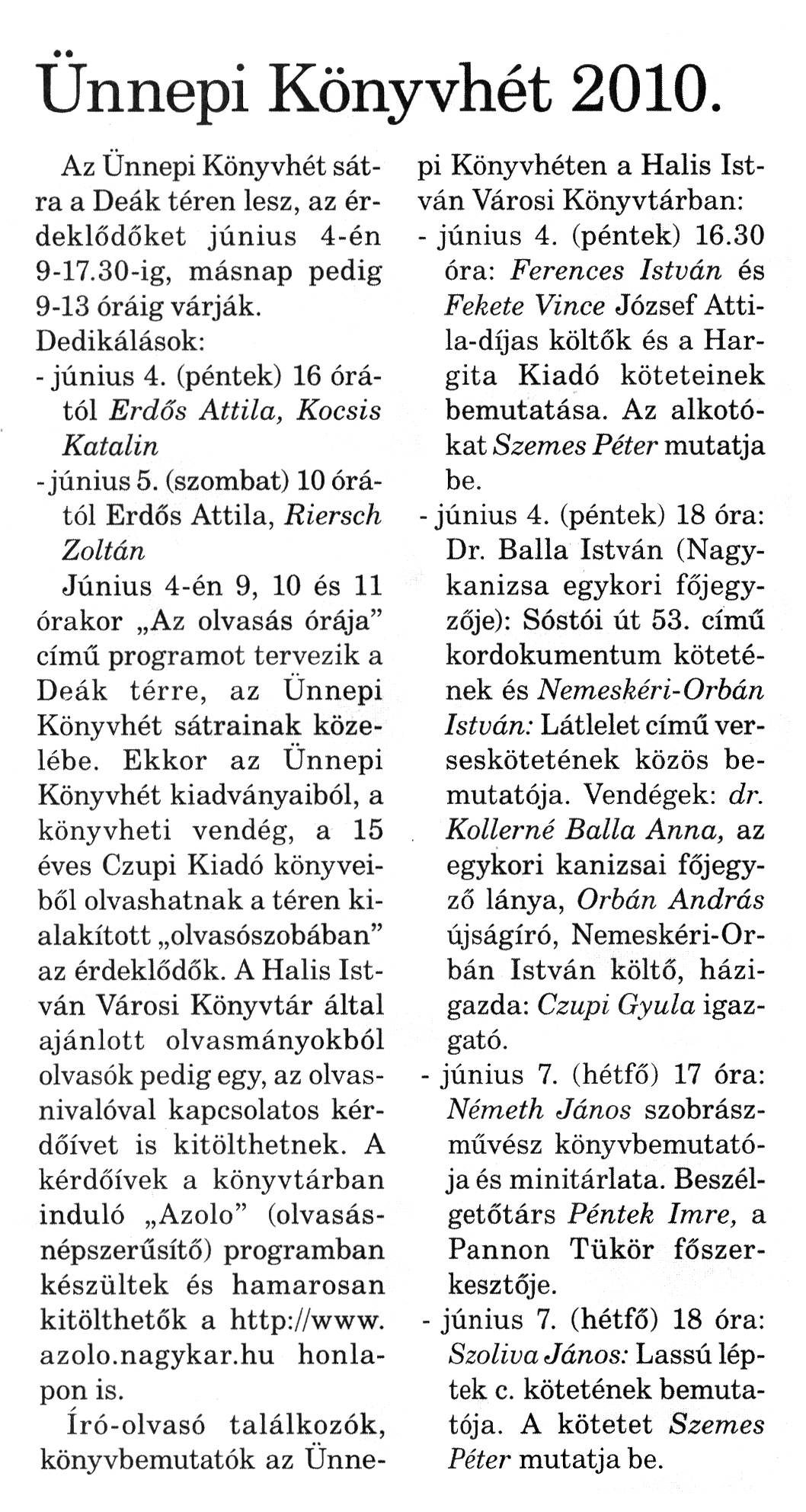 Nyilvános 1121 | 1564 | Nagykanizsai Maraton 2010. június 4. 022. szám 2. oldal - Ünnepi Könyvhét 2010 | A cikk szövege: Ünnepi Könyvhét 2010. Az Ünnepi Könyvhét sátra a Deák téren lesz, az érdeklődőket június 4-én 9-17.30-ig, másnap pedig 9-13 óráig várják. Dedikálások: - június 4. (péntek) 16 órától Erdős Attila, Kocsis Katalin -június 5. (szombat) 10 órától Erdős Attila, Riersch Zoltán Június 4-én 9, 10 és 11 órakor „Az olvasás órája" című programot tervezik a Deák térre, az Ünnepi Könyvhét sátrainak közelébe. Ekkor az Ünnepi Könyvhét kiadványaiból, a könyvheti vendég, a 15 éves Czupi Kiadó könyveiből olvashatnak a téren kialakított „olvasószobában" az érdeklődők. A Halis István Városi Könyvtár által ajánlott olvasmányokból olvasók pedig egy, az olvasnivalóval kapcsolatos kérdőívet is kitölthetnek. A kérdőívek a könyvtárban induló „Azolo" (olvasásnépszerűsítő) programban készültek és hamarosan kitölthetők a http://www. azolo.nagykar.hu honlapon is. író-olvasó találkozók, könyvbemutatók az Ünne- pi Könyvhéten a Halis István Városi Könyvtárban: - június 4. (péntek) 16.30 óra: Ferences István és Fekete Vince József Attila-díjas költők és a Hargita Kiadó köteteinek bemutatása. Az alkotókat Szemes Péter mutatja be. - június 4. (péntek) 18 óra: Dr. Balla István (Nagykanizsa egykori főjegyzője): Sóstói út 53. című kordokumentum kötetének és Nemeskéri-Orbán István: Látlelet című verseskötetének közös bemutatója. Vendégek: dr. Kollerné Balla Anna, az egykori kanizsai főjegyző lánya, Orbán András újságíró, Nemeskéri-Orbán István költő, házigazda: Czupi Gyula igazgató. - június 7. (hétfő) 17 óra: Németh János szobrászművész könyvbemutatója és minitárlata. Beszélgetőtárs Péntek Imre, a Pannon Tükör főszerkesztője. - június 7. (hétfő) 18 óra: Szoliva János: Lassú léptek c. kötetének bemutatója. A kötetet Szemes Péter mutatja be. |
