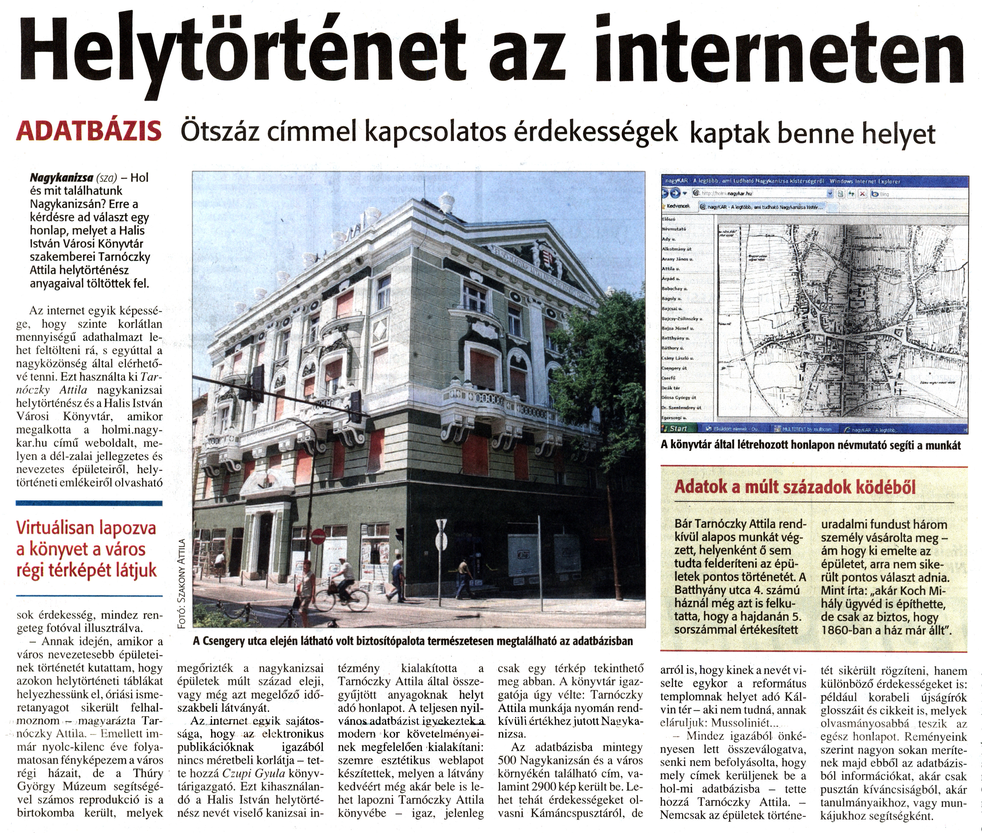 Nyilvános 1357 | 1983 | Zalai Hírlap 2010. július 8. 157. szám 13. oldal - Helytörténet az interneten | A cikk szövege: Helytörténet az interneten ADATBÁZIS Ötszáz címmel kapcsolatos érdekességek kaptak benne helyet Virtuálisan lapozva a könyvet a város régi térképét látjuk Nagykanizsa (sza) - Hol és mit találhatunk Nagykanizsán? Erre a kérdésre ad választ egy honlap, melyet a Halis István Városi Könyvtár szakemberei Tarnóczky Attila helytörténész anyagaival töltöttek fel. Az internet egyik képessége, hogy szinte korlátlan mennyiségű adathalmazt lehet feltölteni rá, s egyúttal a nagyközönség által elérhetővé tenni. Ezt használta ki Tarnóczky Attila nagykanizsai helytörténész és a Halis István Városi Könyvtár, amikor megalkotta a holmi.nagykar.hu című weboldalt, melyen a dél-zalai jellegzetes és nevezetes épületeiről, helytörténeti emlékeiről olvasható sok érdekesség, mindez rengeteg fotóval illusztrálva. - Annak idején, amikor a város nevezetesebb épületeinek történetét kutattam, hogy azokon helytörténeti táblákat helyezhessünk el, óriási ismeretanyagot sikerült felhalmoznom - magyarázta Tarnóczky Attila. - Emellett immár nyolc-kilenc éve folyamatosan fényképezem a város régi házait, de a Thúry György Múzeum segítségével számos reprodukció is a birtokomba került, melyek megőrizték a nagykanizsai épületek múlt század eleji, vagy még azt megelőző időszakbeli látványát. Az internet egyik sajátossága, hogy az elektronikus publikációknak igazából nincs méretbeli korlátja - tette hozzá Czupi Gyula könyvtárigazgató. Ezt kihasználandó a Halis István helytörténész nevét viselő kanizsai intézmény kialakította a Tarnóczky Attila által összegyűjtött anyagoknak helyt adó honlapot. A teljesen nyilvános adatbázist igyekeztek a modern kor követelményeinek megfelelően kialakítani: szemre esztétikus weblapot készítettek, melyen a látvány kedvéért még akár bele is lehet lapozni Tarnóczky Attila könyvébe - igaz, jelenleg csak egy térkép tekinthető meg abban. A könyvtár igazgatója úgy vélte: Tarnóczky Attila munkája nyomán rendkívüli értékhez jutott Nagykanizsa. Az adatbázisba mintegy 500 Nagykanizsán és a város környékén található cím, valamint 2900 kép került be. Lehet tehát érdekességeket olvasni Kámáncspusztáról, de arról is, hogy kinek a nevét viselte egykor a református templomnak helyet adó Kálvin tér - aki nem tudná, annak eláruljuk: Mussoliniét... - Mindez igazából önkényesen lett összeválogatva, senki nem befolyásolta, hogy mely címek kerüljenek be a hol-mi adatbázisba - tette hozzá Tarnóczky Attila. -Nemcsak az épületek történetét sikerült rögzíteni, hanem különböző érdekességeket is: például korabeli újságírók glosszáit és cikkeit is, melyek olvasmányosabbá teszik az egész honlapot. Reményeink szerint nagyon sokan merítenek majd ebből az adatbázisból információkat, akár csak pusztán kíváncsiságból, akár tanulmányaikhoz, vagy munkájukhoz segítségként. Adatok a múlt századok ködéből Bár Tarnóczky Attila rendkívül alapos munkát végzett, helyenként ő sem tudta felderíteni az épületek pontos történetét. A Batthyány utca 4. számú háznál még azt is felkutatta, hogy a hajdanán 5. sorszámmal értékesített uradalmi fundust három személy vásárolta meg -ám hogy ki emelte az épületet, arra nem sikerült pontos választ adnia. Mint írta: „akár Koch Mihály ügyvéd is építhette, de csak az biztos, hogy 1860-ban a ház már állt". A Csengery utca eleién látható volt biztosítópalota természetesen megtalálható az adatbázisban A könyvtár által létrehozott honlapon névmutató segíti a munkát Fotó: Szakony Attila |