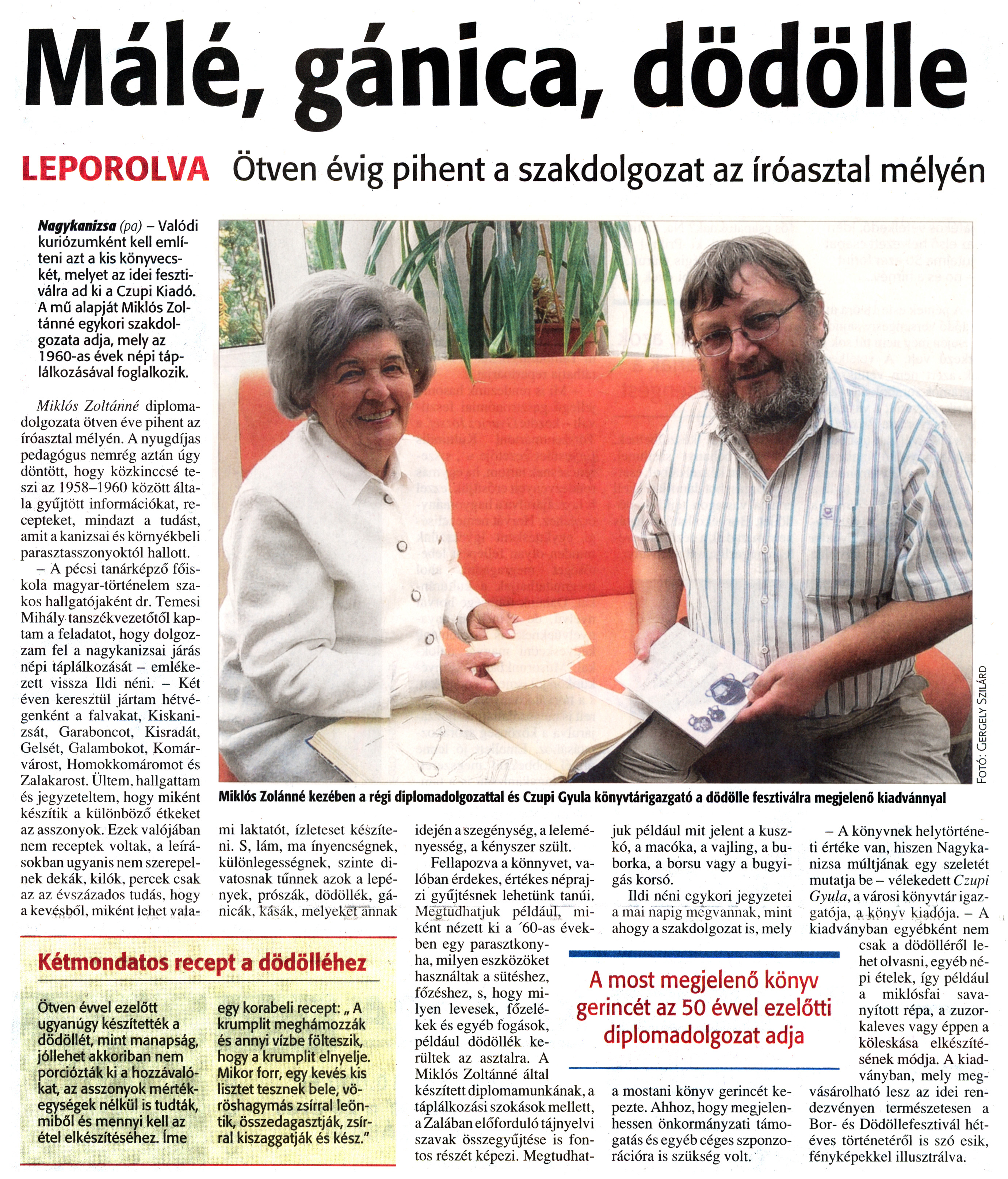 Nyilvános 1081 | 1474 | Zalai Hírlap 2010. szeptember 2. 204. szám 18. oldal - Málé, gánica, dödölle | A cikk szövege: Málé, gánica, dödölle LEPOROLVA Ötven évig pihent a szakdolgozat az íróasztal mélyén Nagykanizsa (pá) - Valódi kuriózumként kell említeni azt a kis könyvecskét, melyet az idei fesztiválra ad ki a Czupi Kiadó. A mű alapját Miklós Zoltánné egykori szakdolgozata adja, mely az 1960-as évek népi táplálkozásával foglalkozik. Miklós Zoltánné diplomadolgozata ötven éve pihent az íróasztal mélyén. A nyugdíjas pedagógus nemrég aztán úgy döntött, hogy közkinccsé teszi az 1958-1960 között általa gyűjtött információkat, recepteket, mindazt a tudást, amit a kanizsai és környékbeli parasztasszonyoktól hallott. - A pécsi tanárképző főiskola magyar-történelem szakos hallgatójaként dr. Temesi Mihály tanszékvezetőtől kaptam a feladatot, hogy dolgozzam fel a nagykanizsai járás népi táplálkozását - emlékezett vissza Ildi néni. - Két éven keresztül jártam hétvégenként a falvakat, Kiskanizsát, Garaboncot, Kisradát, Gelsét, Galambokot, Komár-várost, Homokkomáromot és Zalakarost. Ültem, hallgattam és jegyzeteltem, hogy miként készítik a különböző étkeket az asszonyok. Ezek valójában nem receptek voltak, a leírásokban ugyanis nem szerepelnek dekák, kilók, percek csak az az évszázados tudás, hogy a kevésből, miként lehet valami laktatót, ízletesét készíteni. S, lám, ma ínyencségnek, különlegességnek, szinte divatosnak tűnnek azok a lepények, prószák, dödöllék, gánicák, kásák, melyeket annak idején a szegénység, a leleményesség, a kényszer szült. Fellapozva a könyvet, valóban érdekes, értékes néprajzi gyűjtésnek lehetünk tanúi. Megtudhatjuk például, miként nézett ki a \'60-as években egy parasztkonyha, milyen eszközöket használtak a sütéshez, főzéshez, s, hogy milyen levesek, főzelékek és egyéb fogások, például dödöllék kerültek az asztalra. A Miklós Zoltánné által készített diplomamunkának, a táplálkozási szokások mellett, a Zalában előforduló tájnyelvi szavak összegyűjtése is fontos részét képezi. Megtudhat- juk például mit jelent a kuszkó, a macóka, a vajling, a buborka, a borsu vagy a bugyigás korsó. Ildi néni egykori jegyzetei a mai napig megvannak, mint ahogy a szakdolgozat is, mely a mostani könyv gerincét képezte. Ahhoz, hogy megjelenhessen önkormányzati támogatás és egyéb céges szponzorációra is szükség volt. - A könyvnek helytörténeti értéke van, hiszen Nagykanizsa múltjának egy szeletét mutatja be - vélekedett Czupi Gyula, a városi könyvtár igazgatója, a könyv kiadója. - A kiadványban egyébként nem csak a dödölléről lehet olvasni, egyéb népi ételek, így például a miklósfai savanyított répa, a zuzorkaleves vagy éppen a köleskása elkészítésének módja. A kiadványban, mely megvásárolható lesz az idei rendezvényen természetesen a Bor- és Dödöllefesztivál hétéves történetéről is szó esik, fényképekkel illusztrálva. Miklós Zolánné kezében a régi diplomadolgozattal és Czupi Gyula könyvtárigazgató a dödölle fesztiválra megjelenő kiadvánnyal Kétmondatos recept a dödölléhez Ötven évvel ezelőtt ugyanúgy készítették a dödöllét, mint manapság, jóllehet akkoriban nem porciózták ki a hozzávalókat, az asszonyok mértékegységek nélkül is tudták, miből és mennyi kell az étel elkészítéséhez. íme egy korabeli recept: „ A krumplit meghámozzák és annyi vízbe fölteszik, hogy a krumplit elnyelje. Mikor forr, egy kevés kis lisztet tesznek bele, vöröshagymás zsírral leöntik, összedagasztják, zsírral kiszaggatják és kész." A most megjelenő könyv gerincét az 50 évvel ezelőtti diplomadolgozat adja |